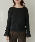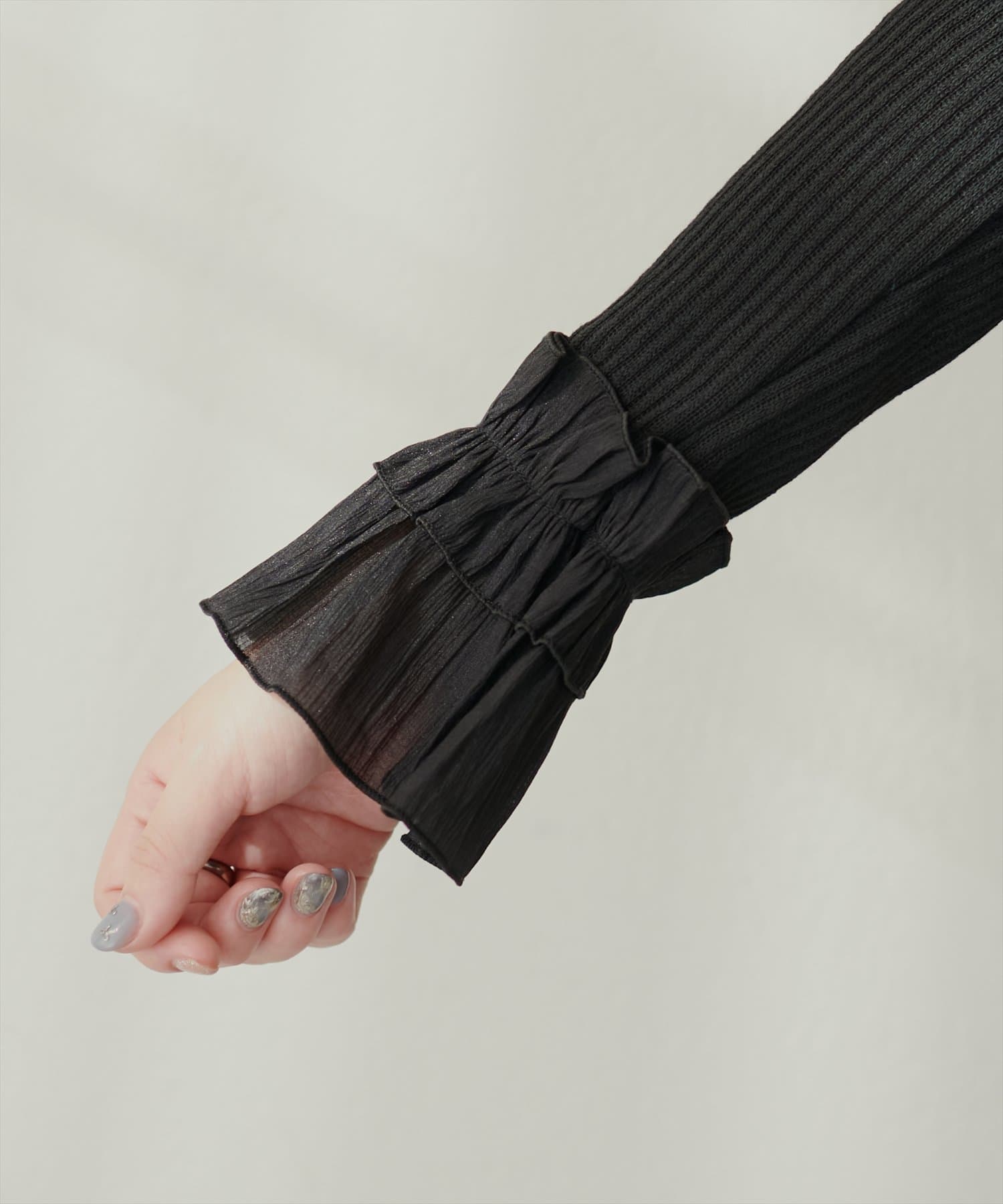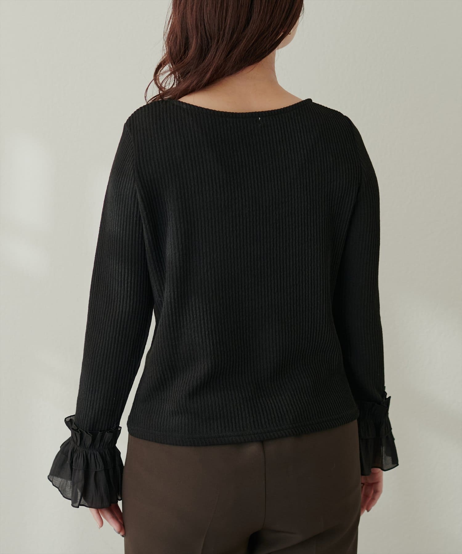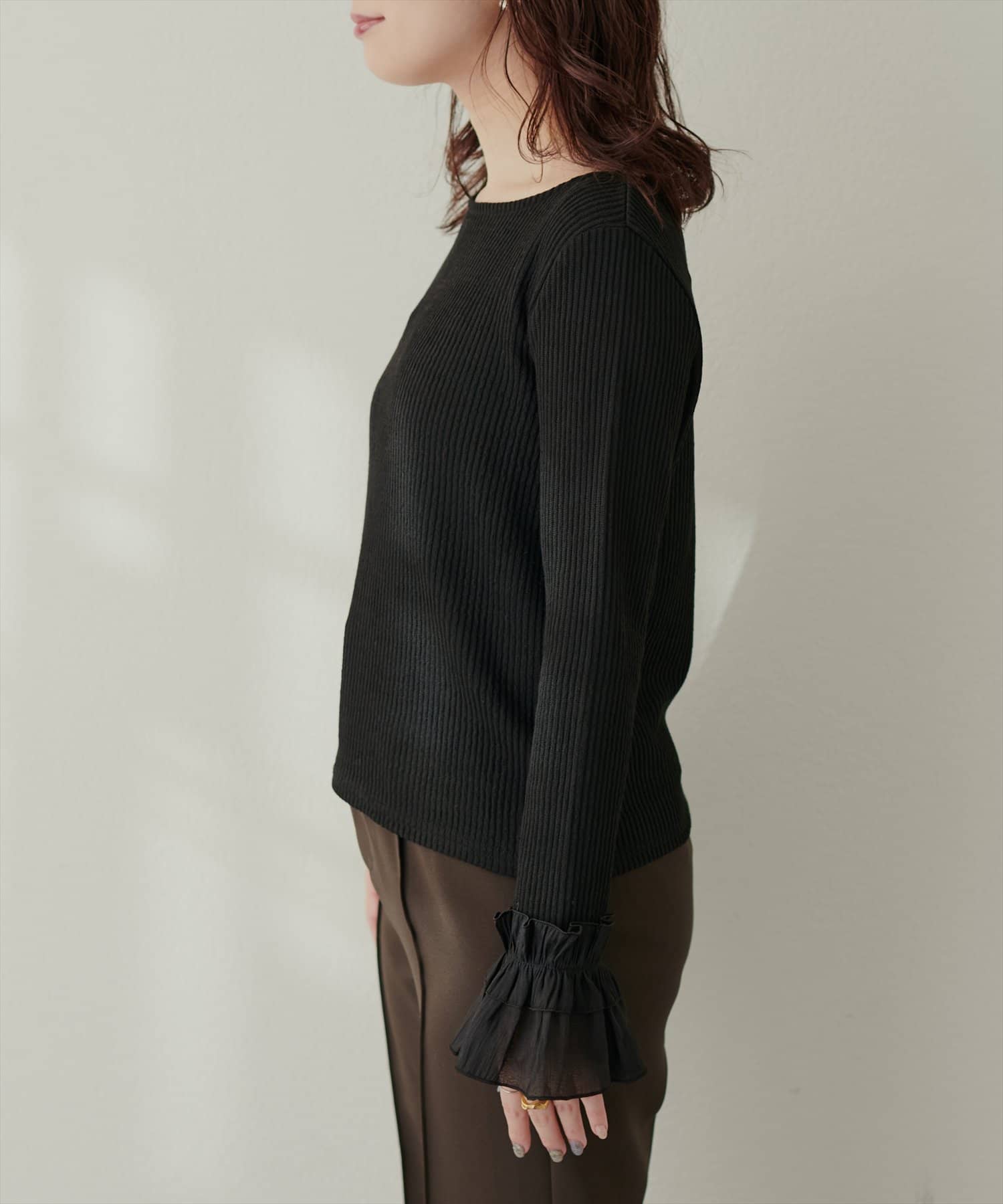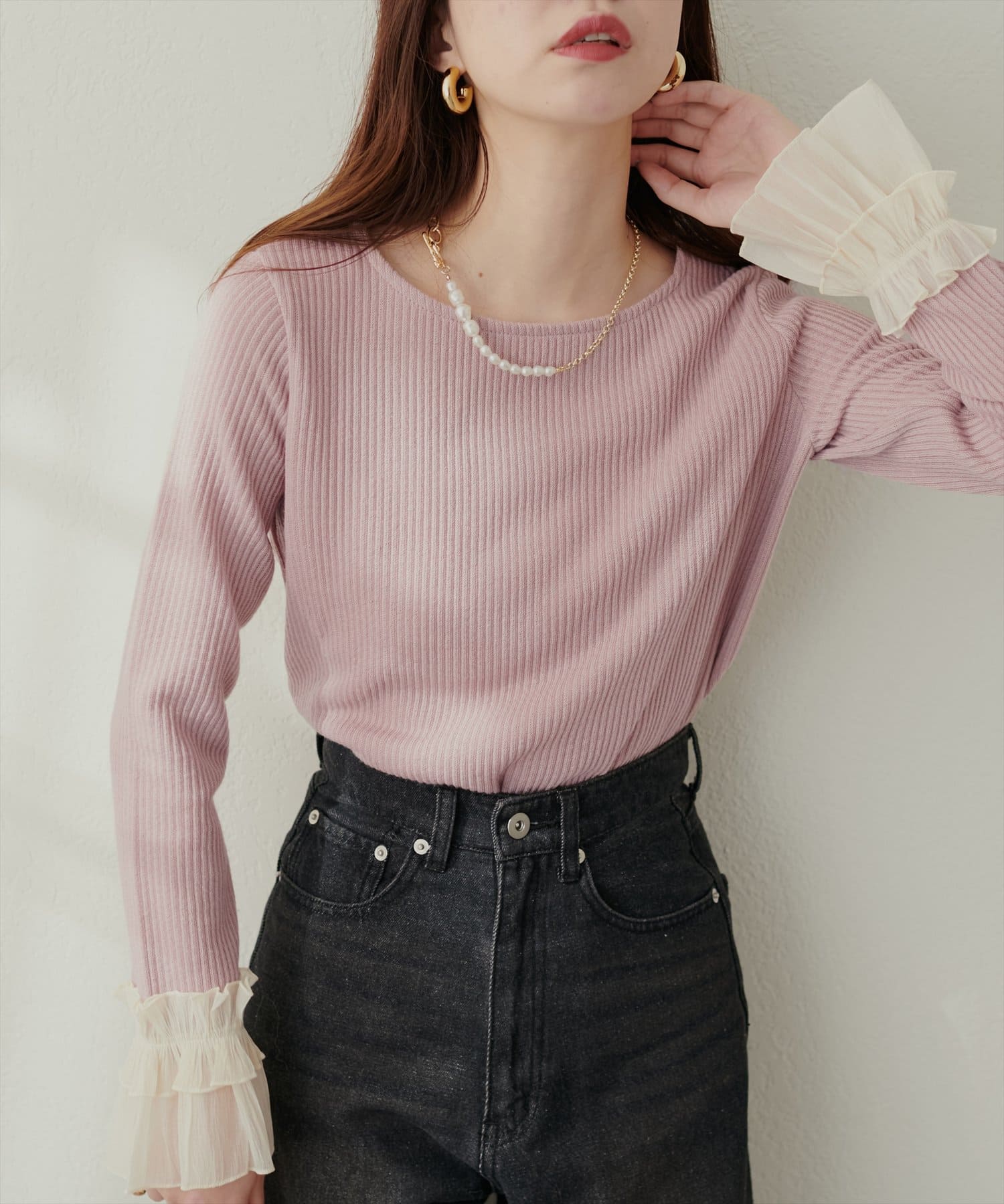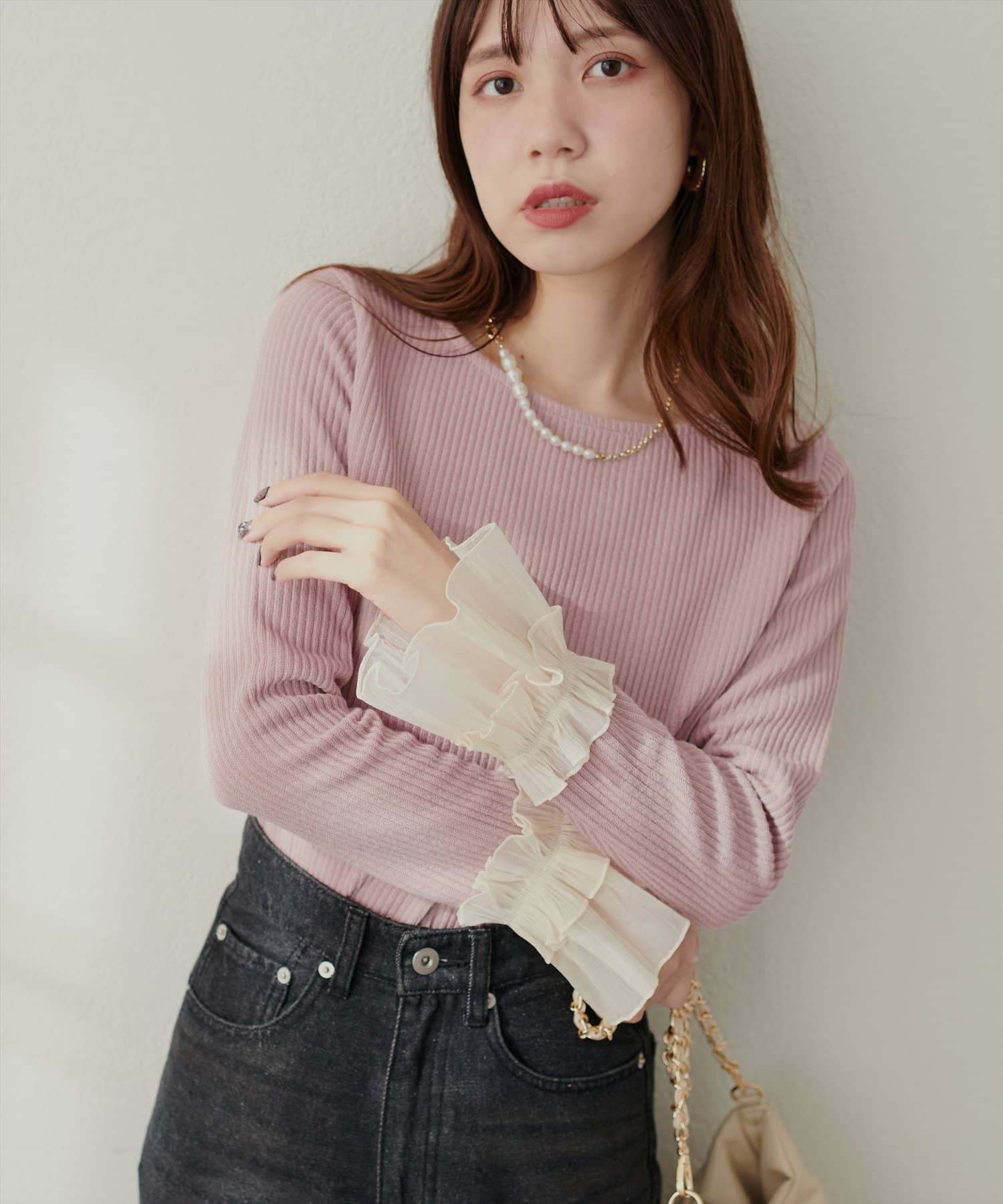 コーディネートを選ばないシンプルなリブニットに袖口のフリルでフェミニンな雰囲気に。