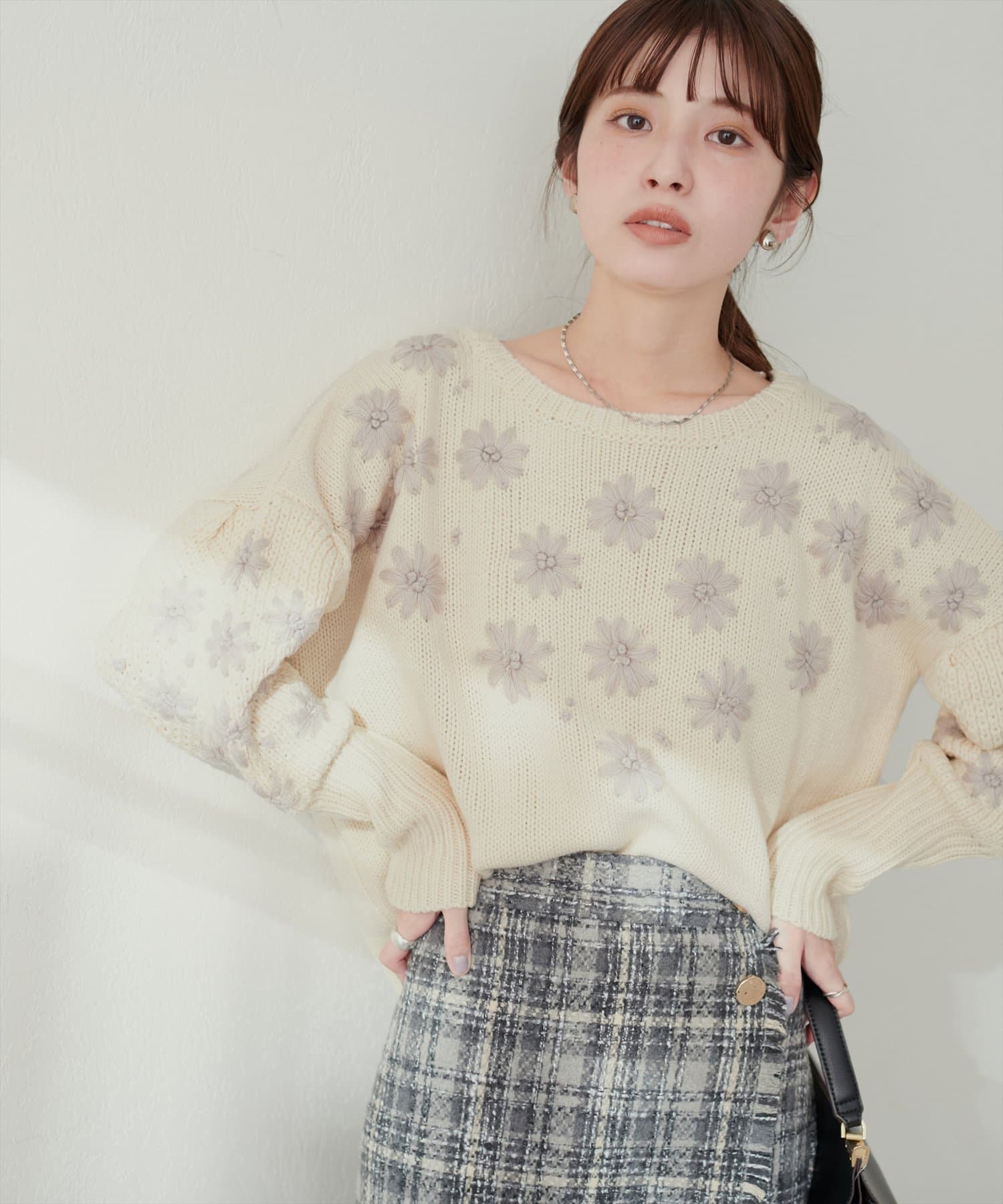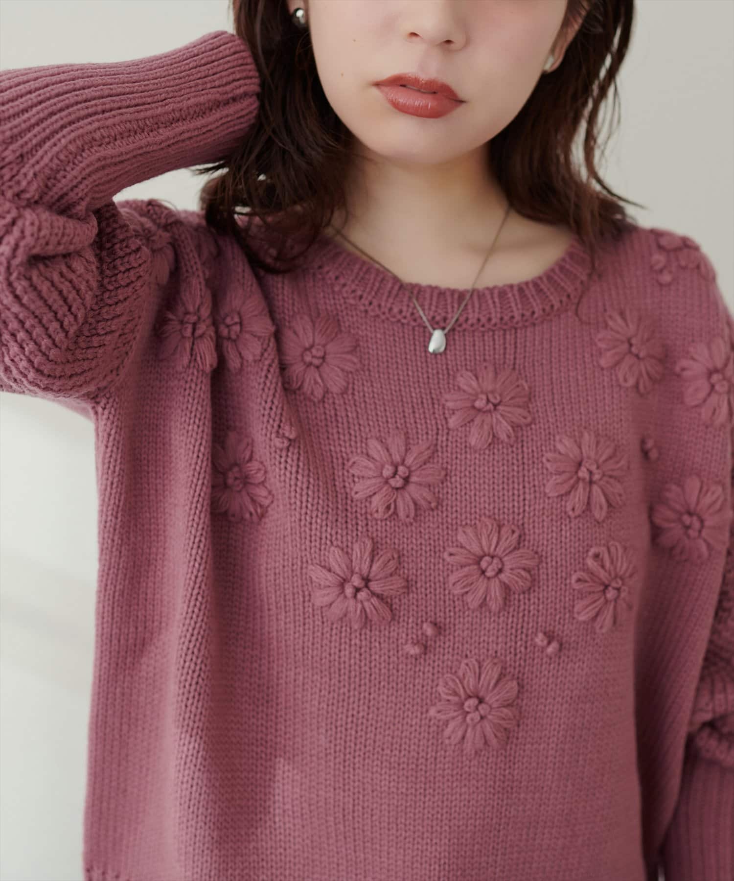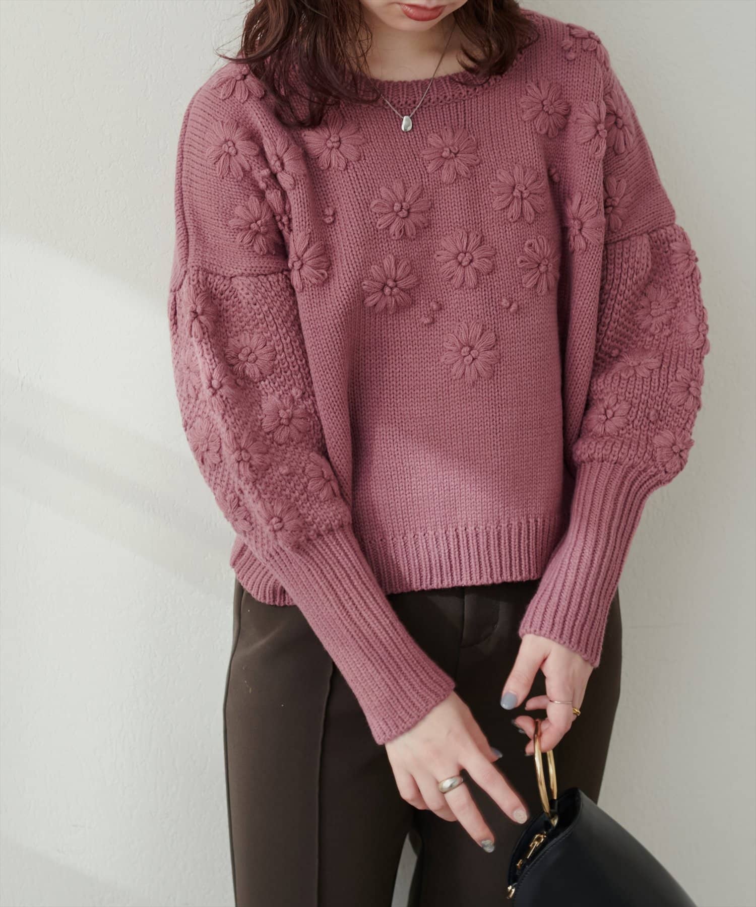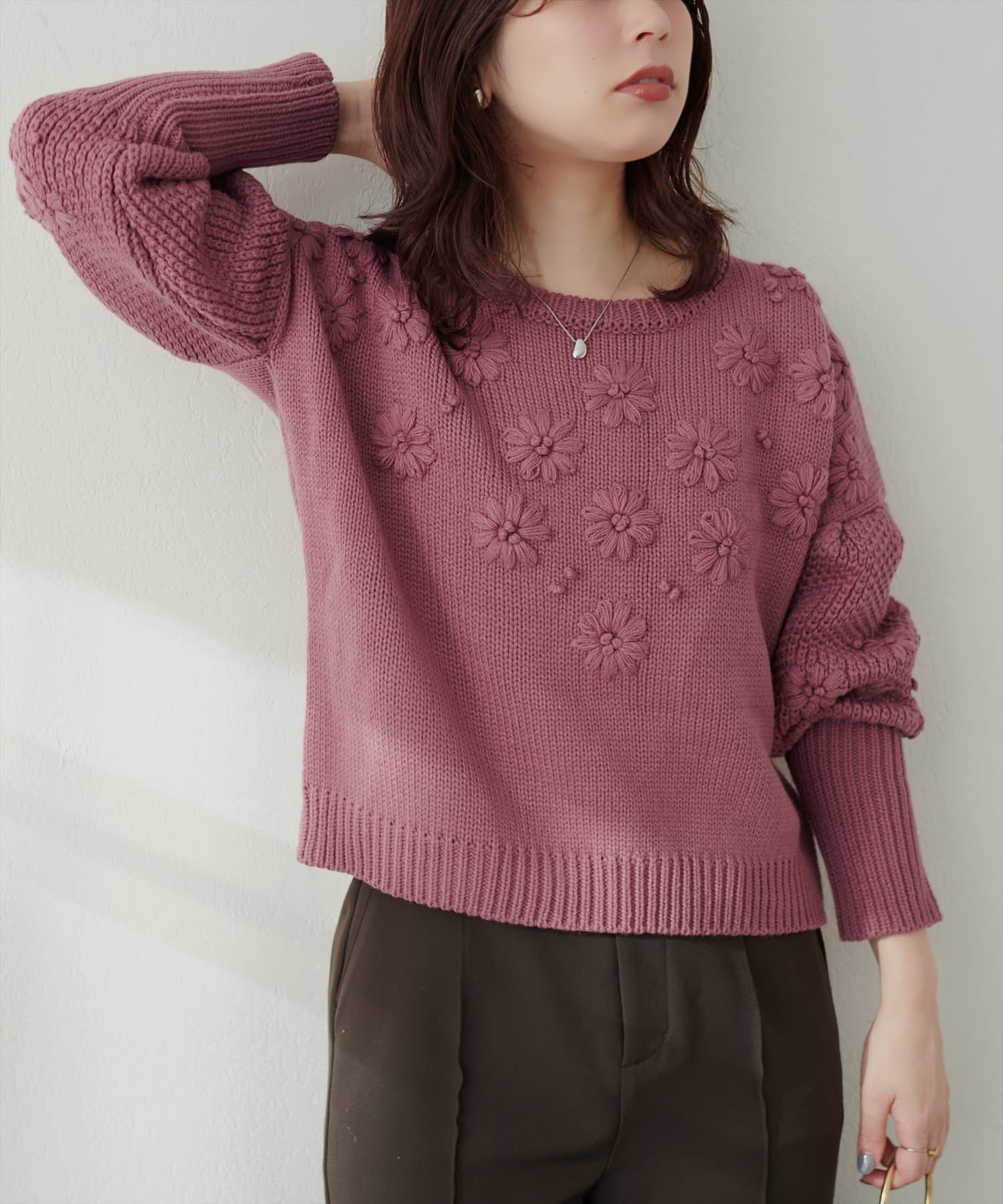シルエットのニットに配色が可愛いお花を刺繍したニット。(ピンクは同色になります。)