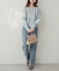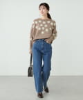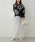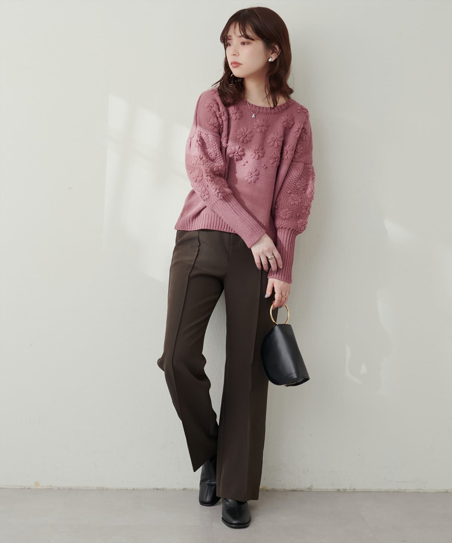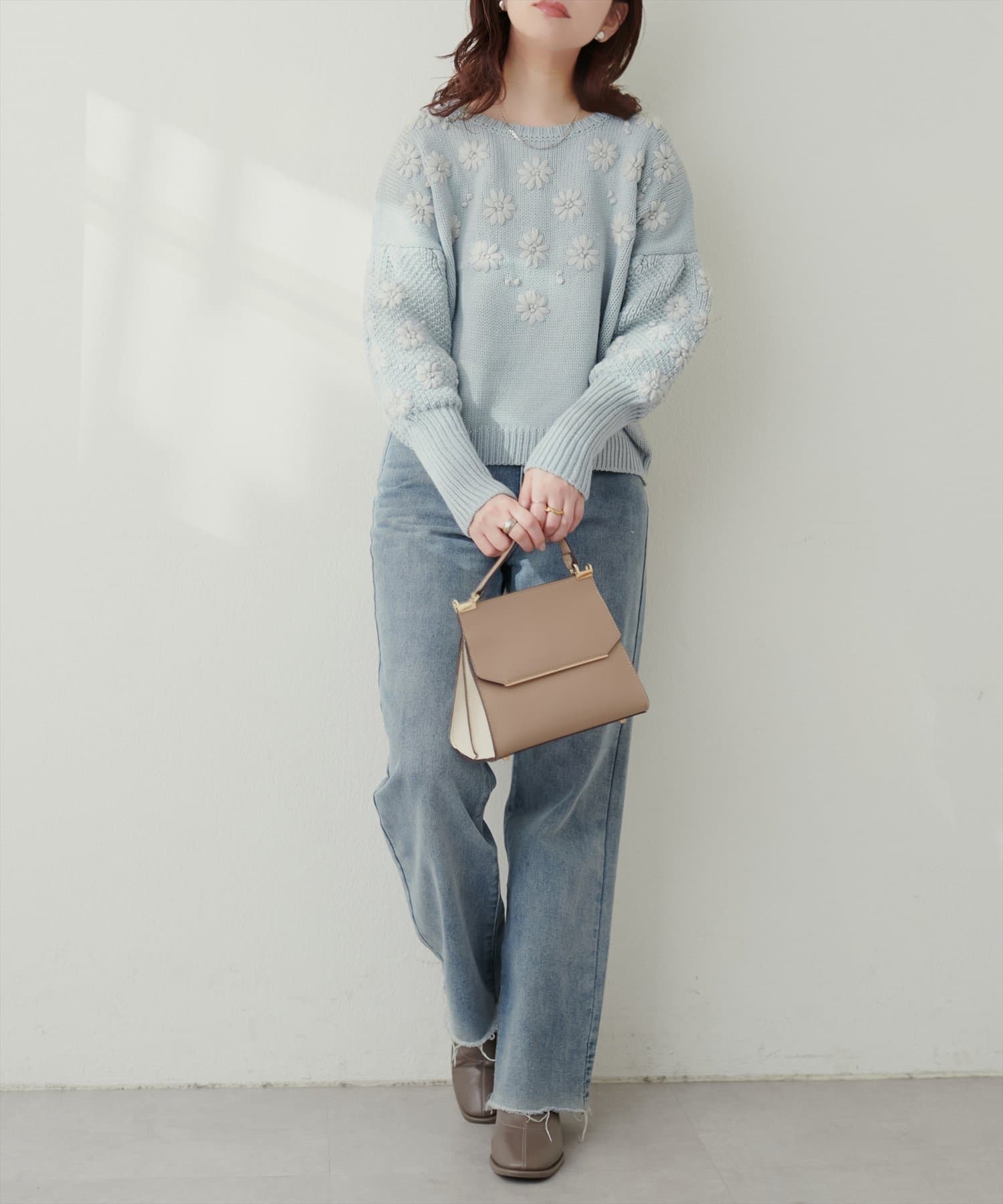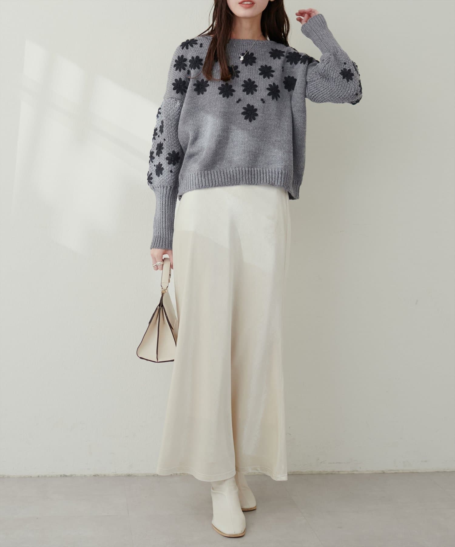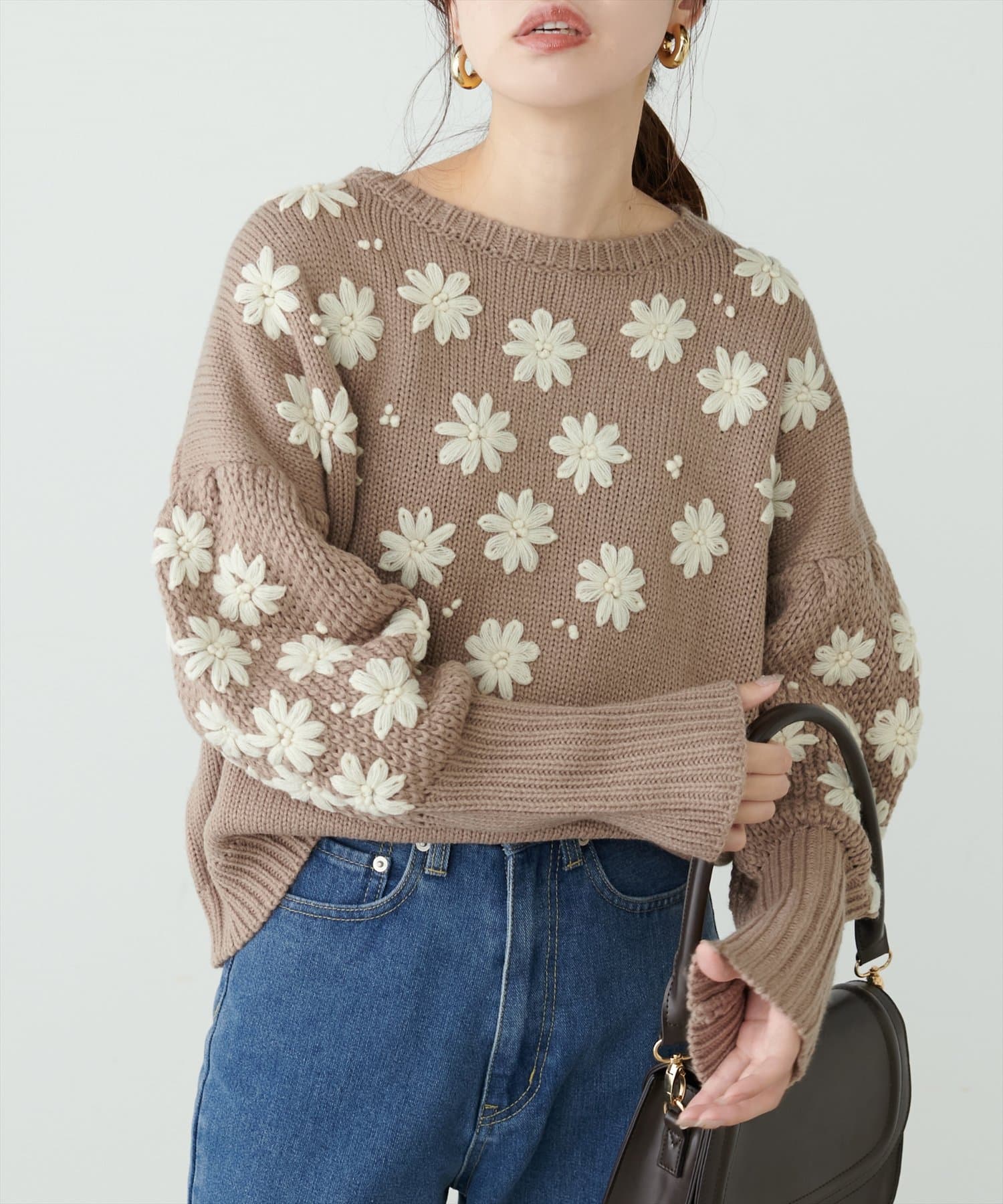 シルエットのニットに配色が可愛いお花を刺繍したニット。(ピンクは同色になります。)