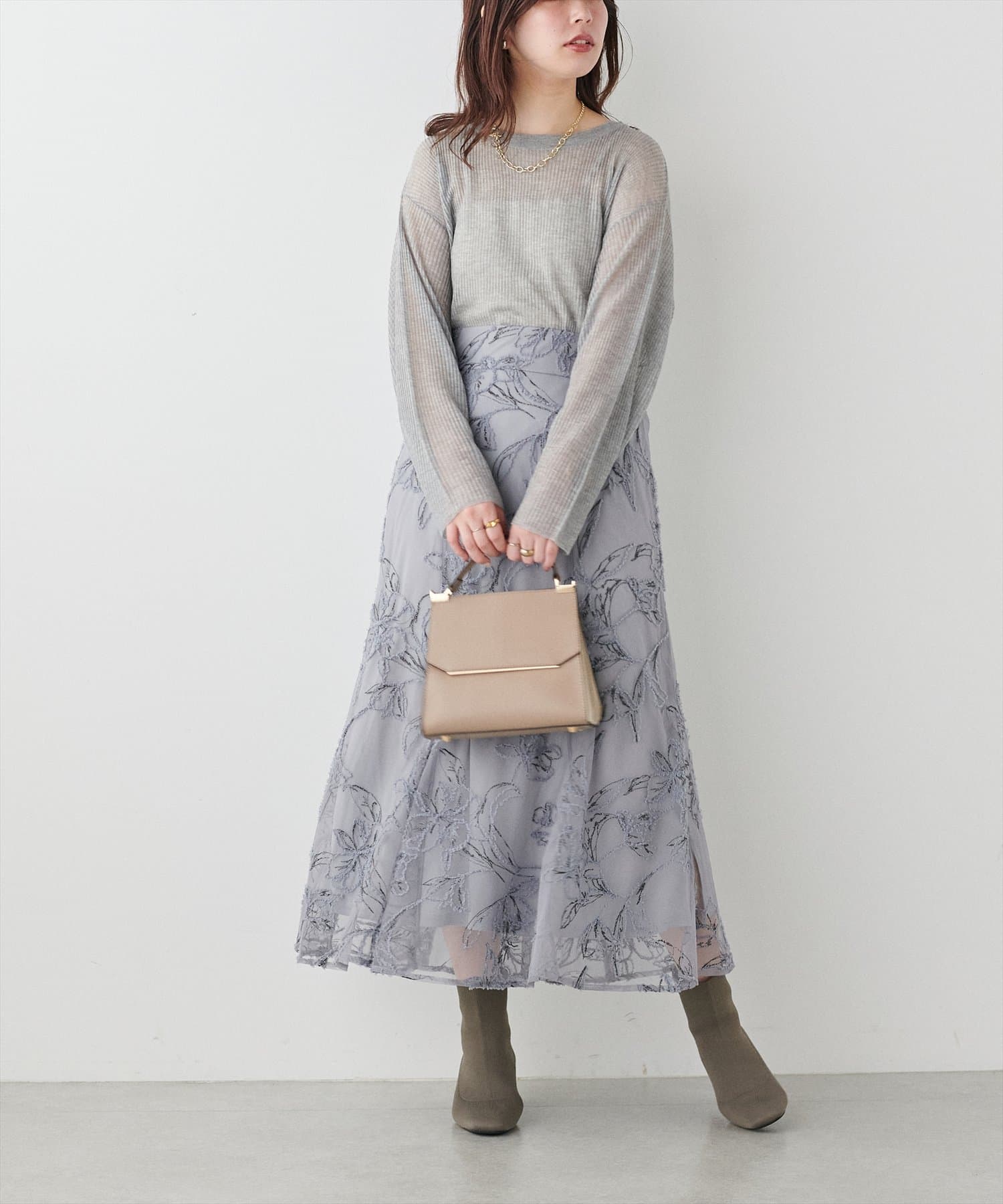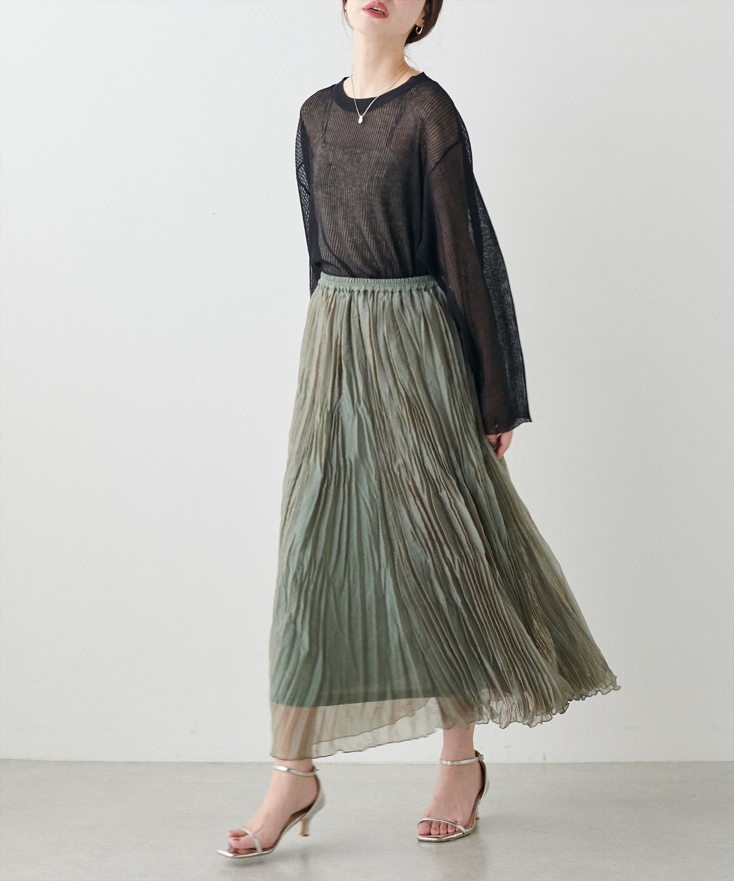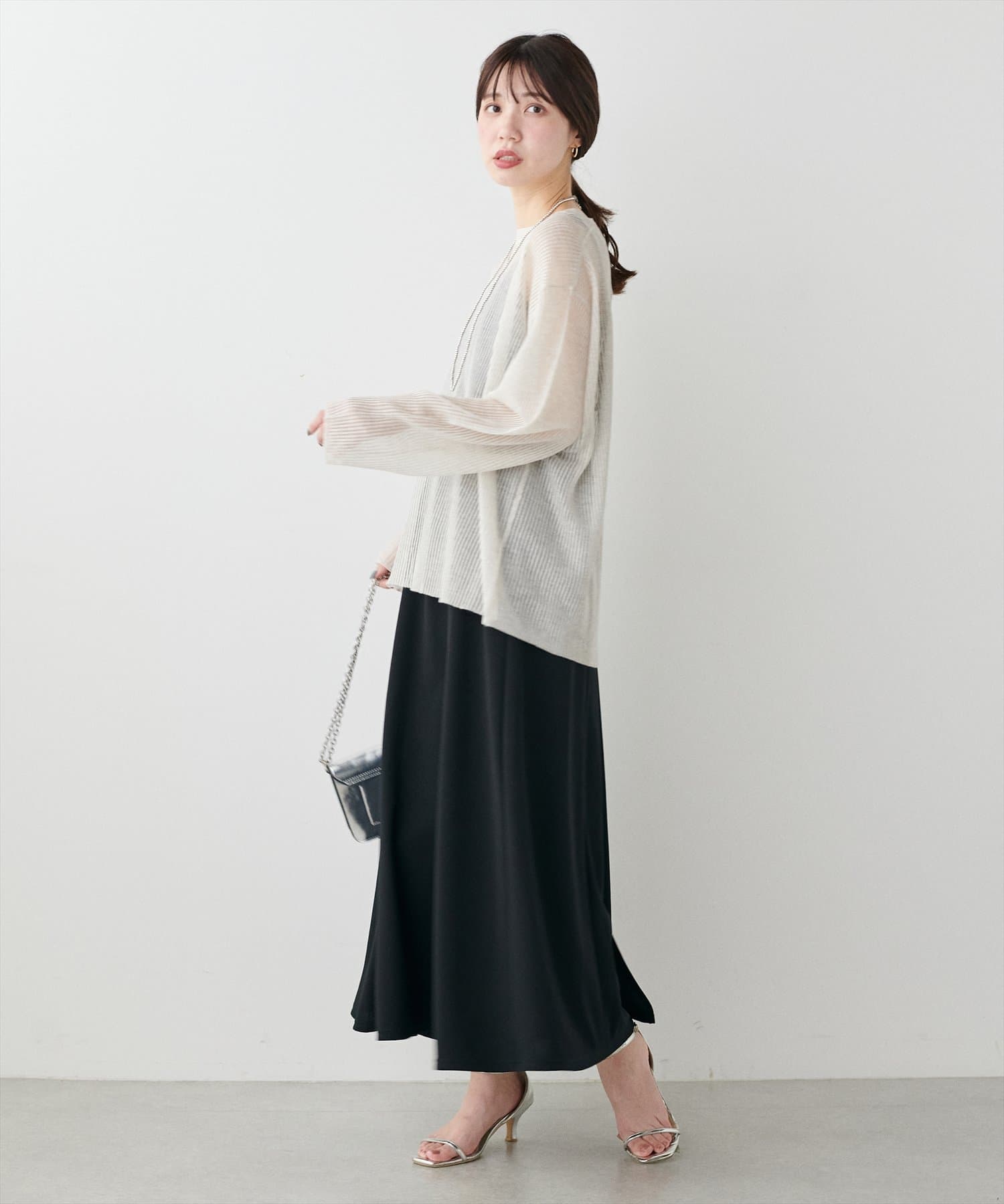 しっかり長めの着丈ですが、程良いシアー感で着るだけでコーディネートに抜け感が生まれます。