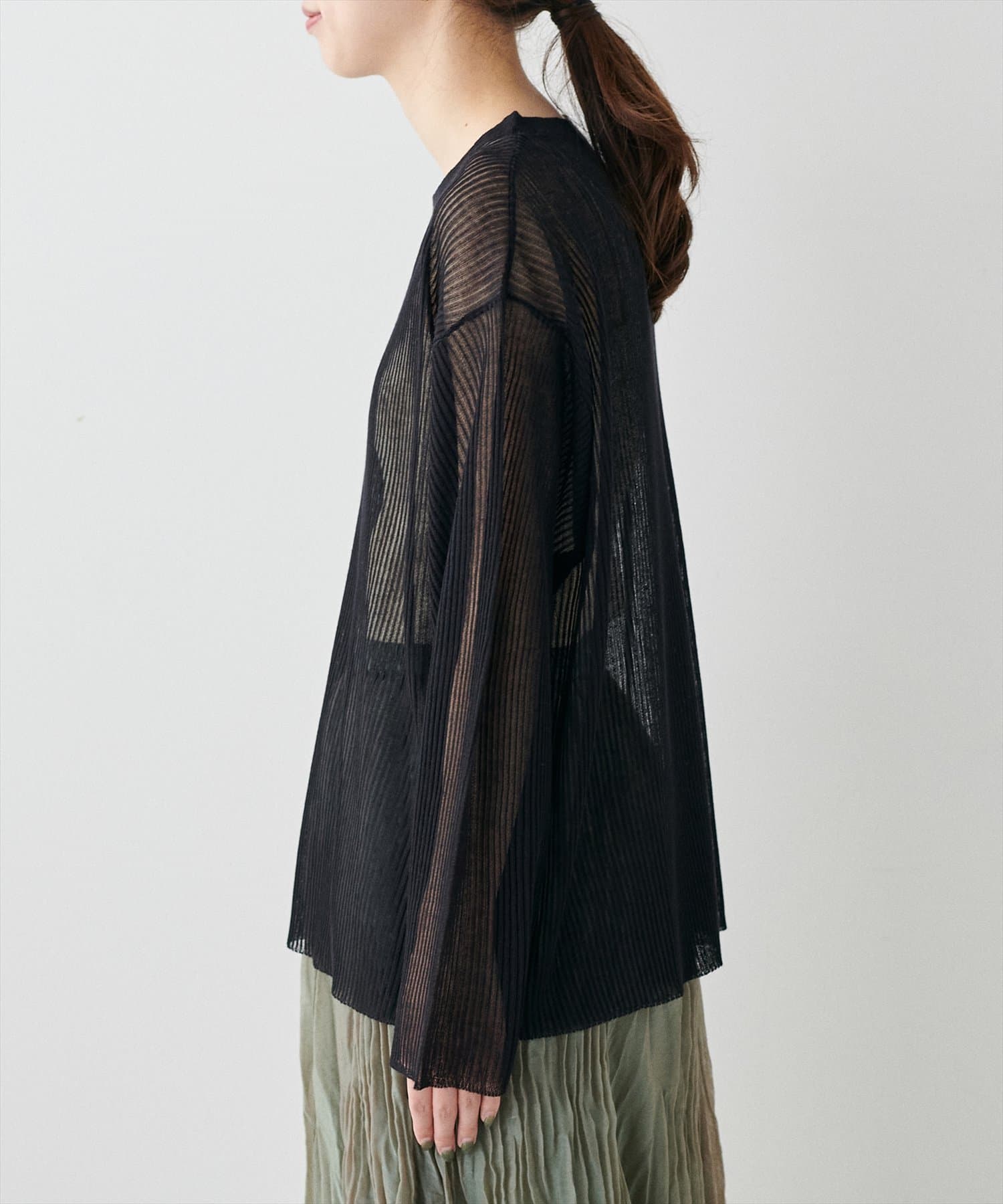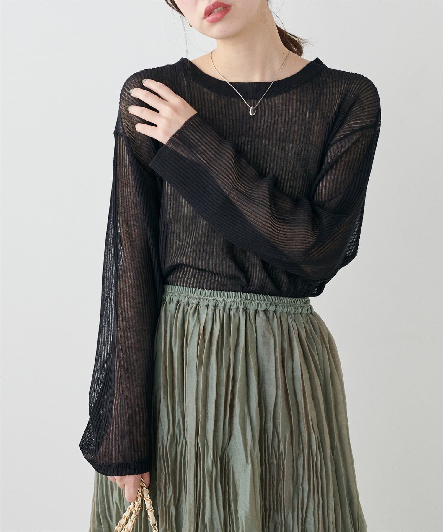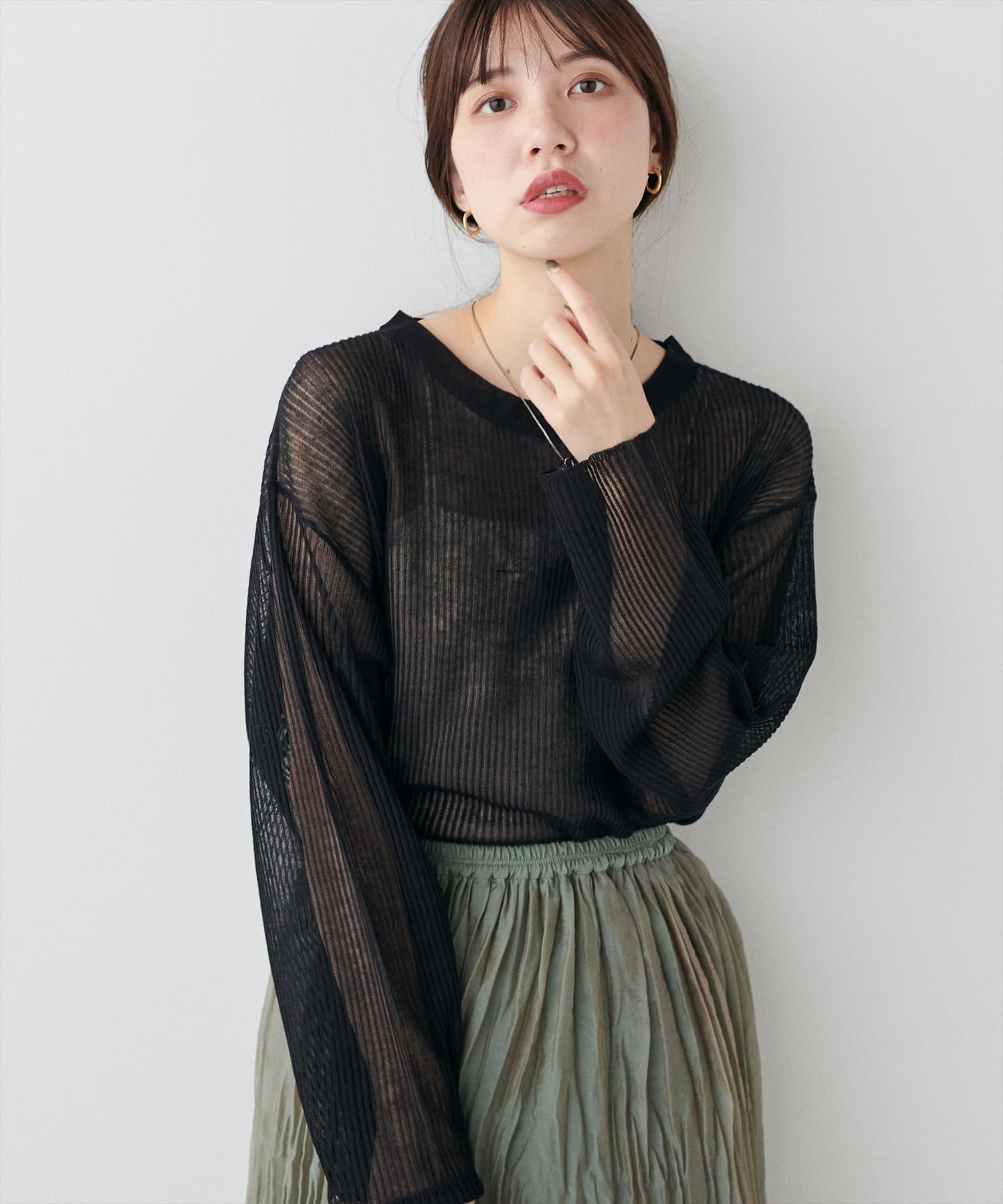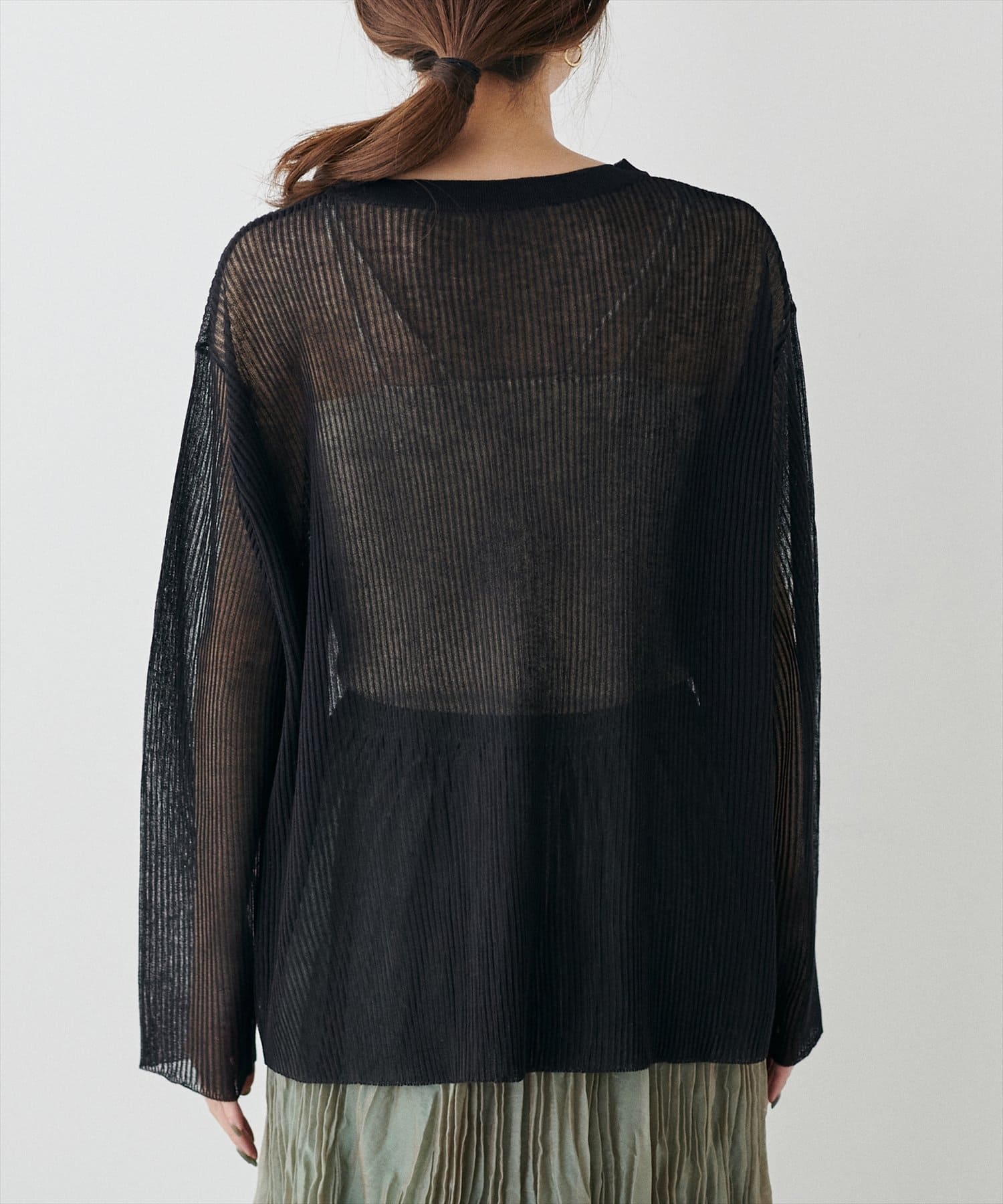 ほんのり肌の透けるシアー感が大人の女性らしさを引き立たせるリブ編みニット。