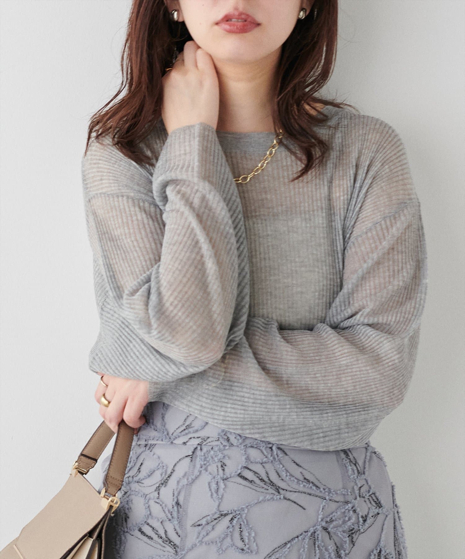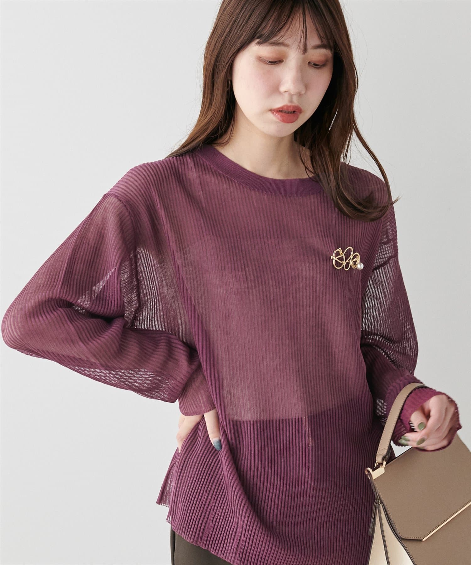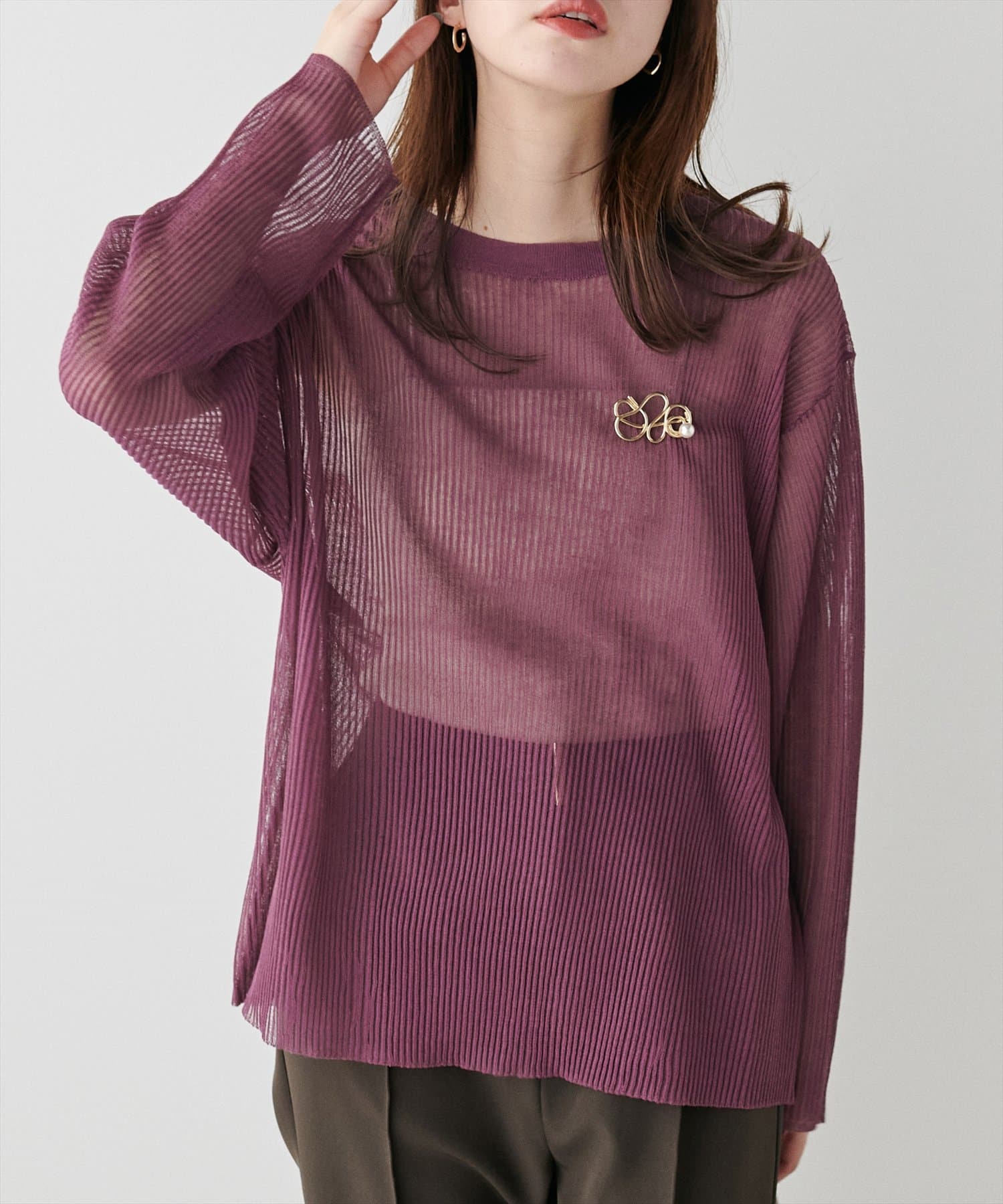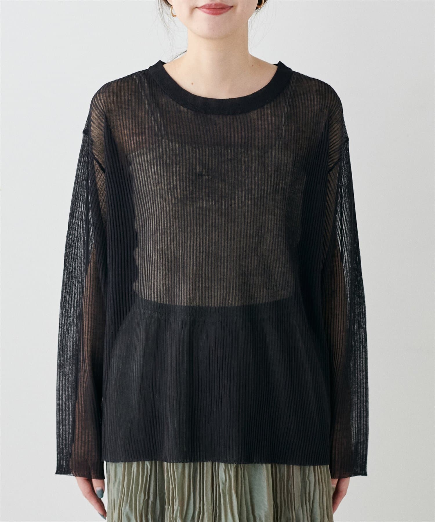 ほんのり肌の透けるシアー感が大人の女性らしさを引き立たせるリブ編みニット。
