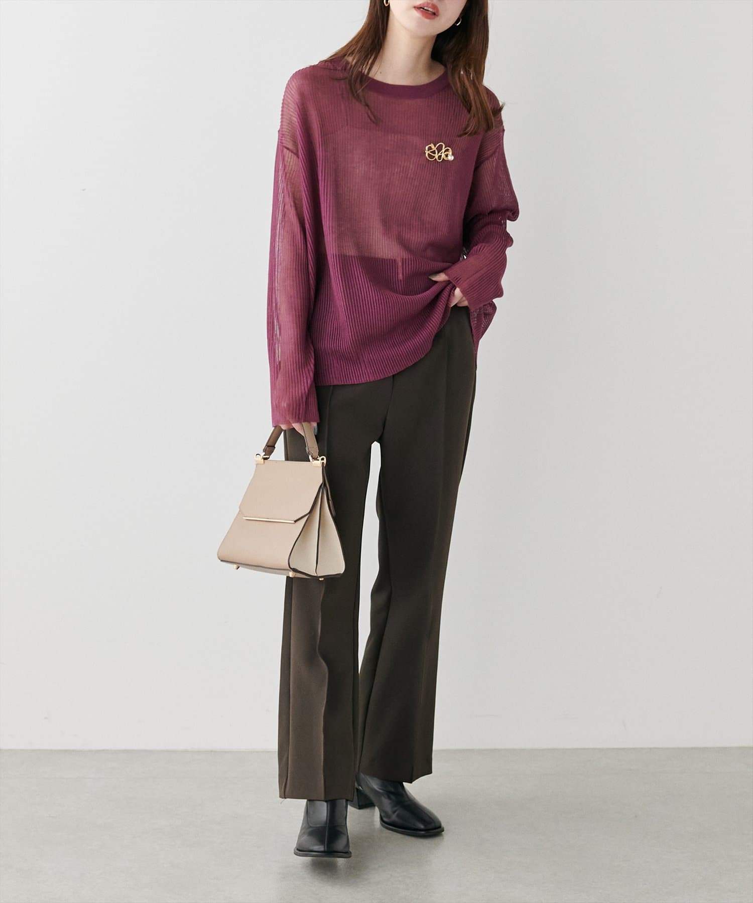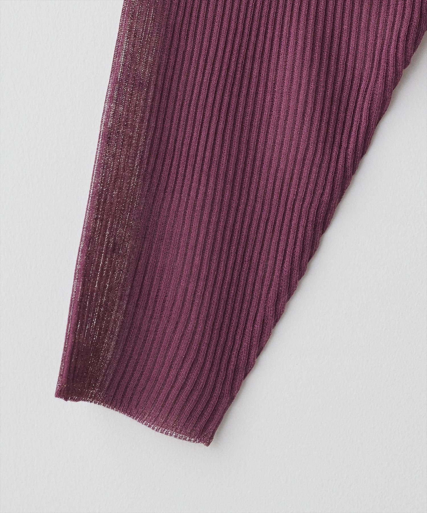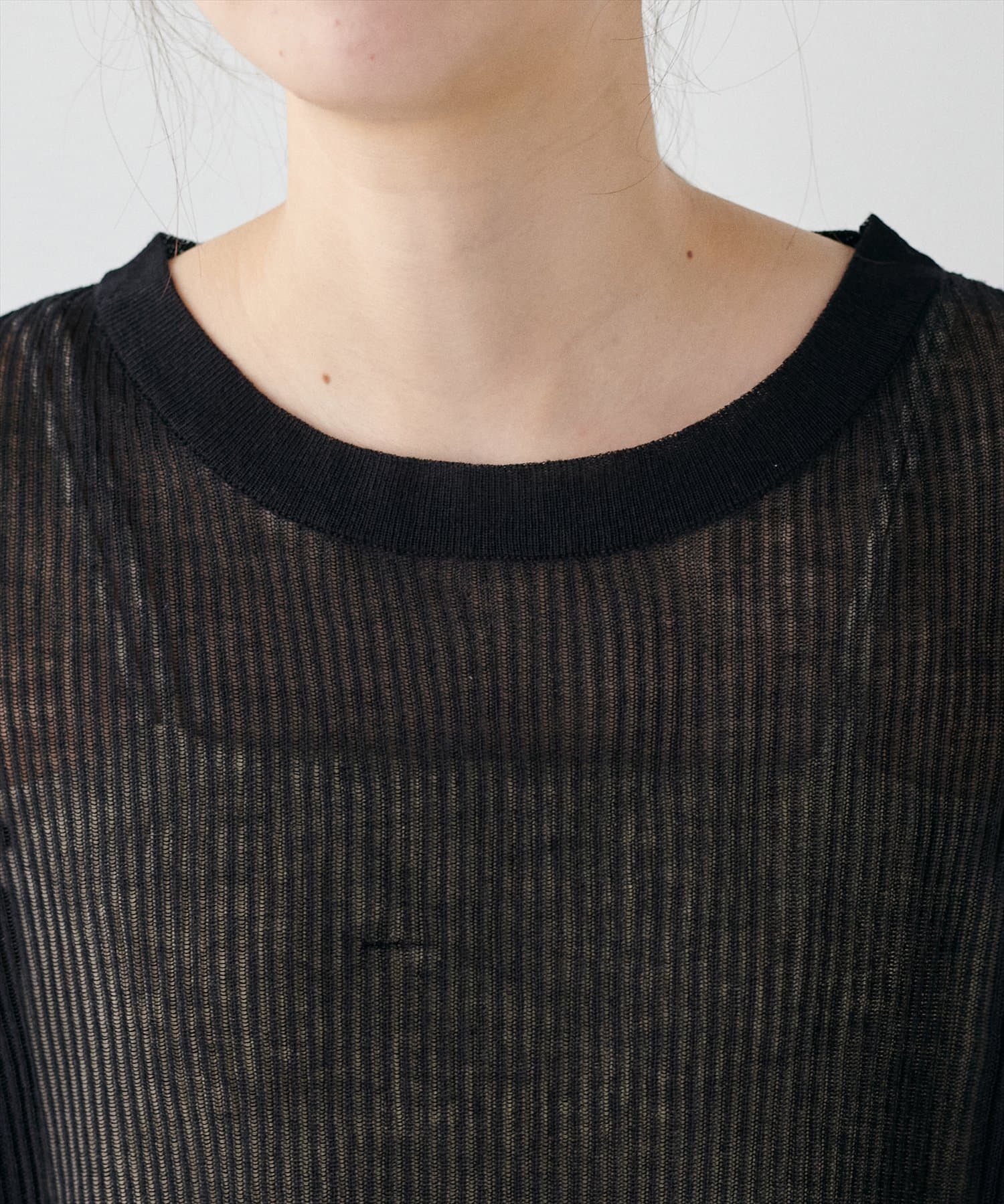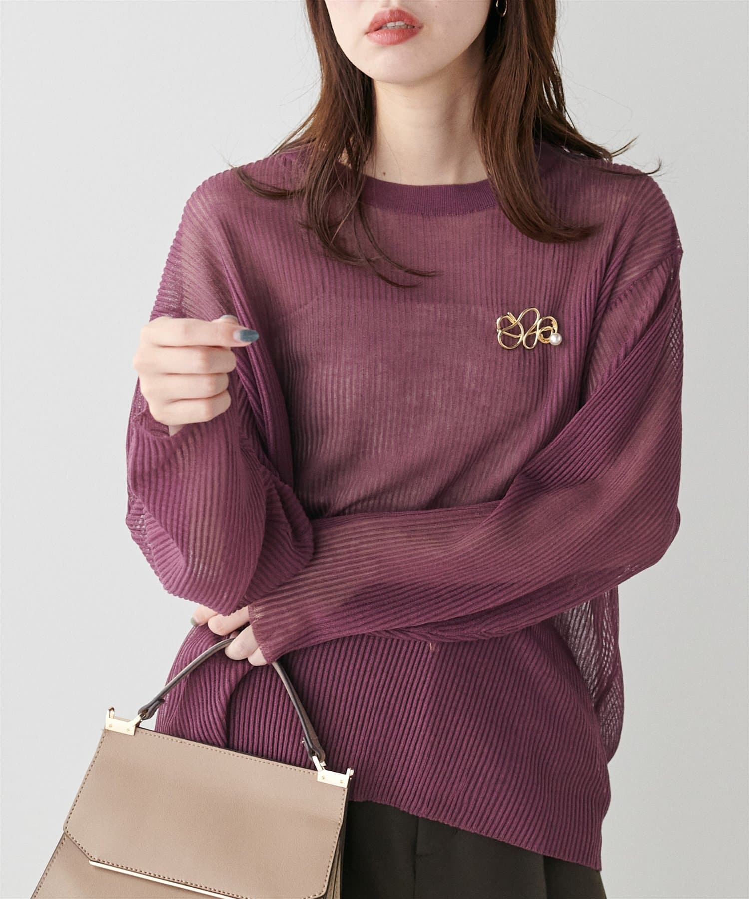 ほんのり肌の透けるシアー感が大人の女性らしさを引き立たせるリブ編みニット。