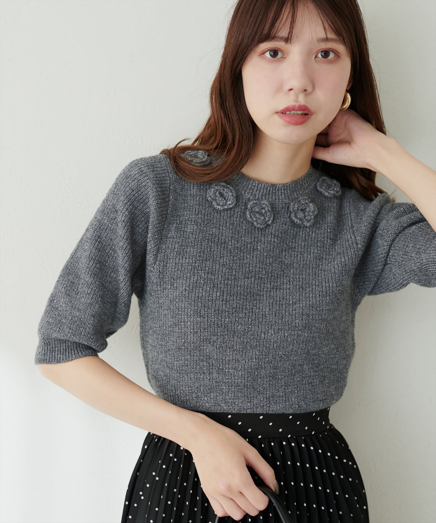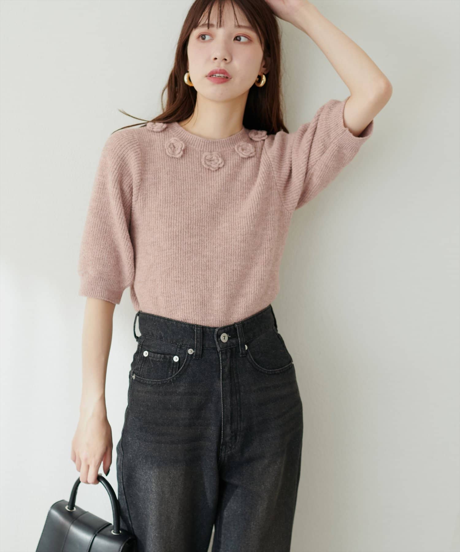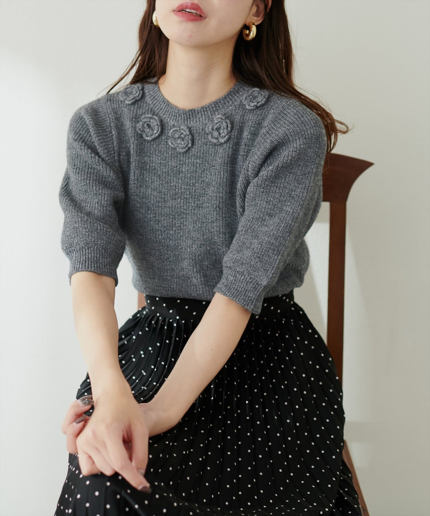 首元のお花と袖のディテールでポイントを効かせたこだわりの1枚。