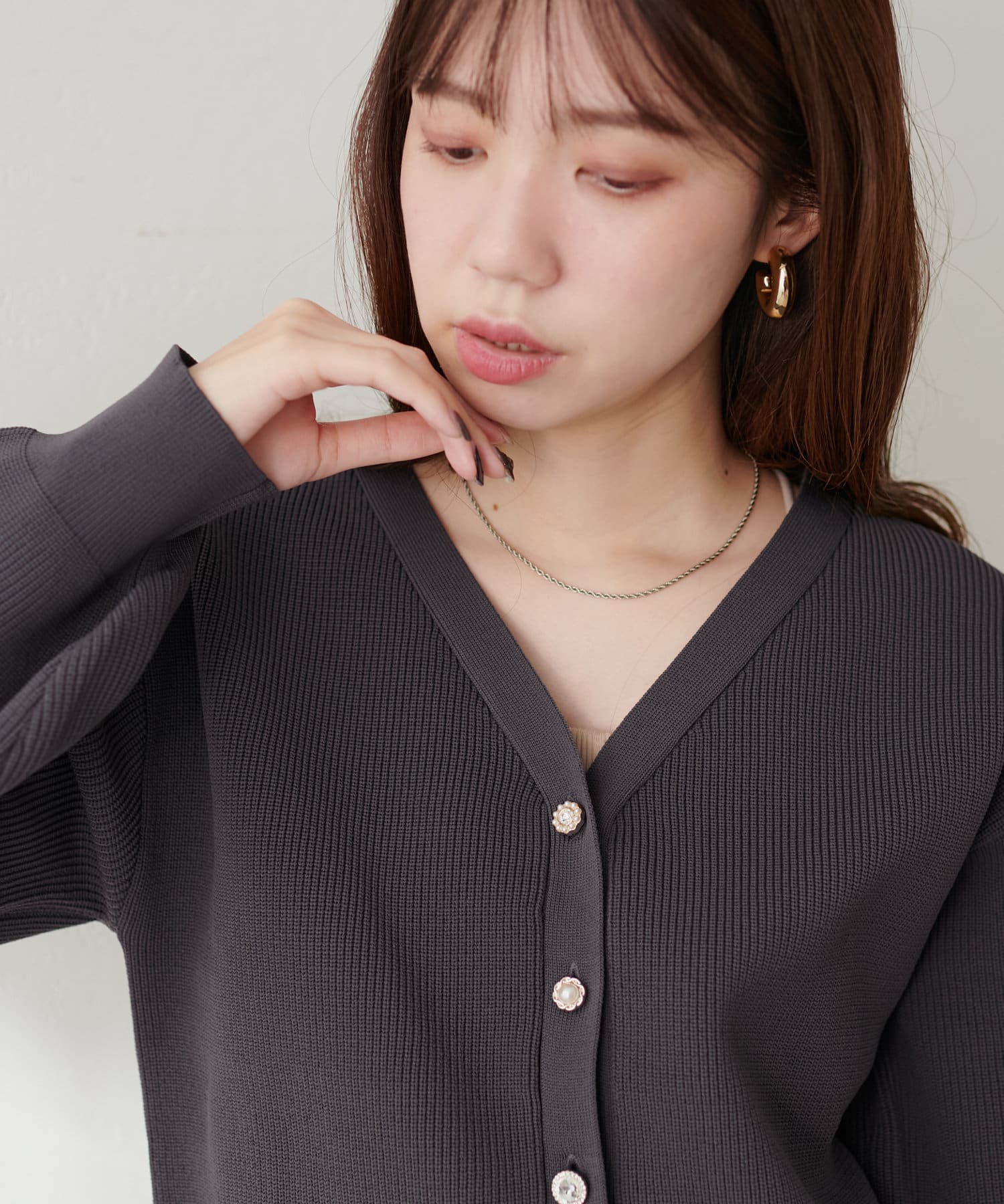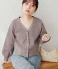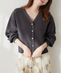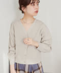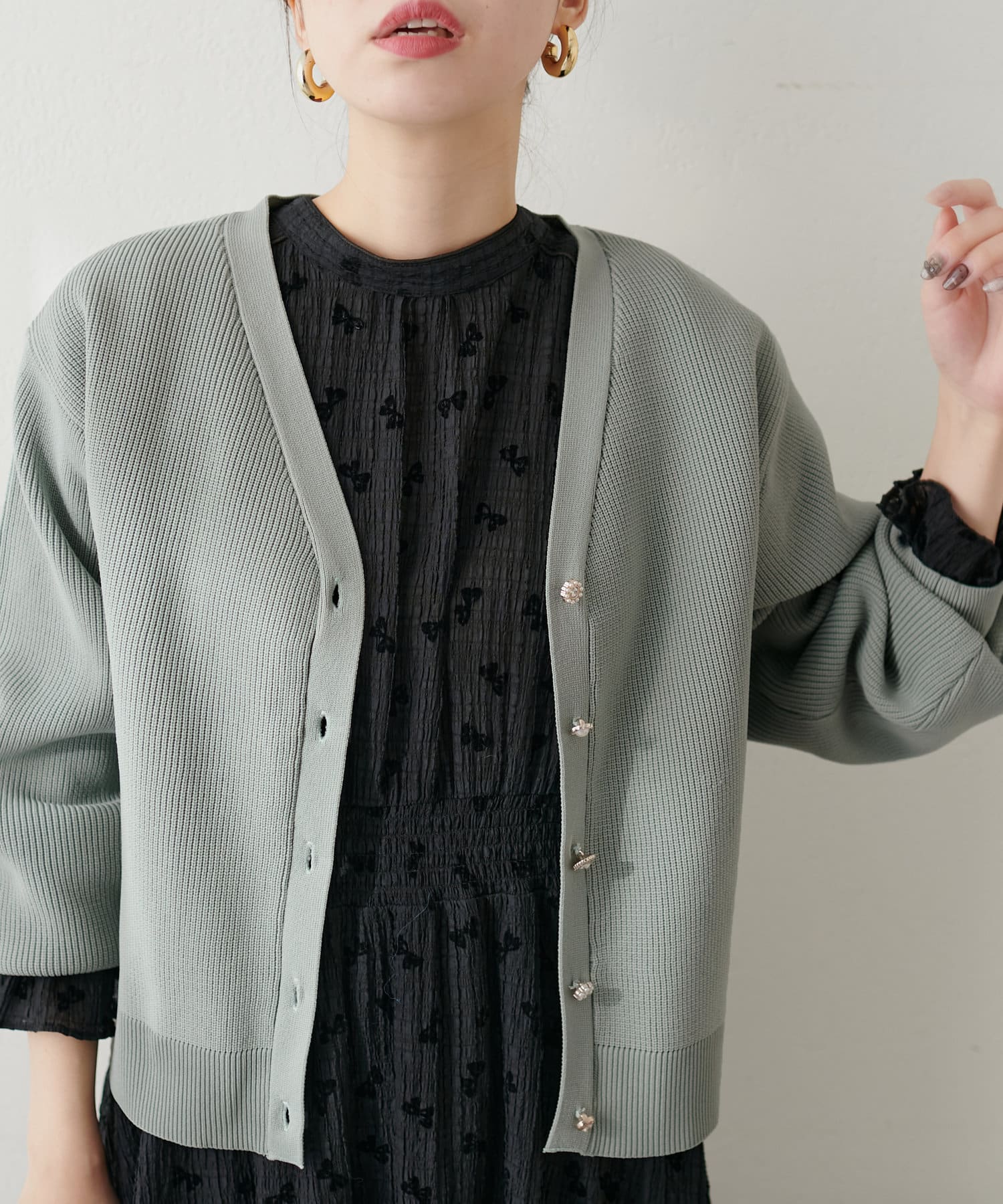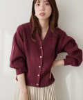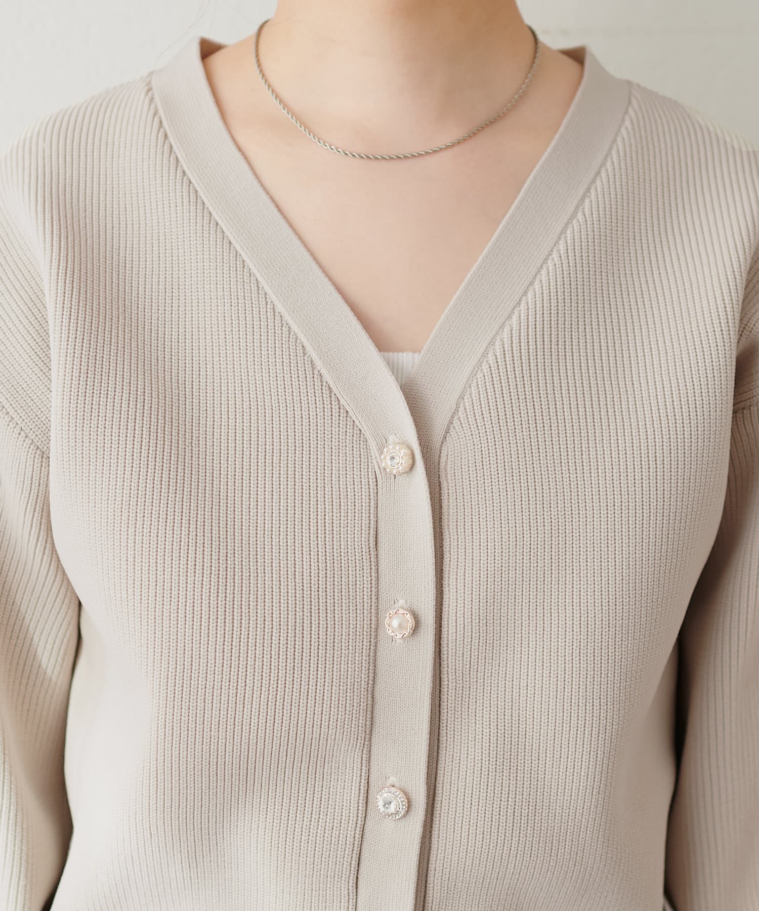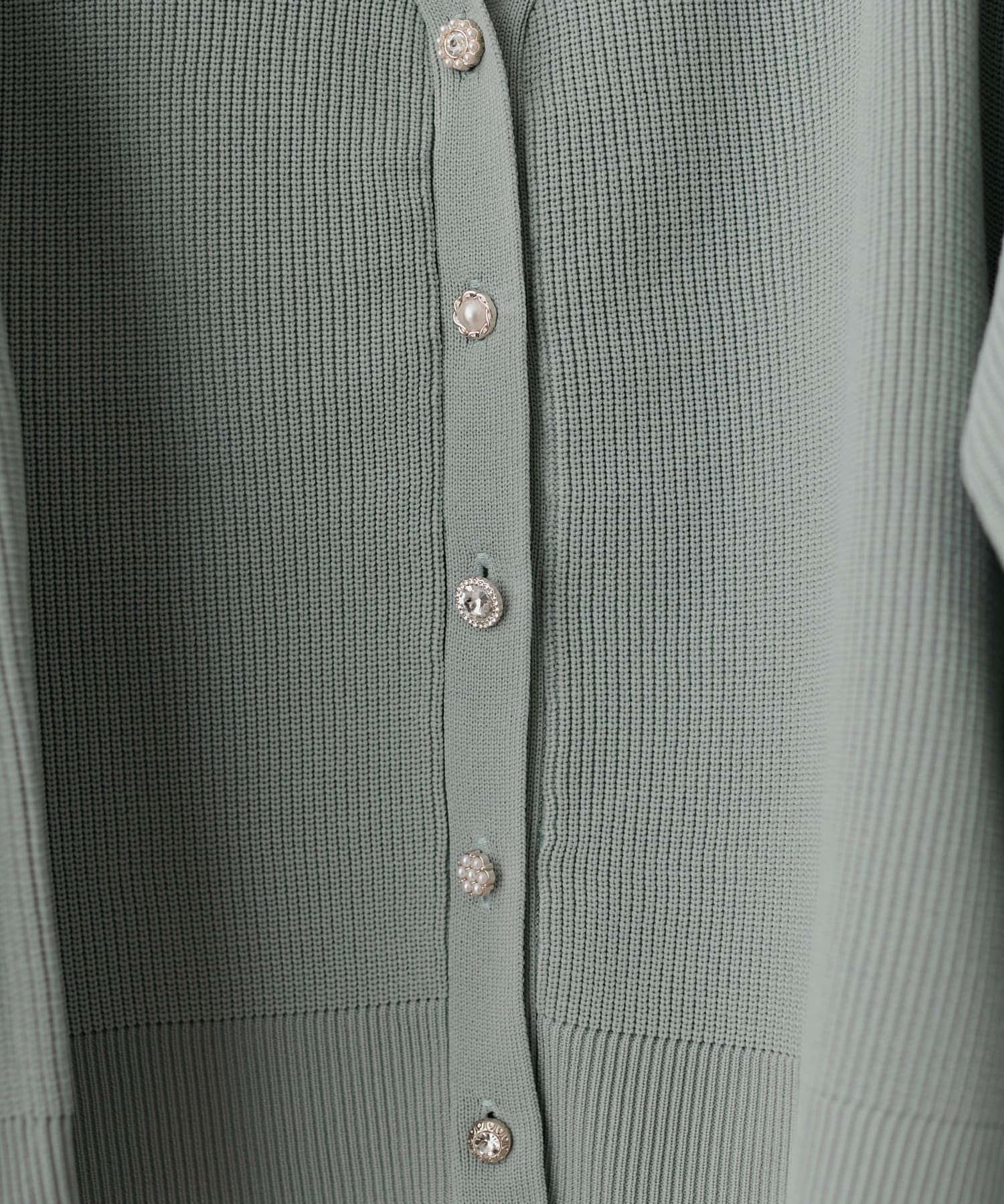 いろいろ釦がポイントのポリニットカーディガン。