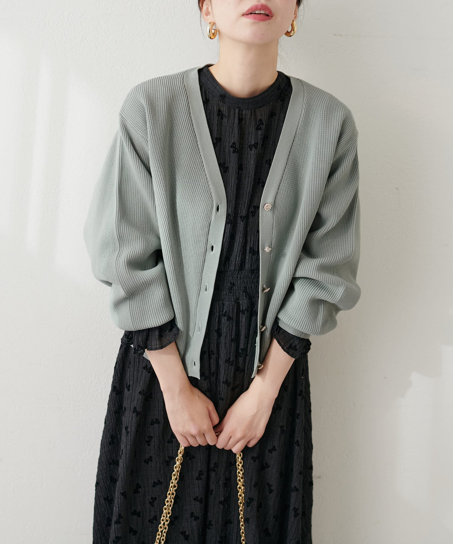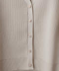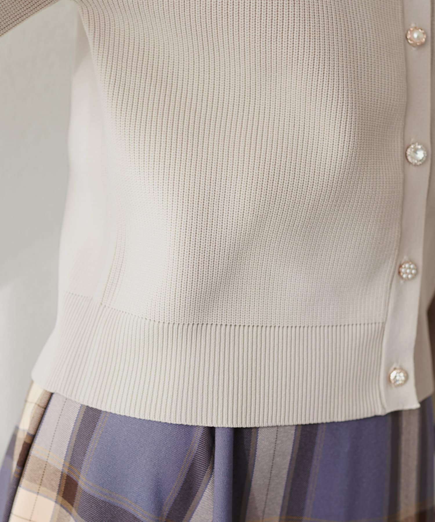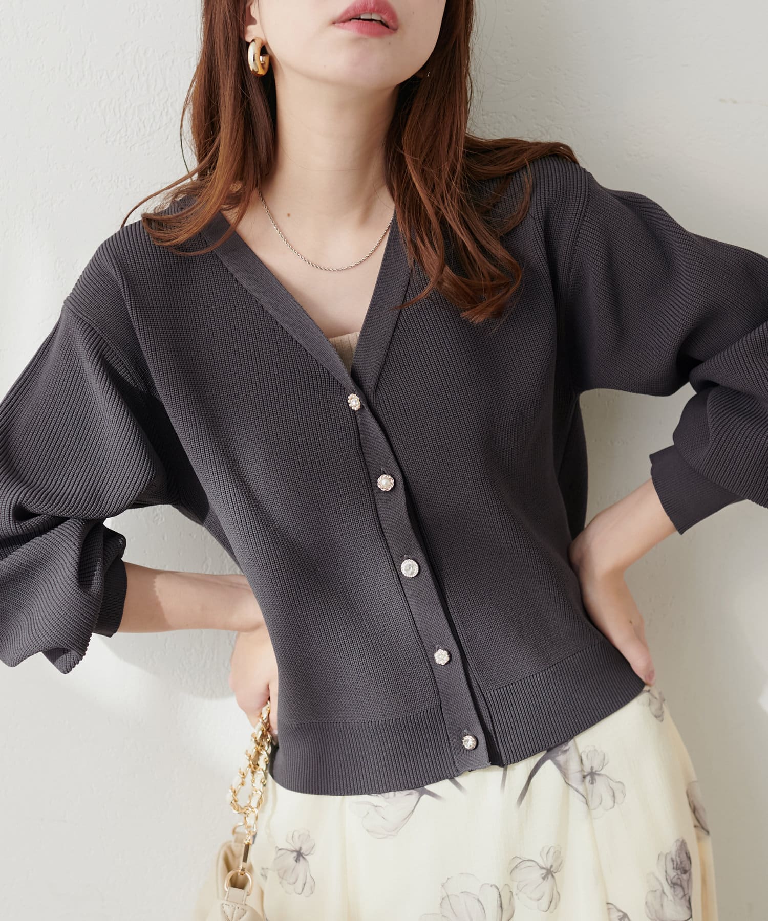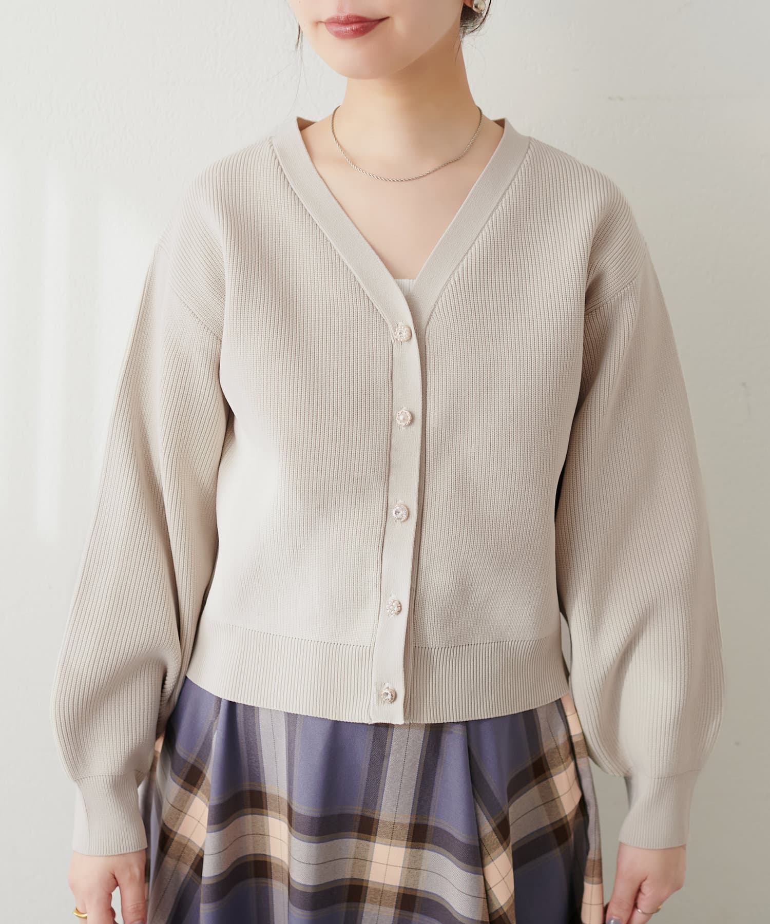 いろいろ釦がポイントのポリニットカーディガン。