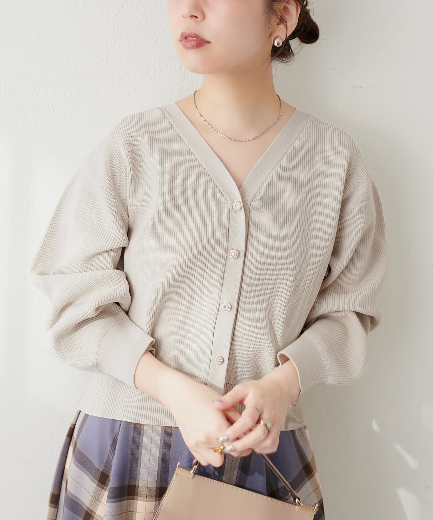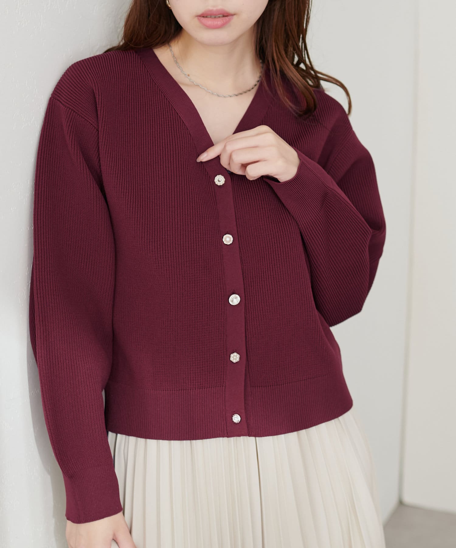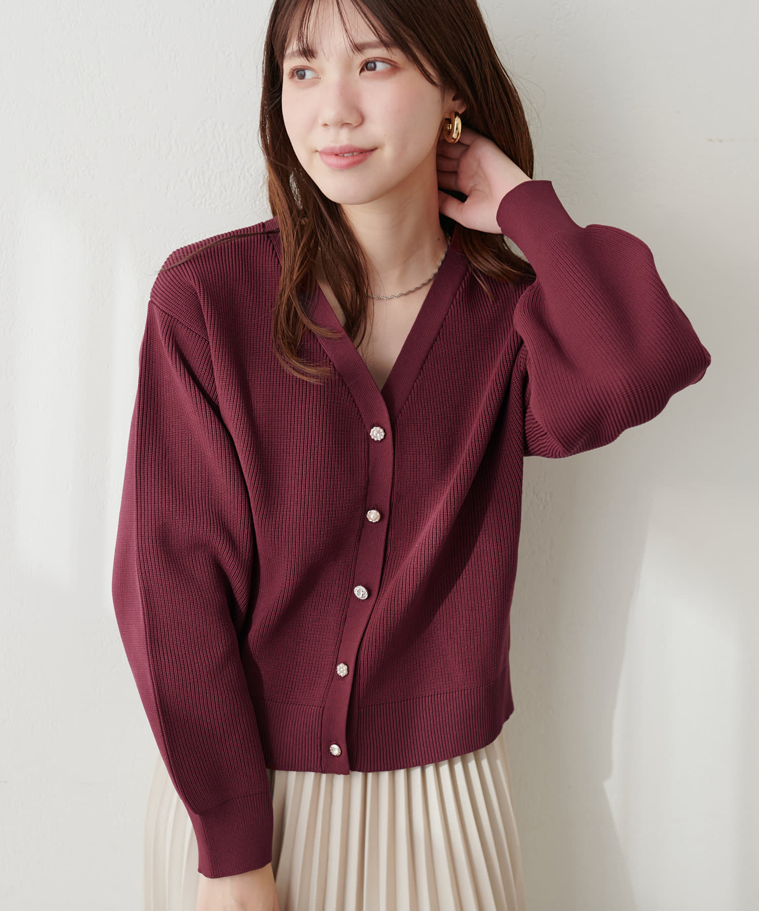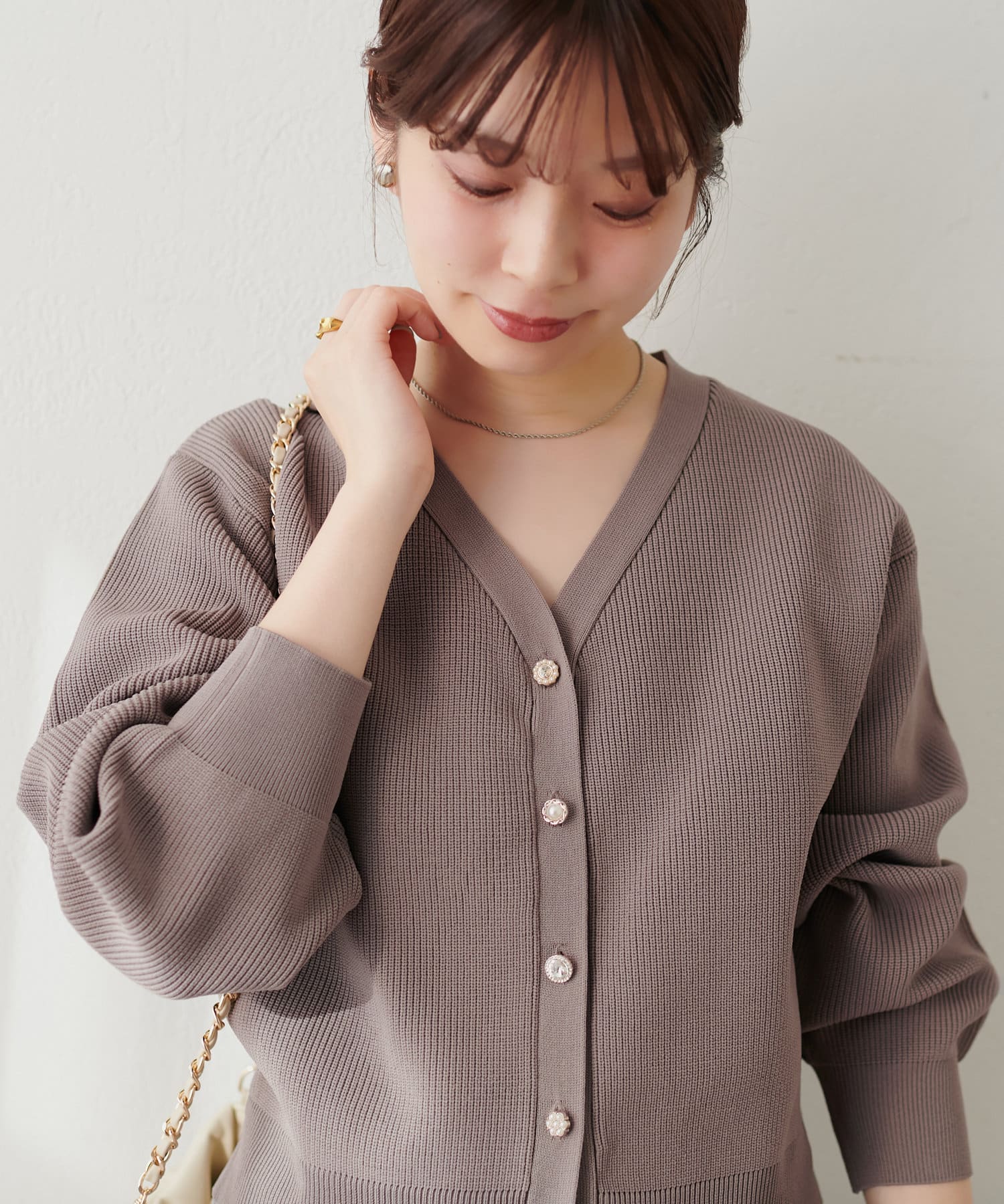 いろいろ釦がポイントのポリニットカーディガン。