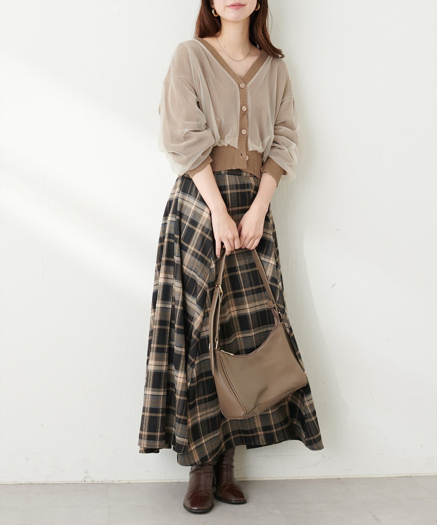シンプルなカーディガンなのでボトムスを選ばないのがポイント。
