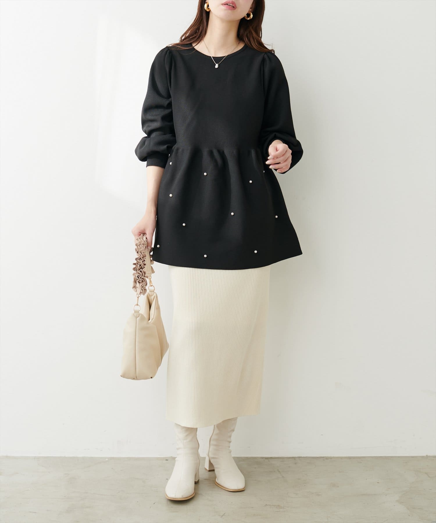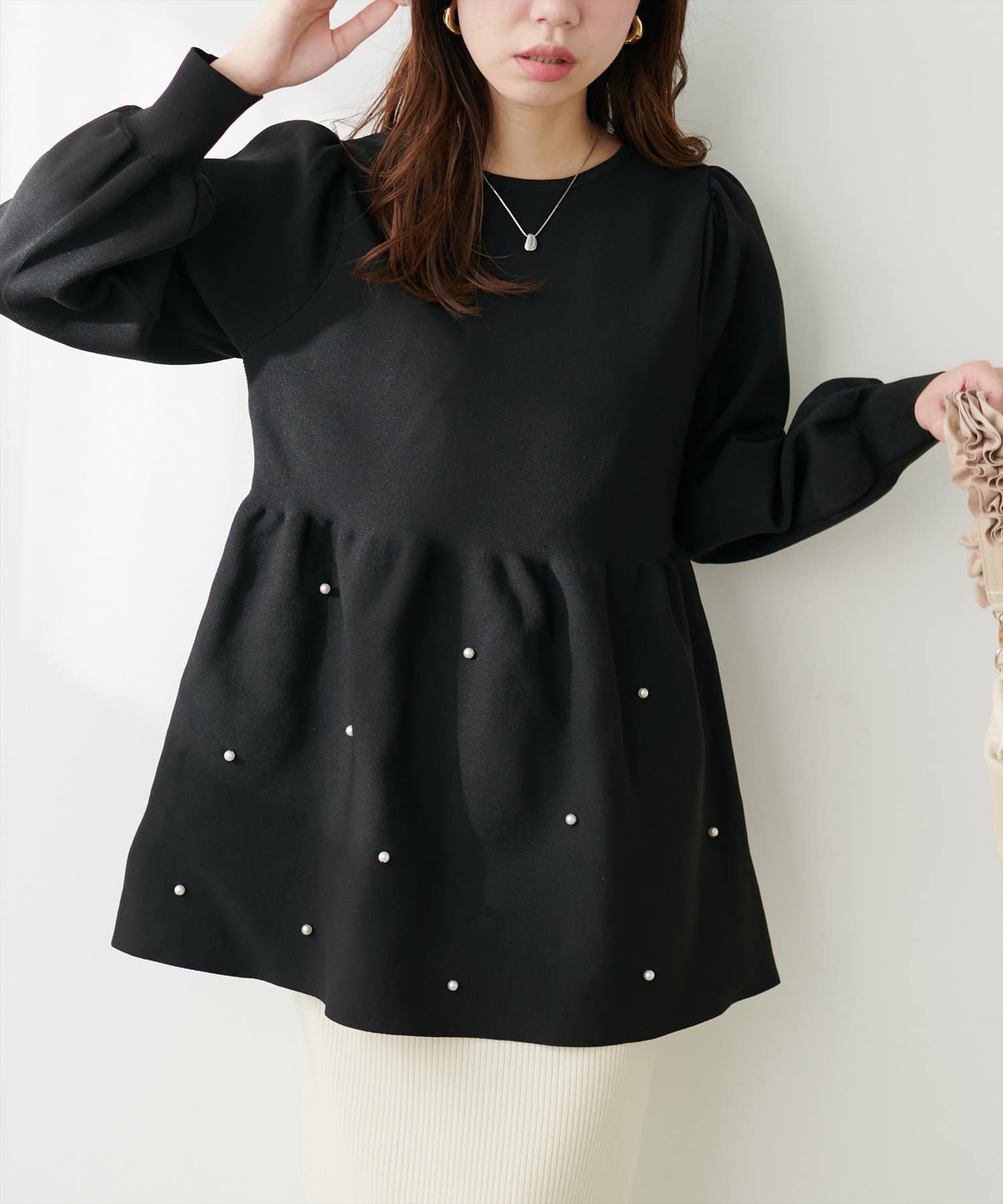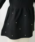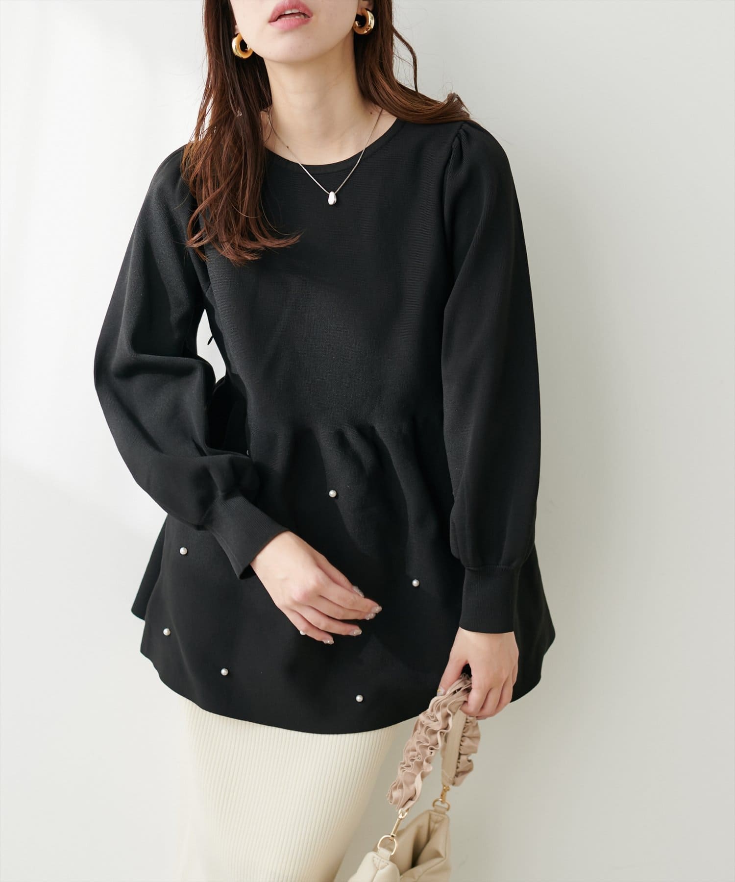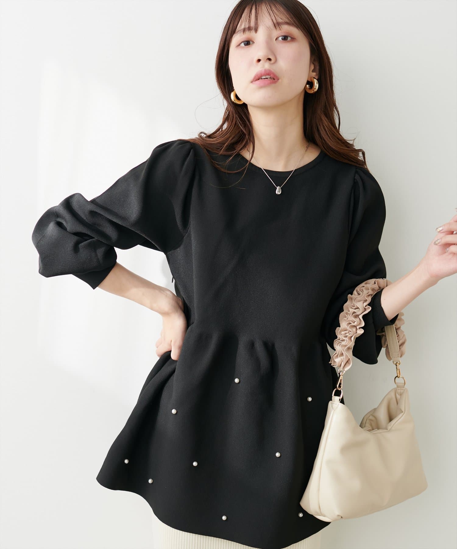 ポリニットの楽な素材感にペプラムとパールで華やかさをプラスしたトップス。