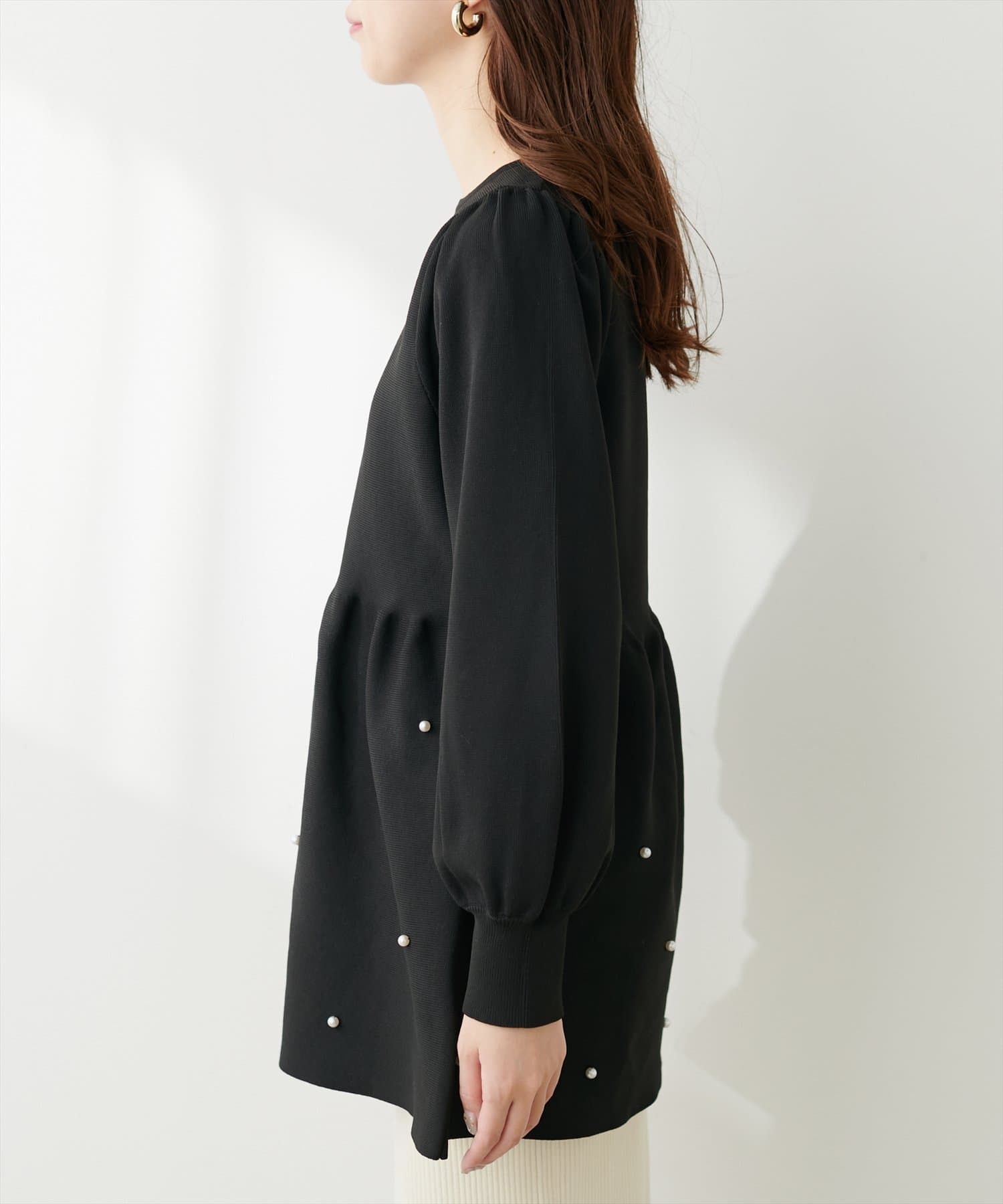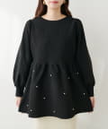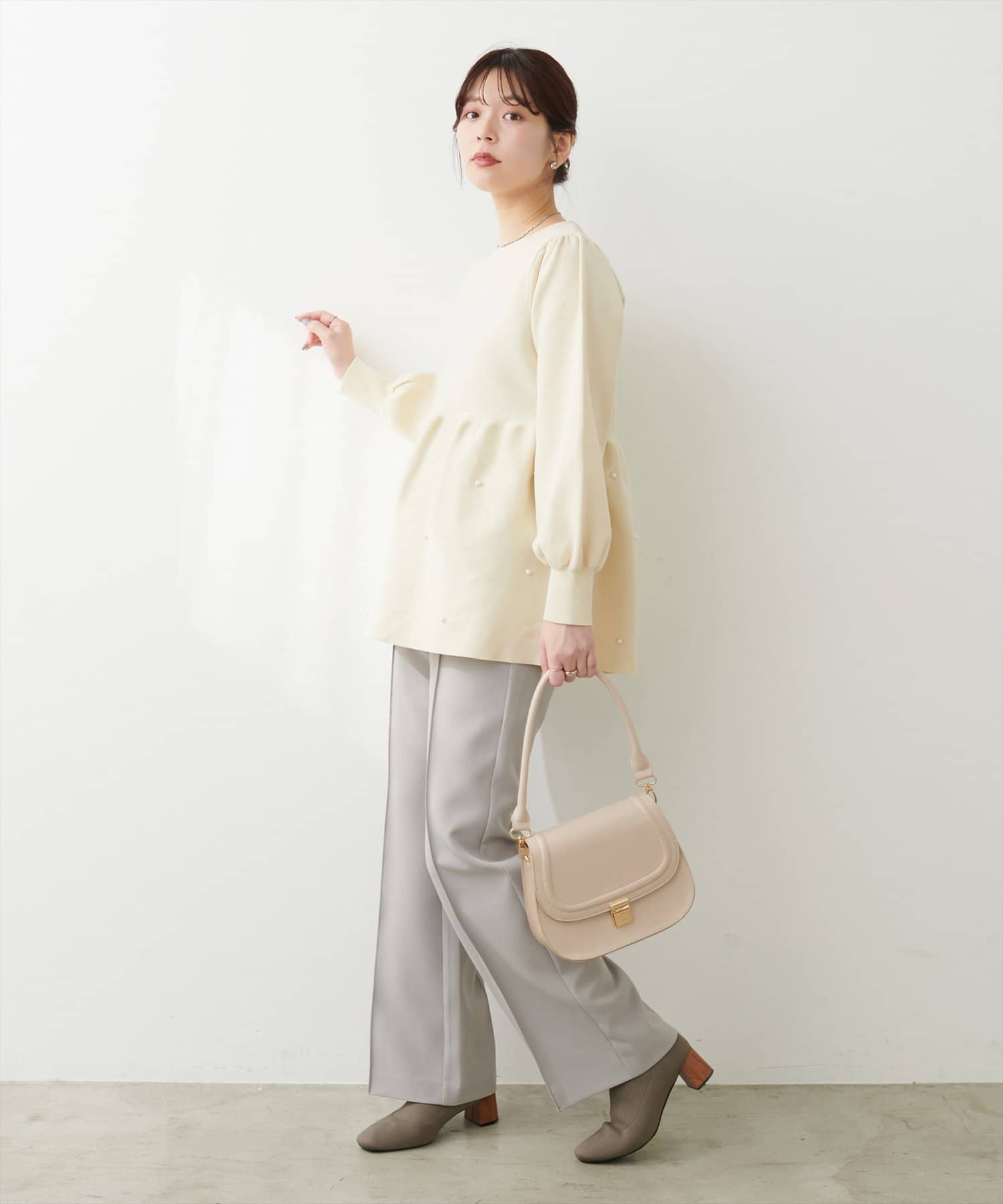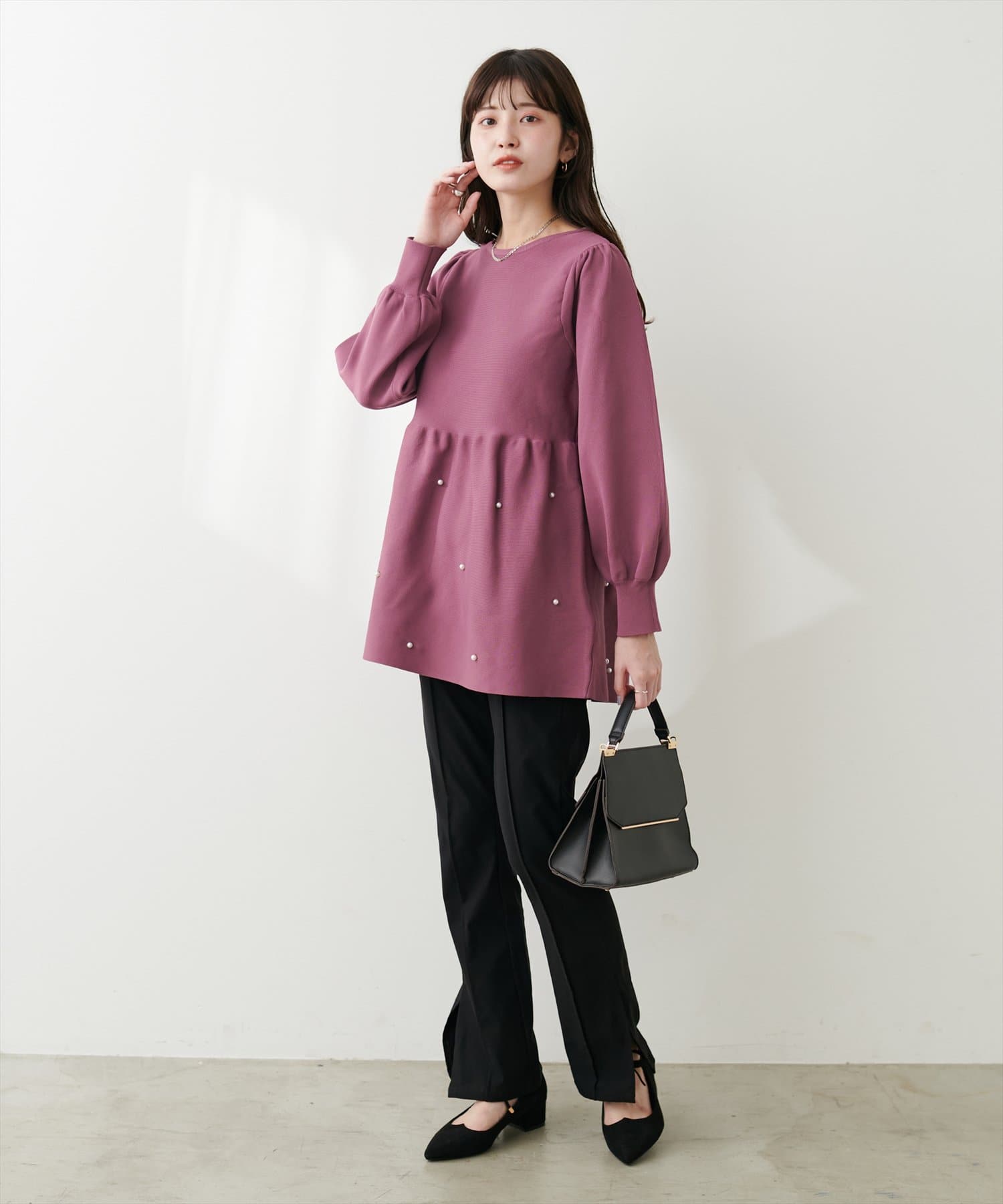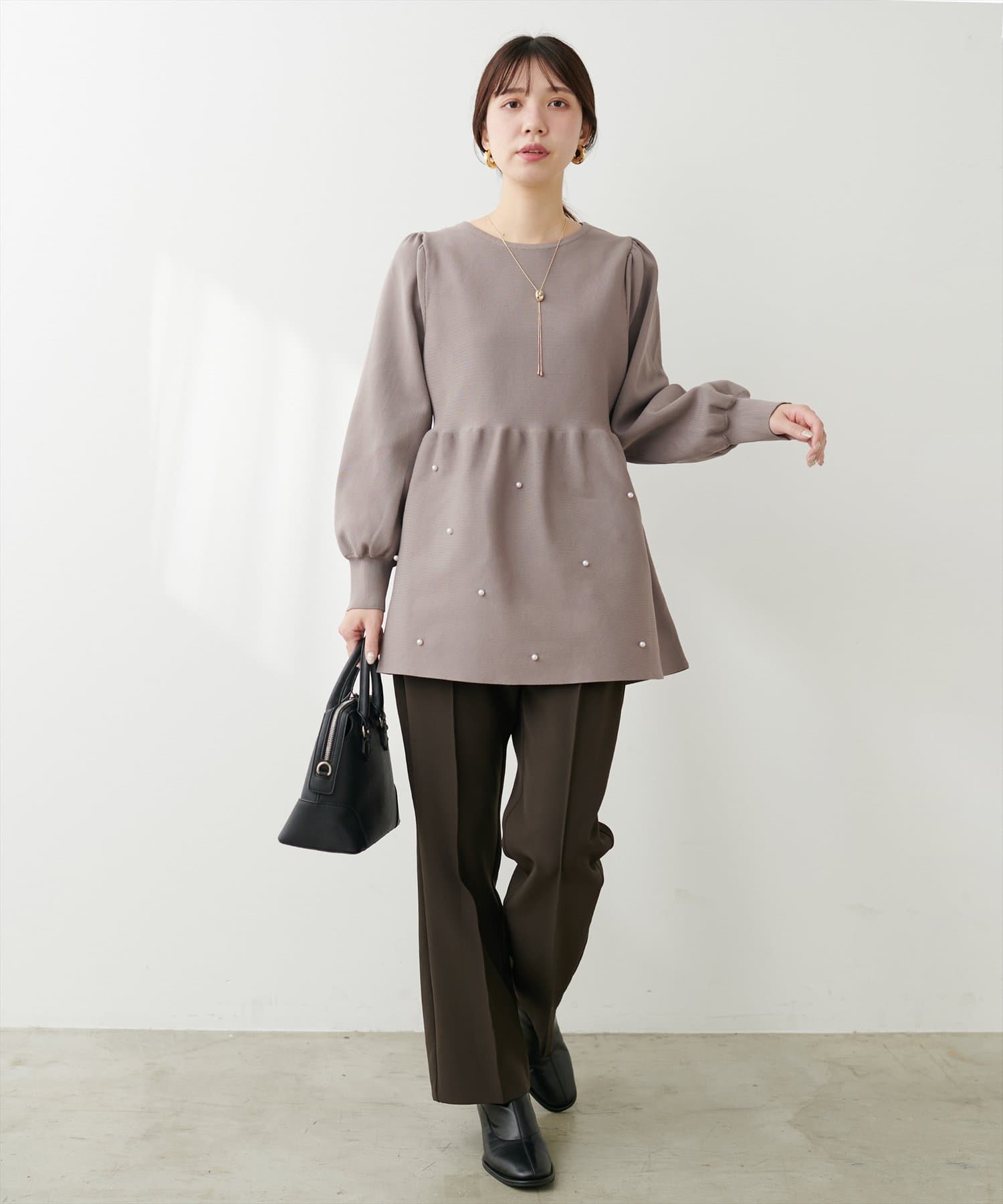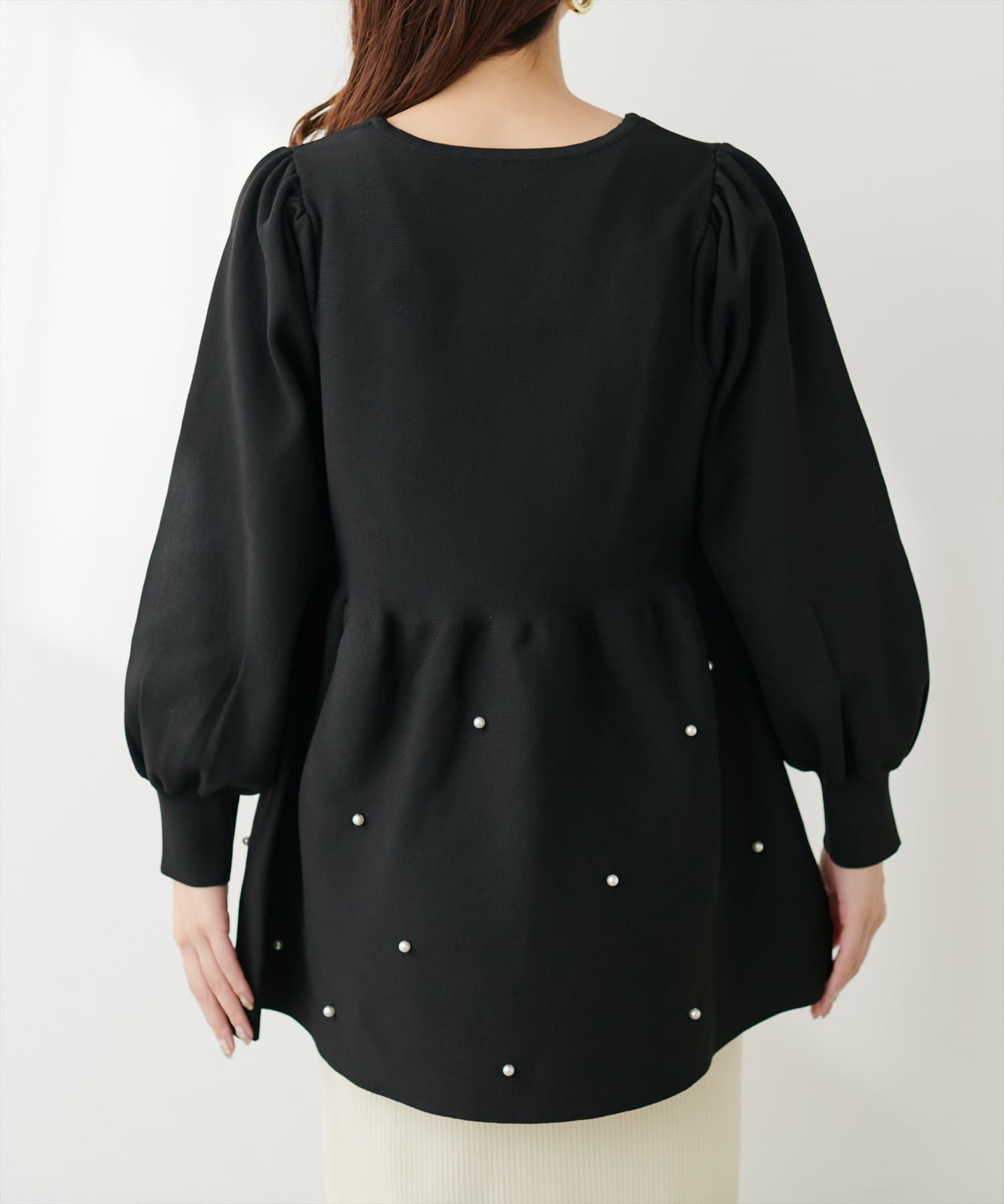 ポリニットの楽な素材感にペプラムとパールで華やかさをプラスしたトップス。
