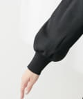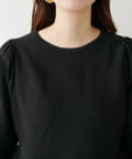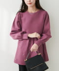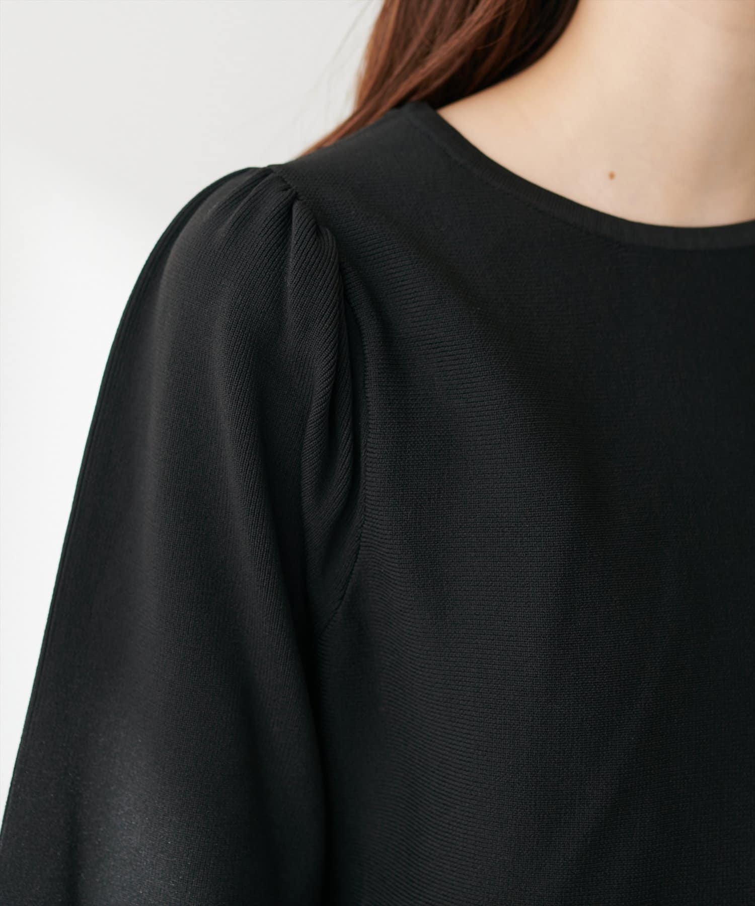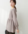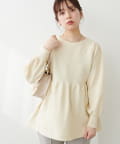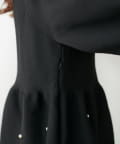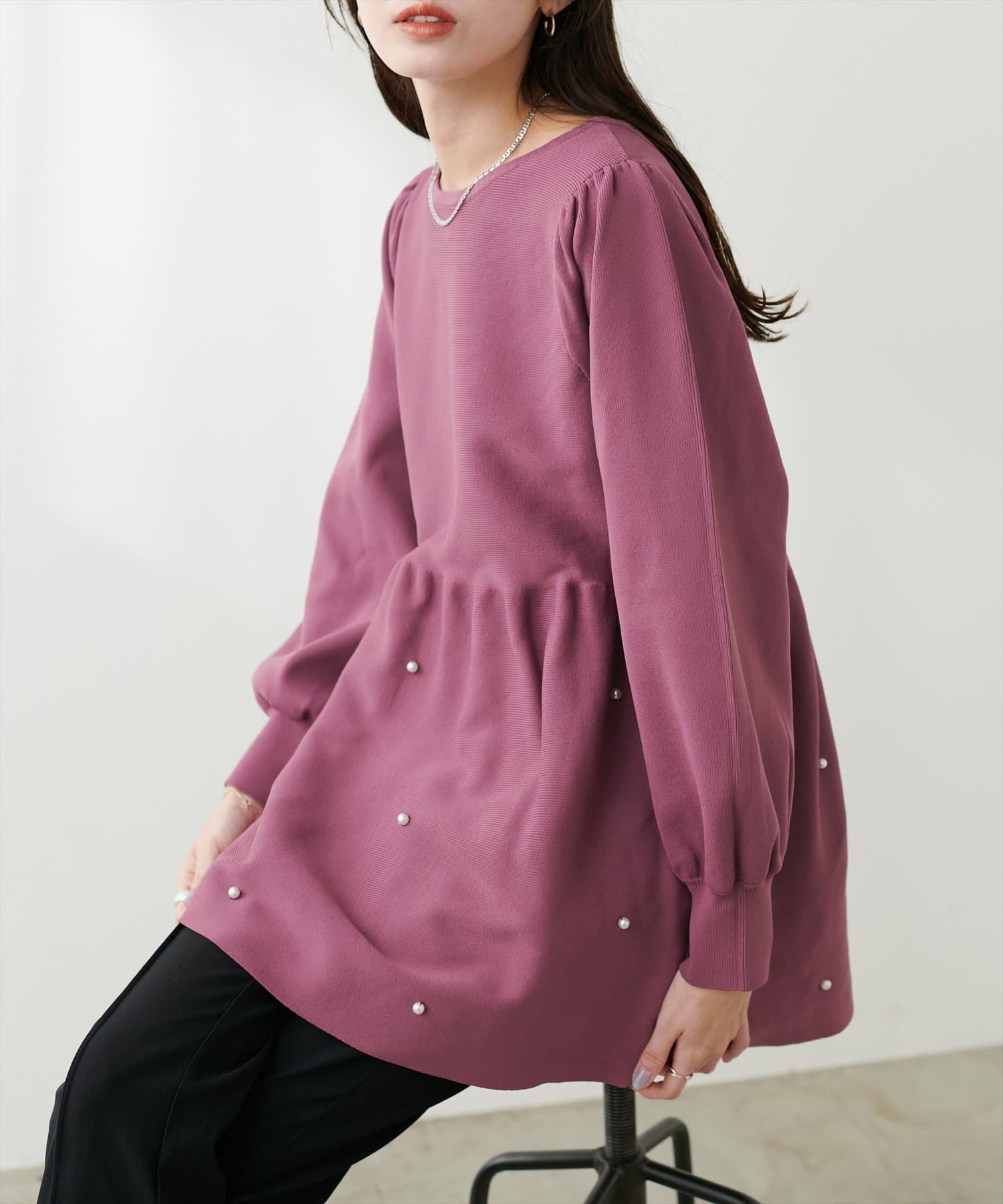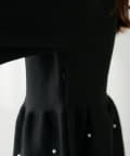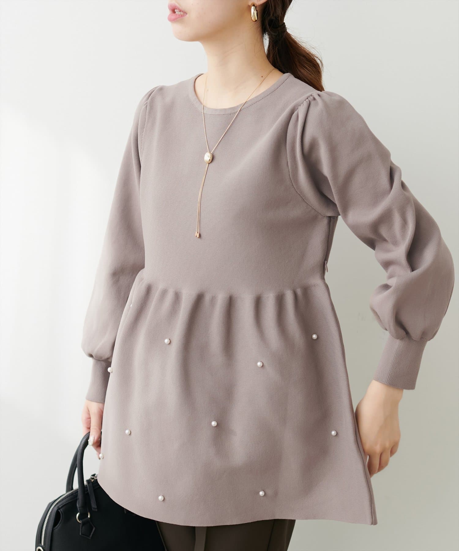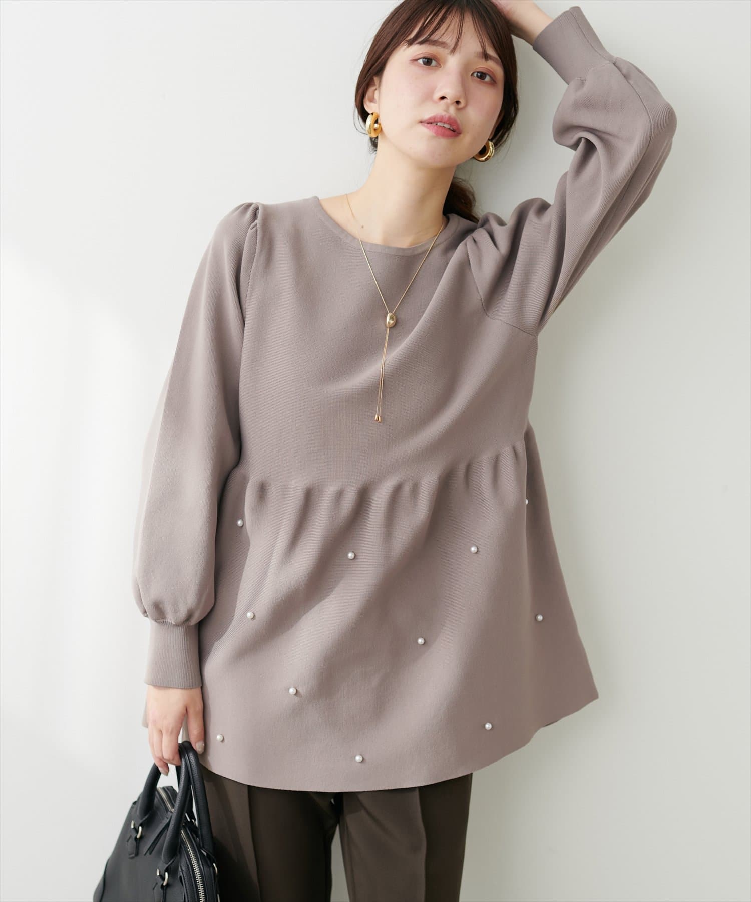 ポリニットの楽な素材感にペプラムとパールで華やかさをプラスしたトップス。