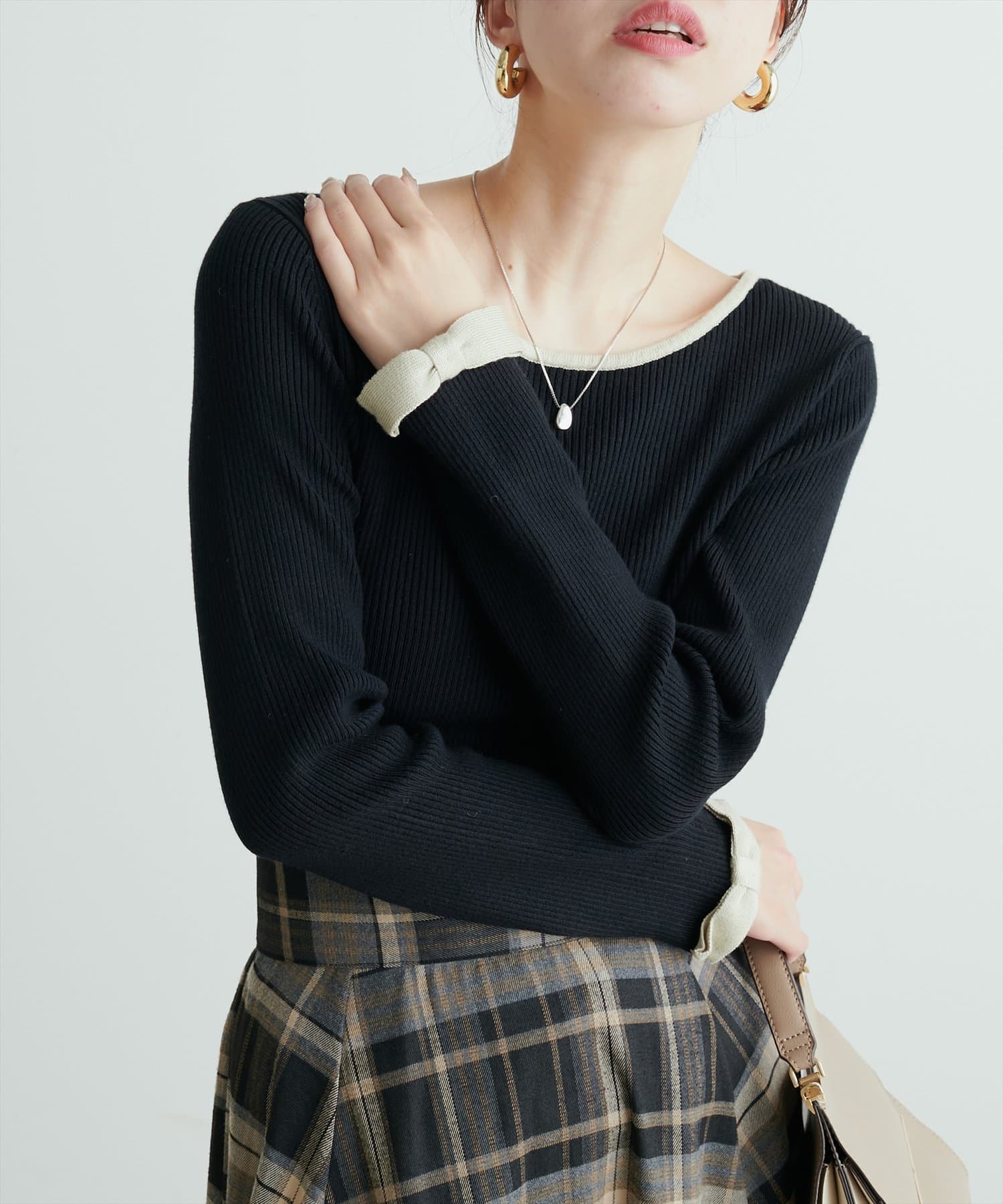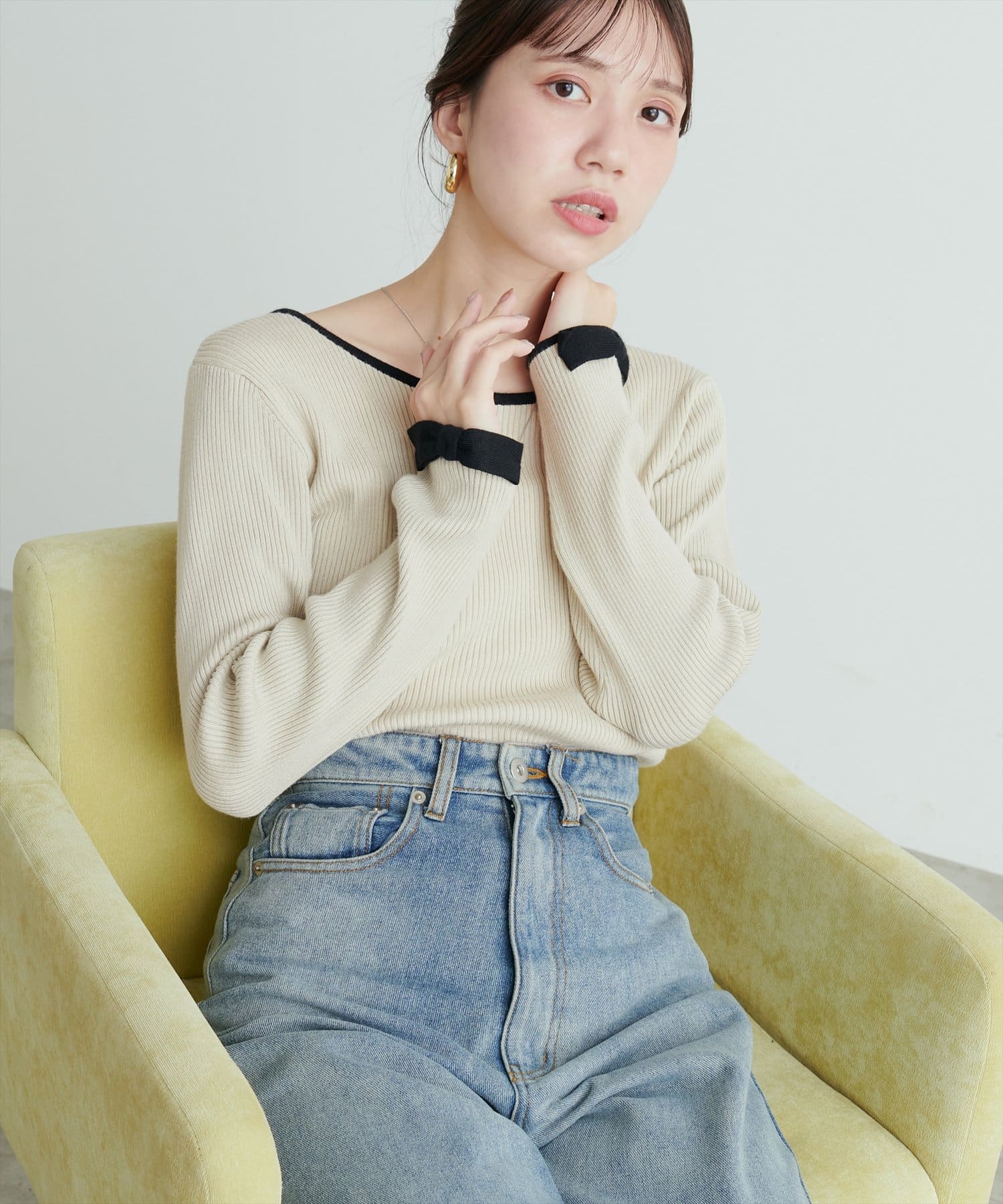 袖口リボン配色リブニット