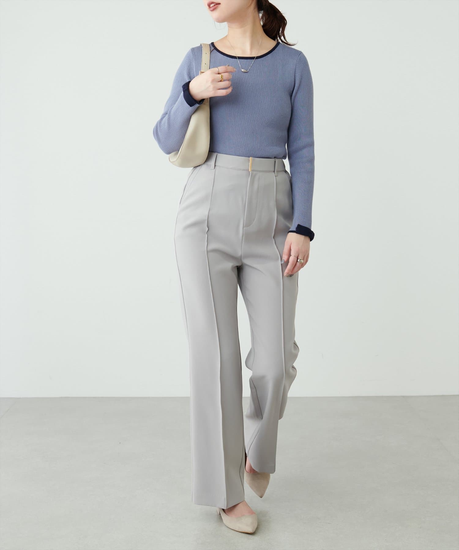 ネックラインと袖口の配色使いが、コーデのアクセントになり、