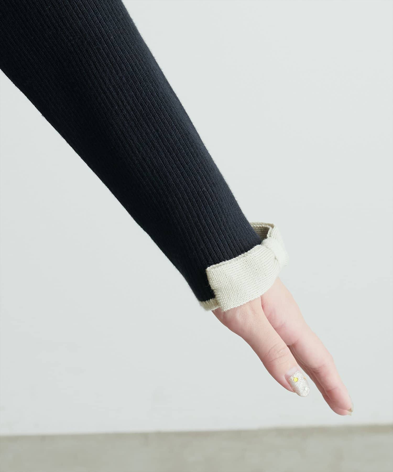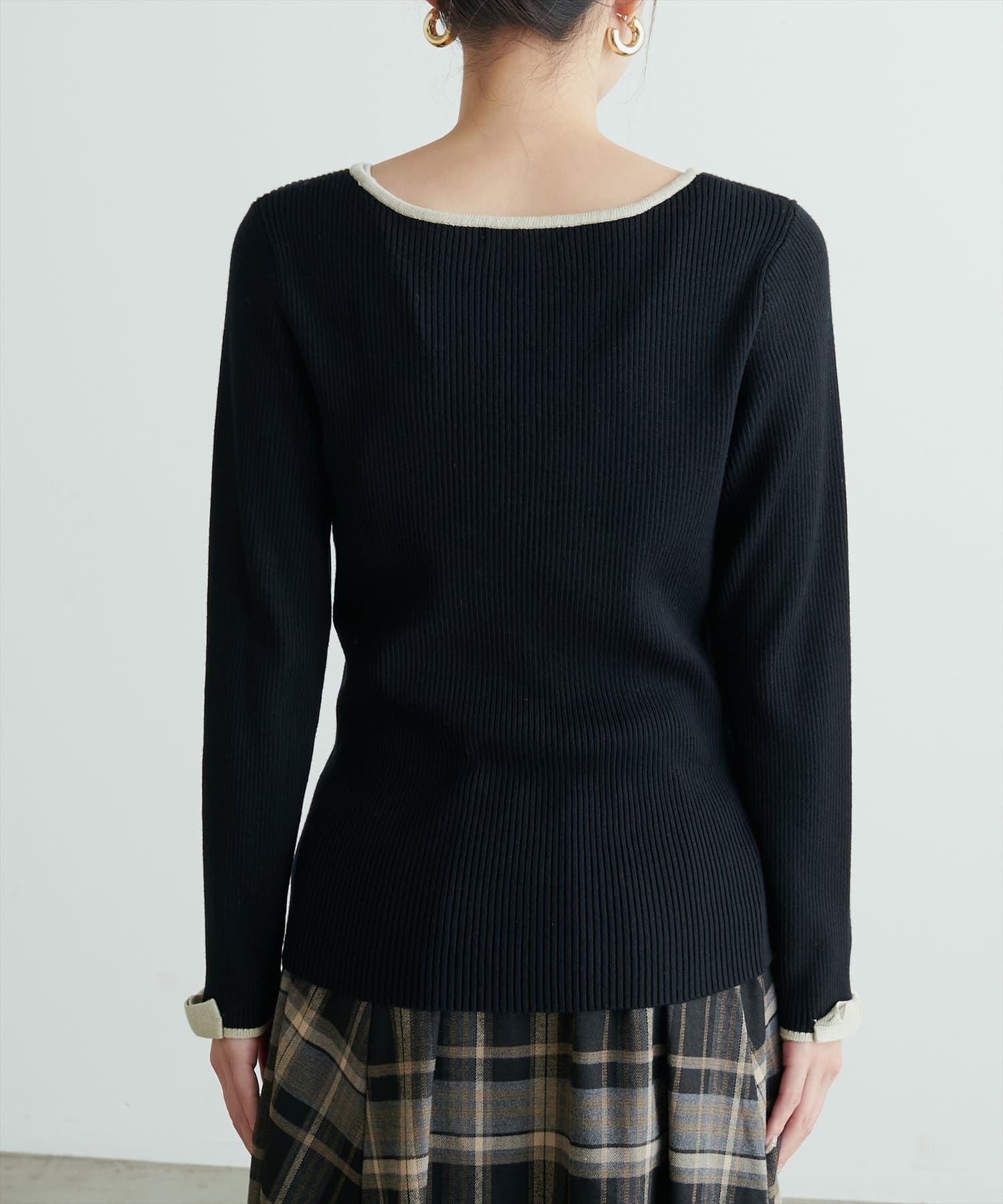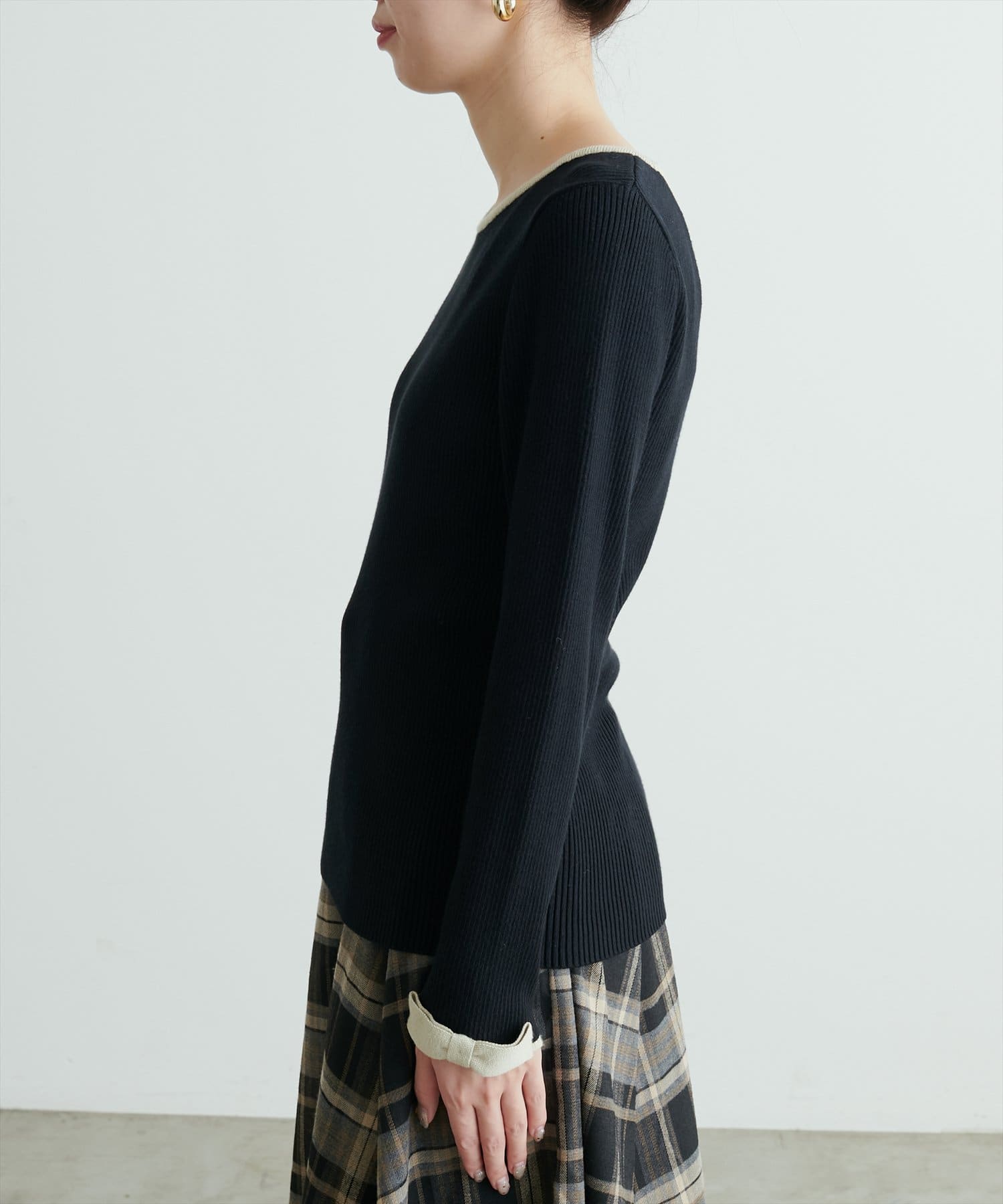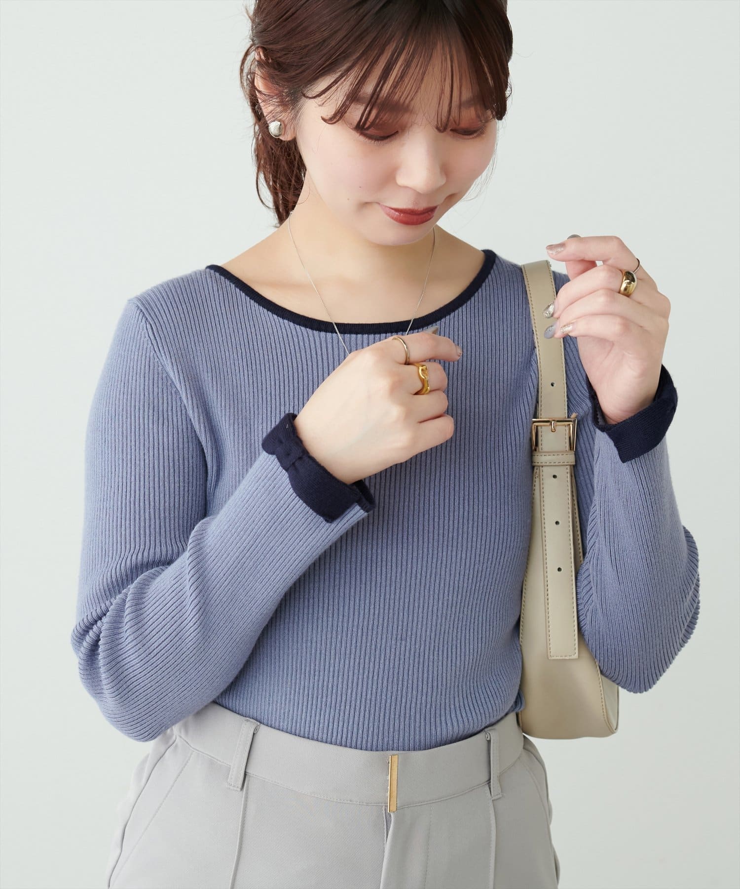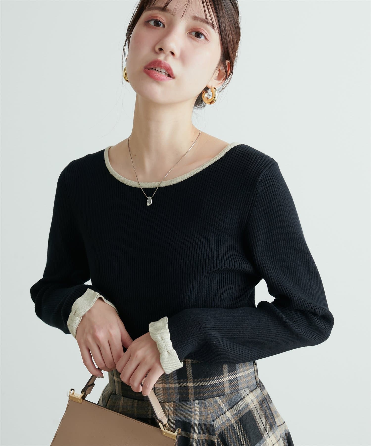 ネックラインと袖口の配色使いが、コーデのアクセントになり、