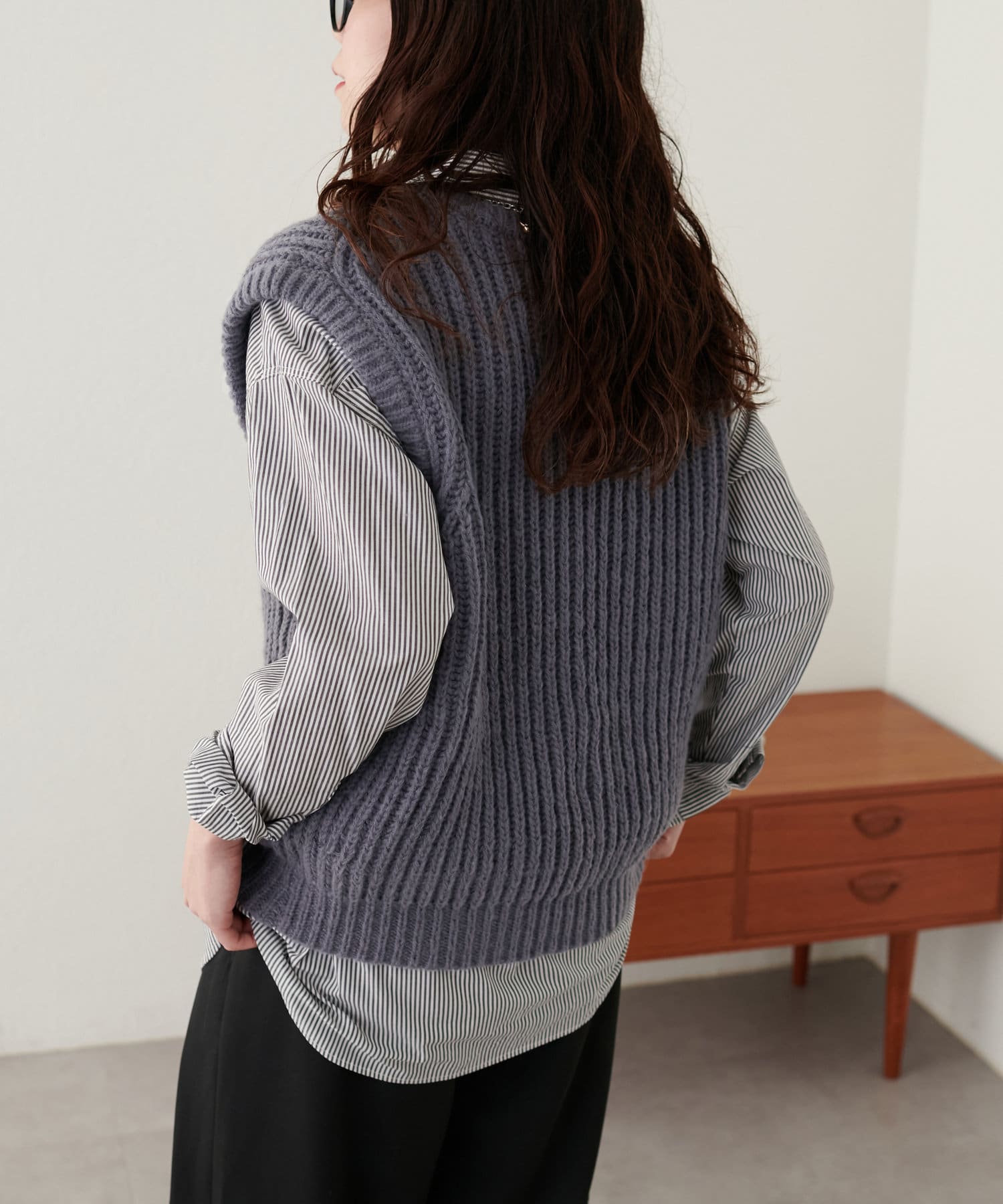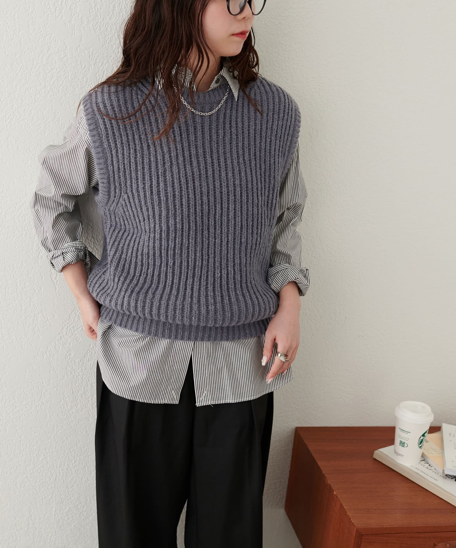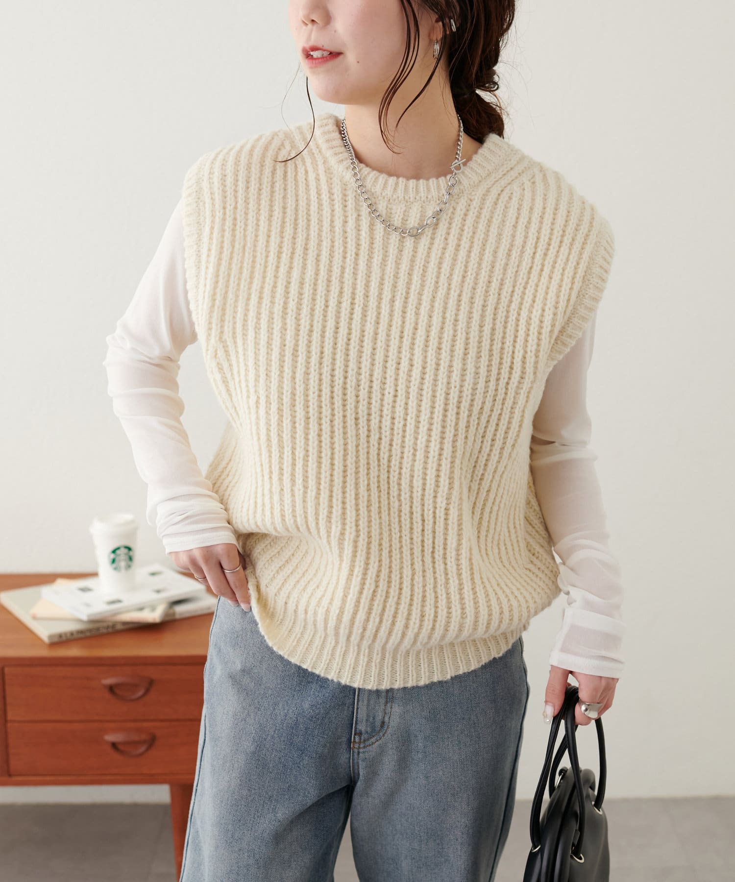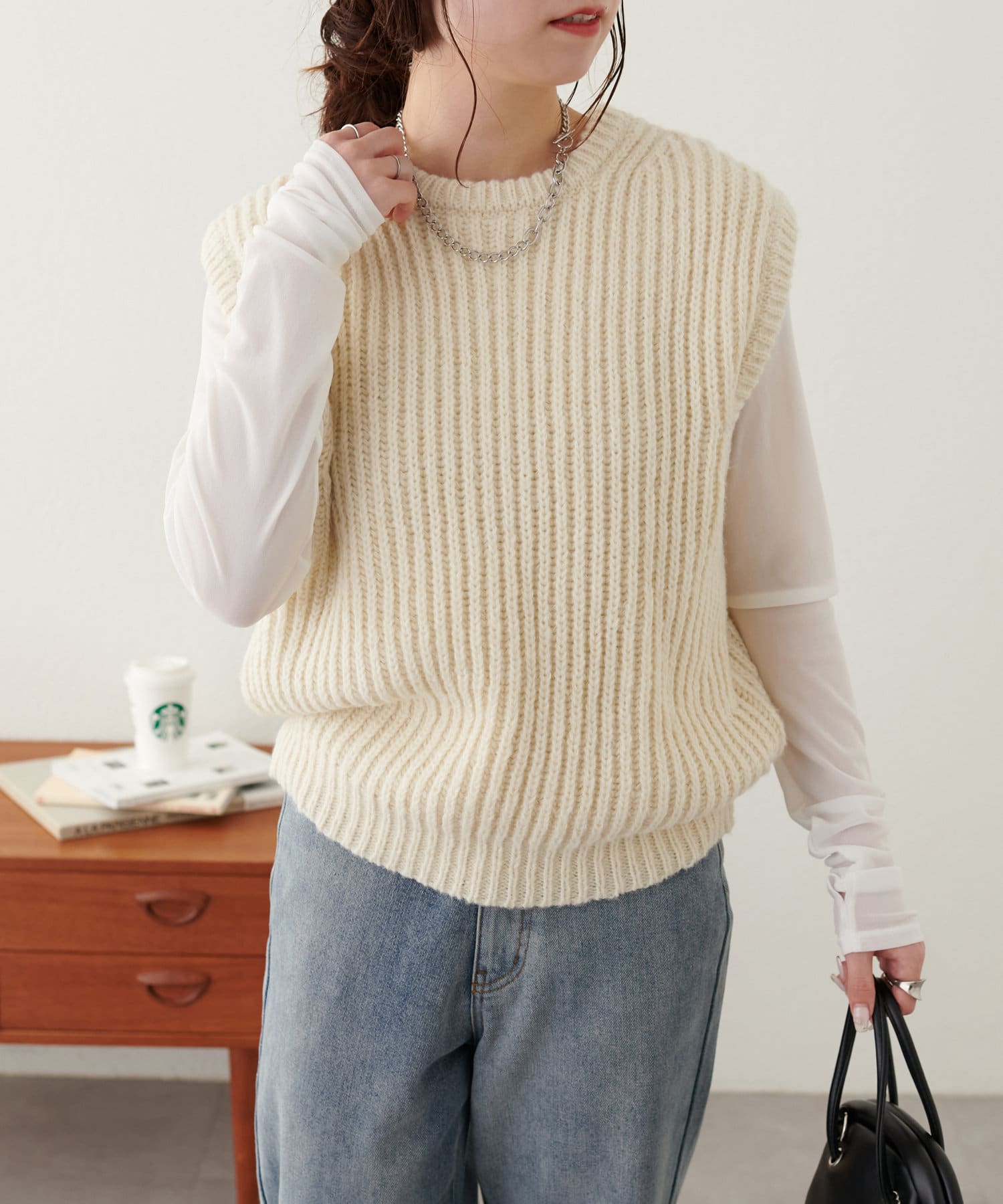 レイヤードスタイルを楽しむクルーネックベスト