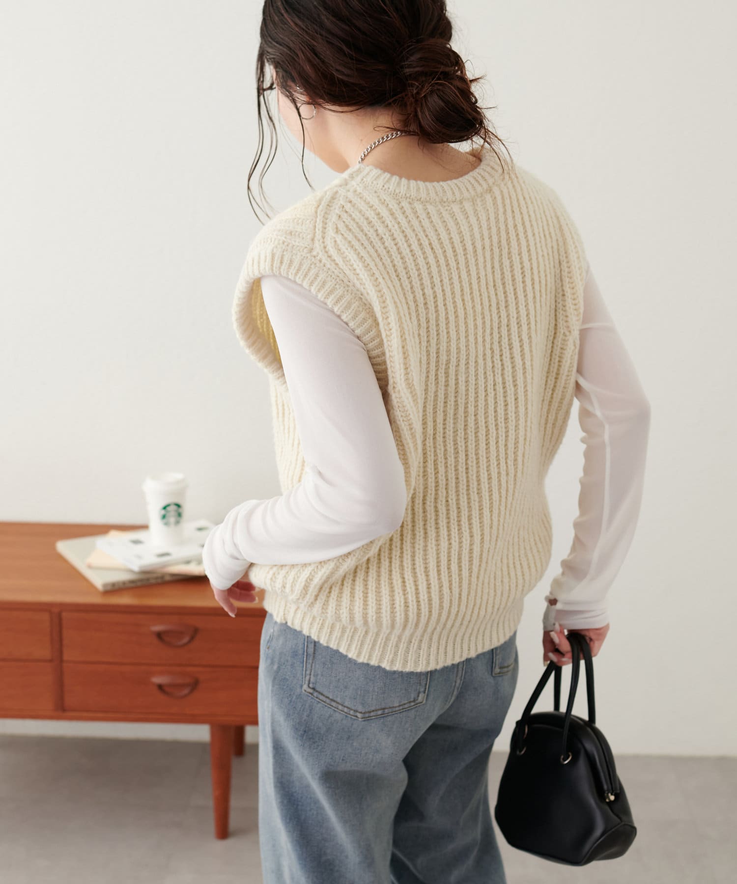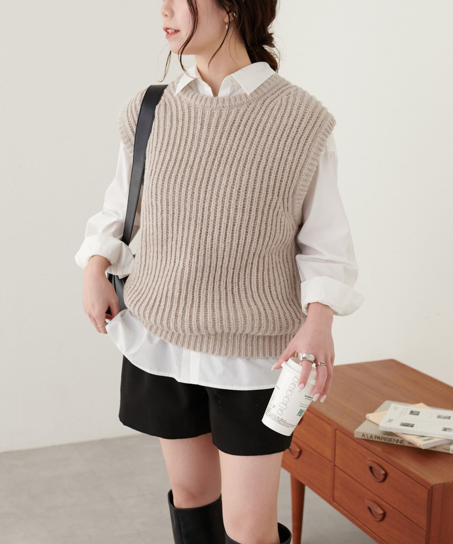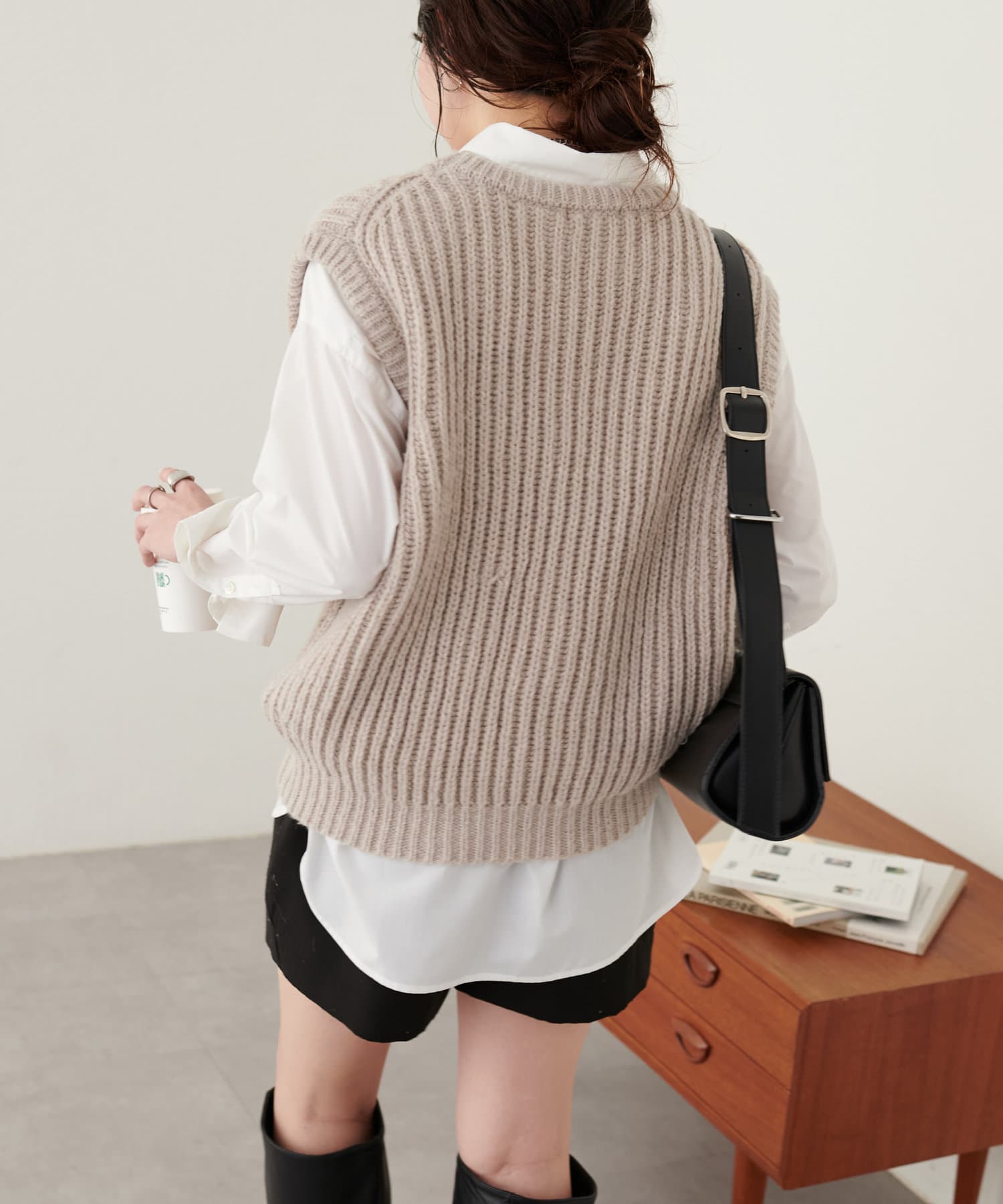 レイヤードスタイルを楽しむクルーネックベスト