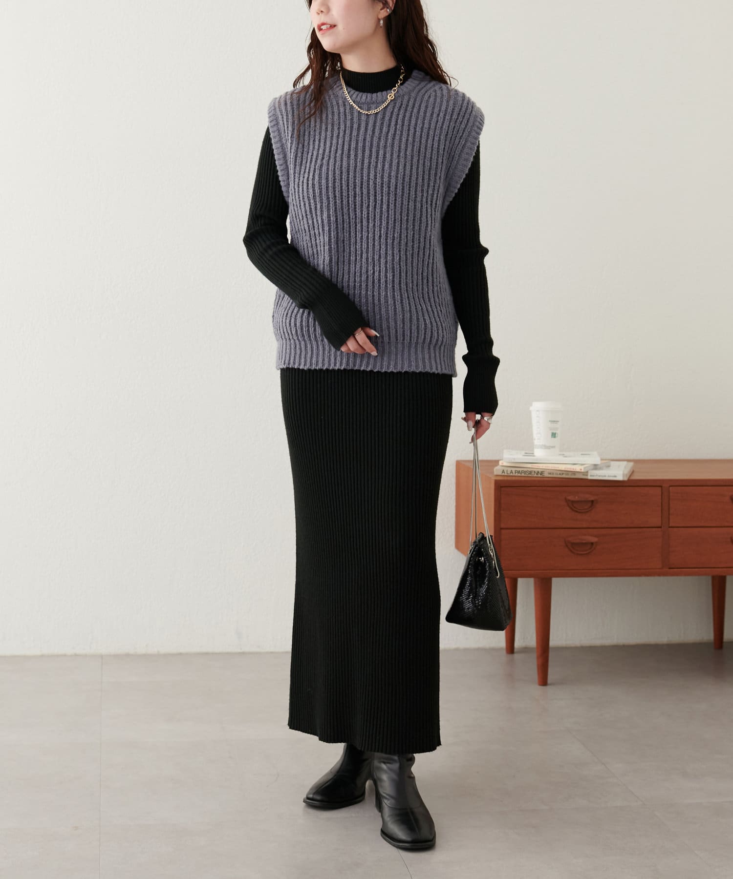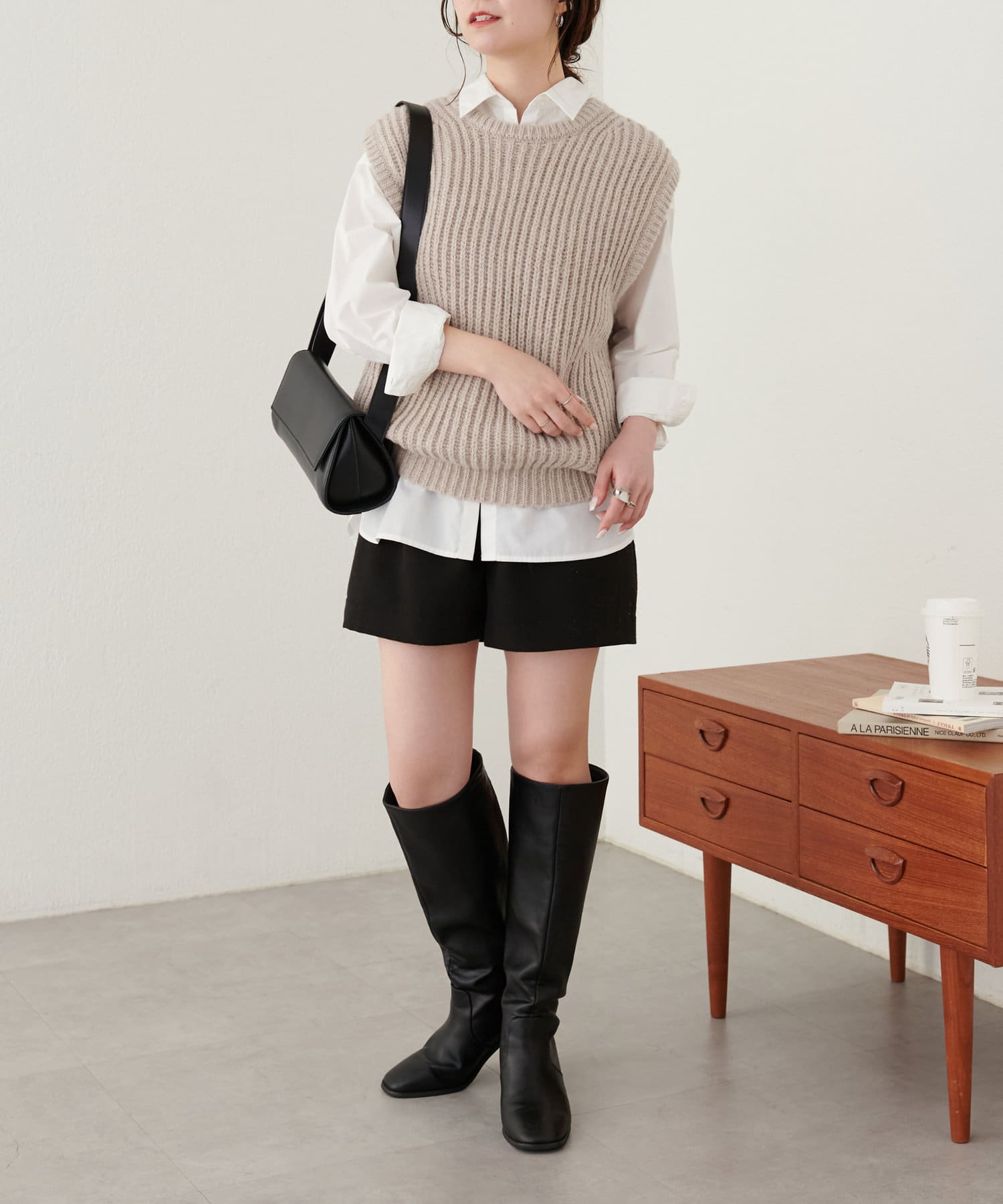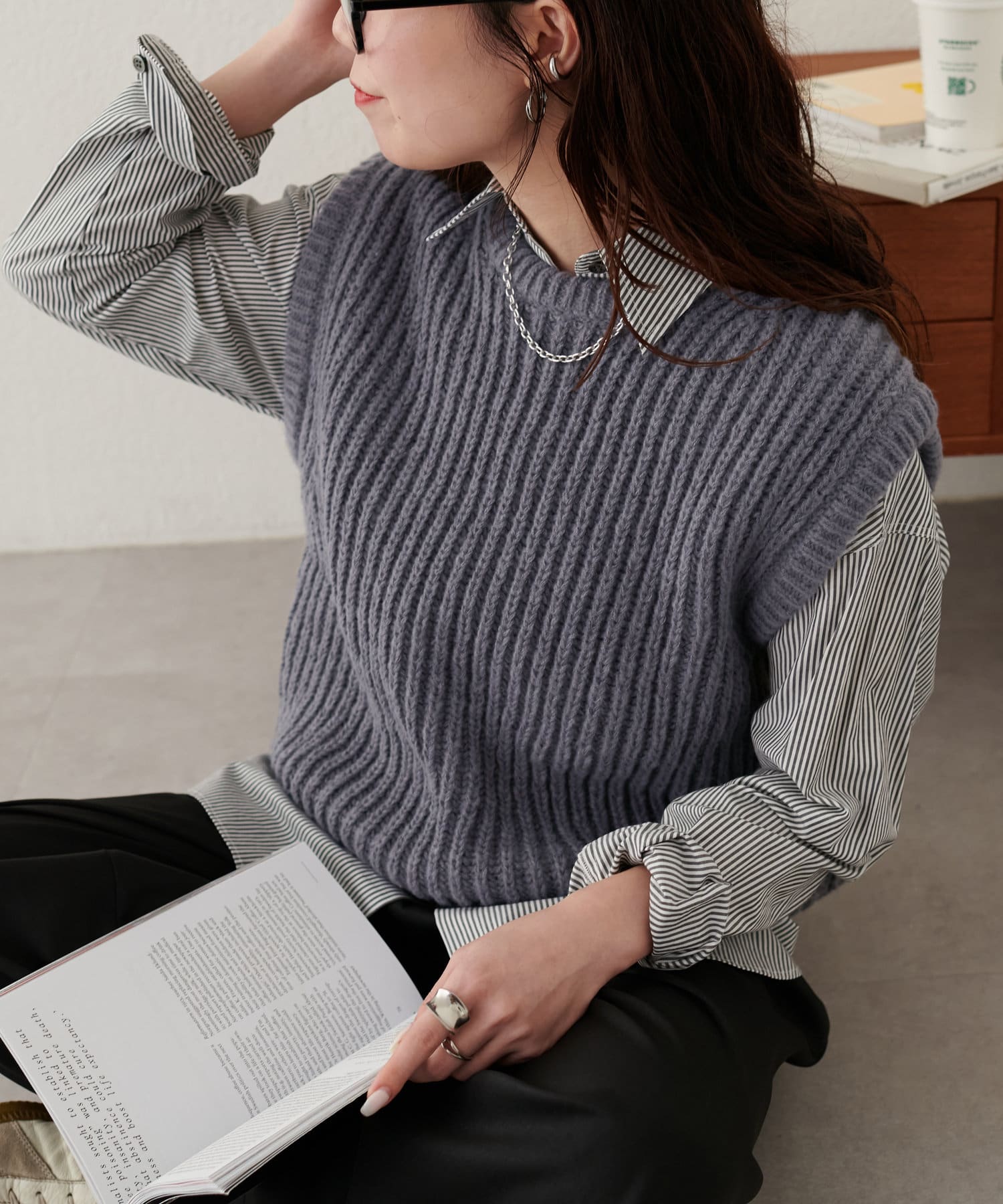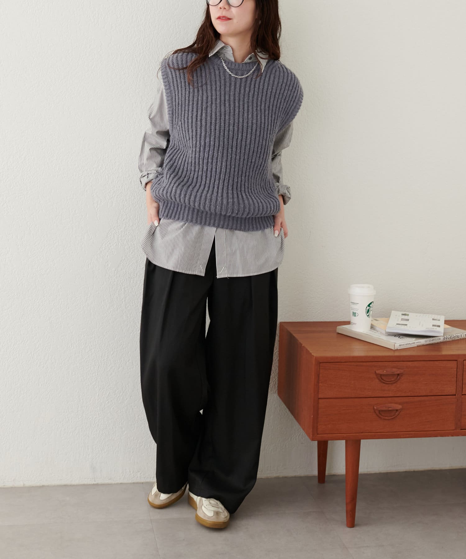 レイヤードスタイルを楽しむクルーネックベスト