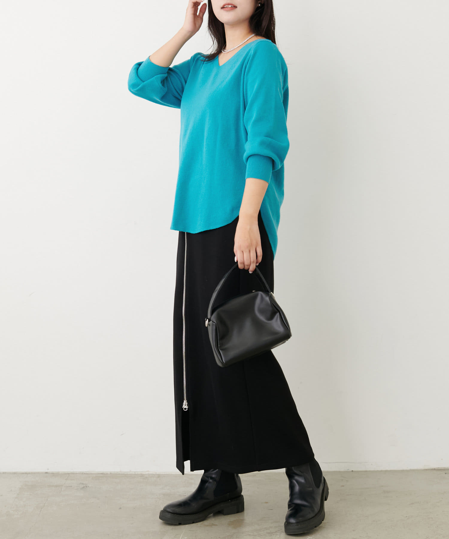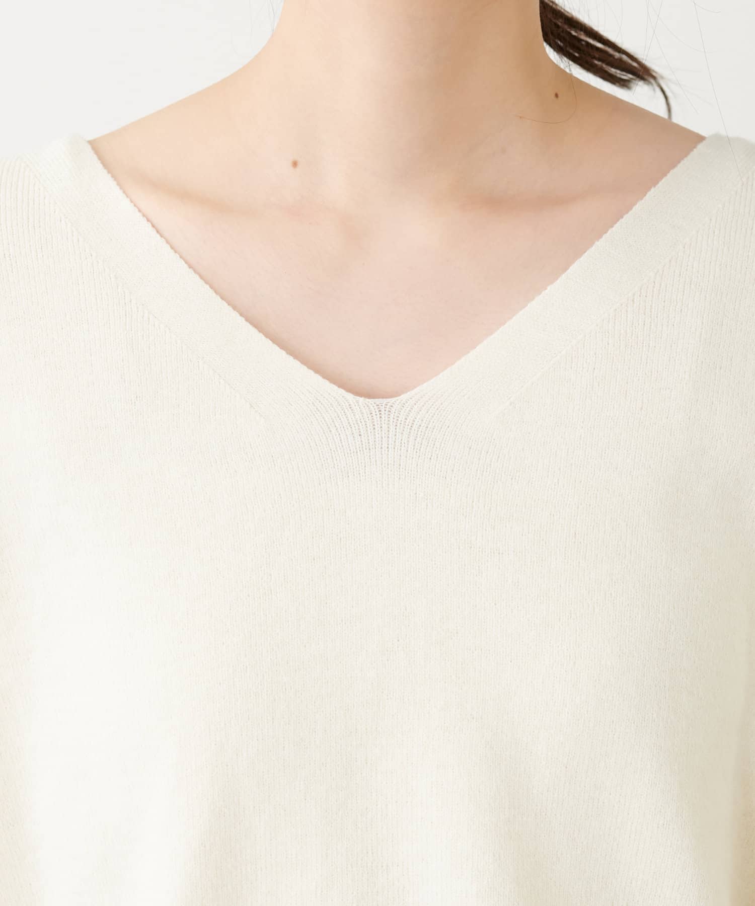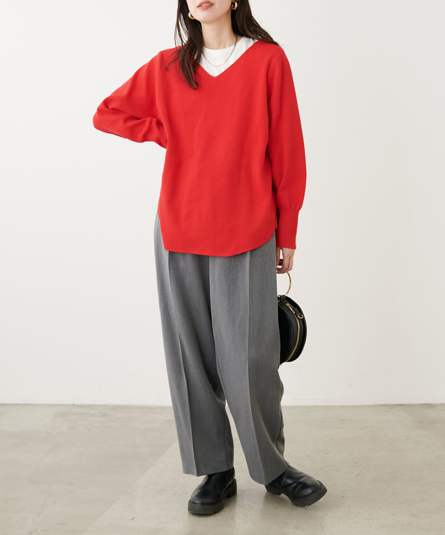 そうすることで、カジュアルな印象のあるVネックもきれいめなアイテムとも合わせやすくしました。