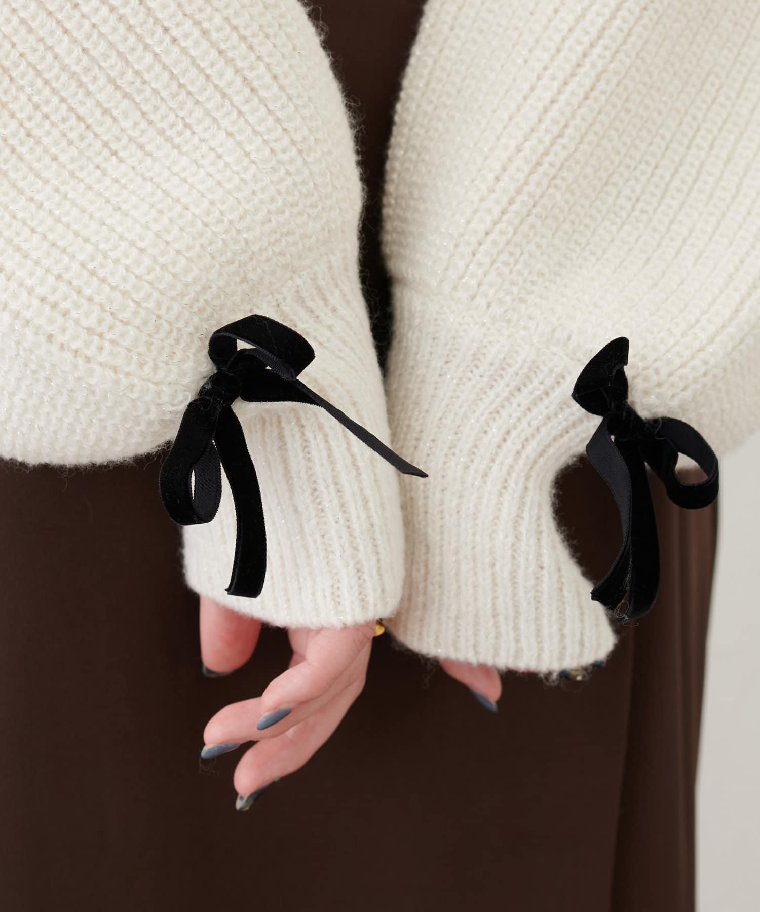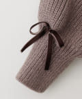 袖はゆったりとボリュームがあり、袖口のベロアリボンが可愛さを引き立てます。