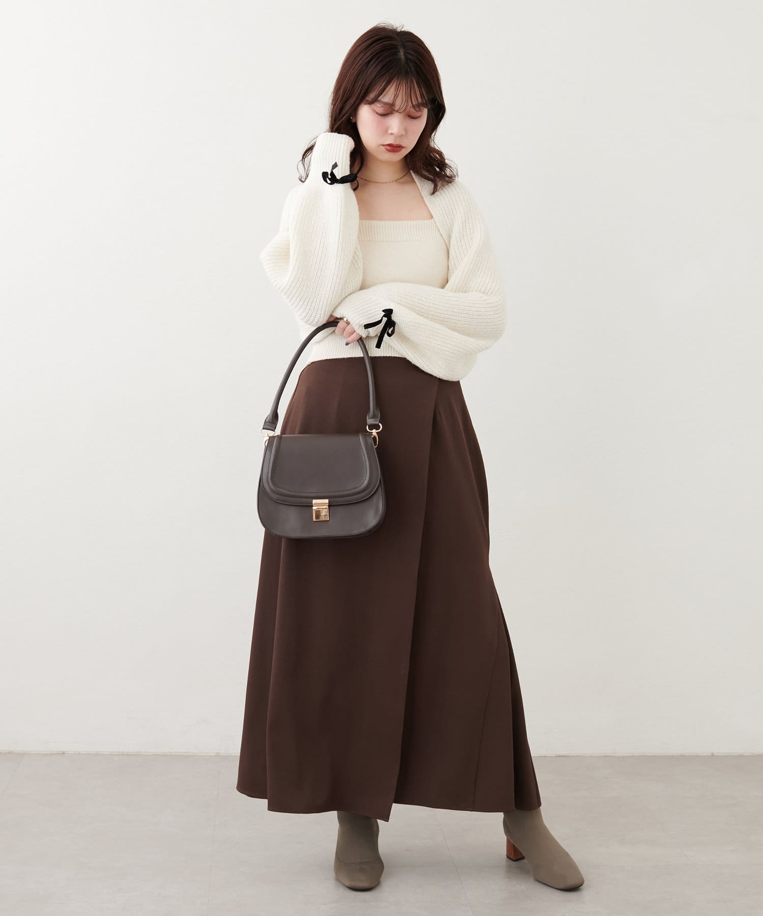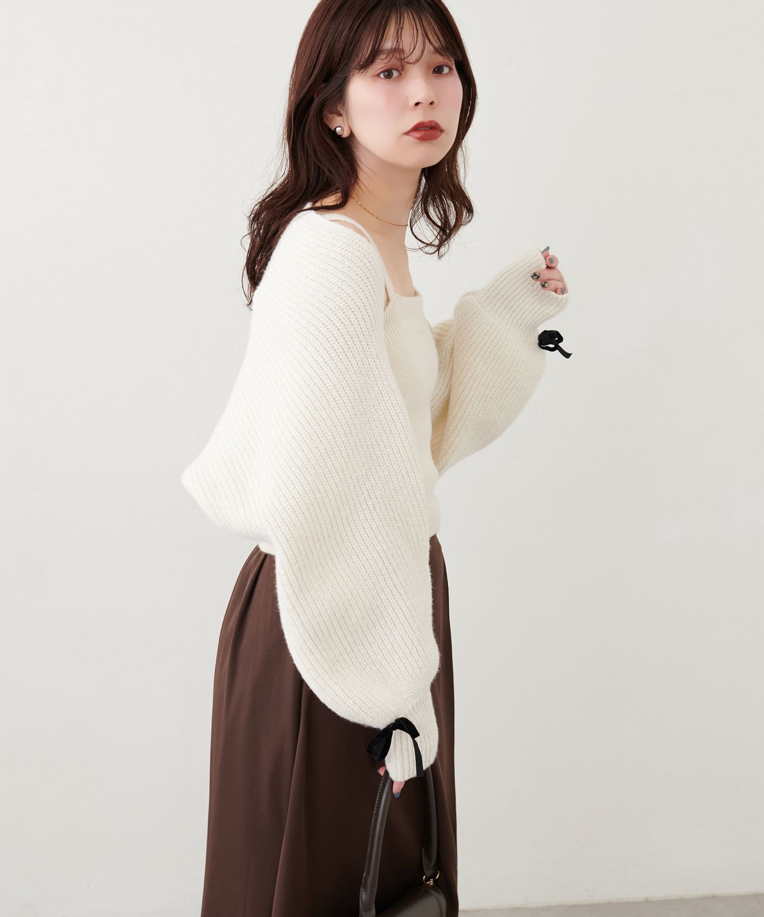 すっきりした丈のカーディガンなので、ハイウエストのボトムと相性がよく、スタイルアップ効果も◎