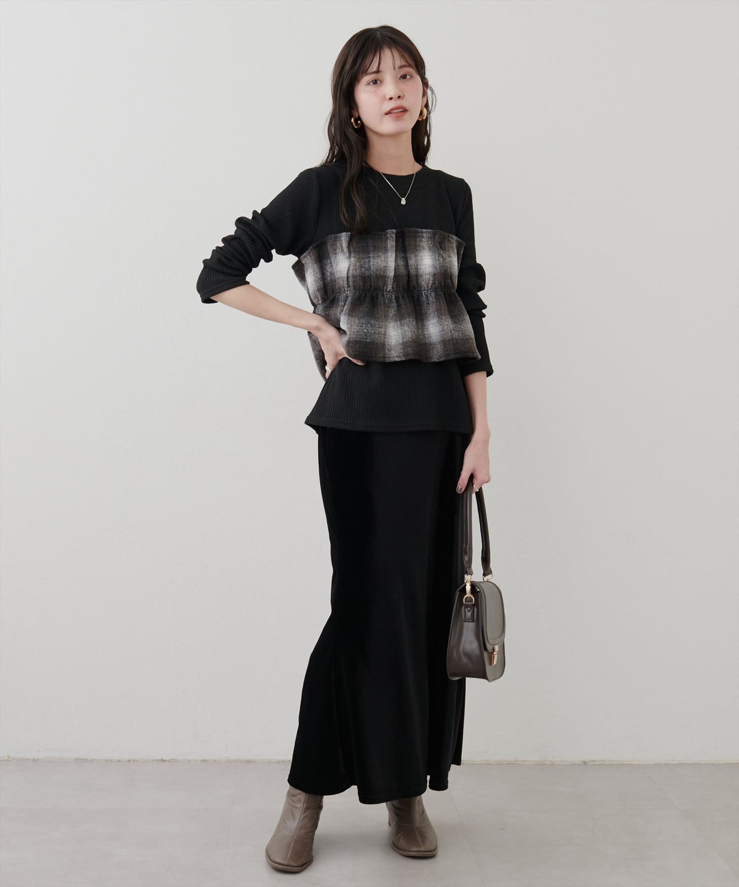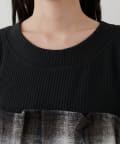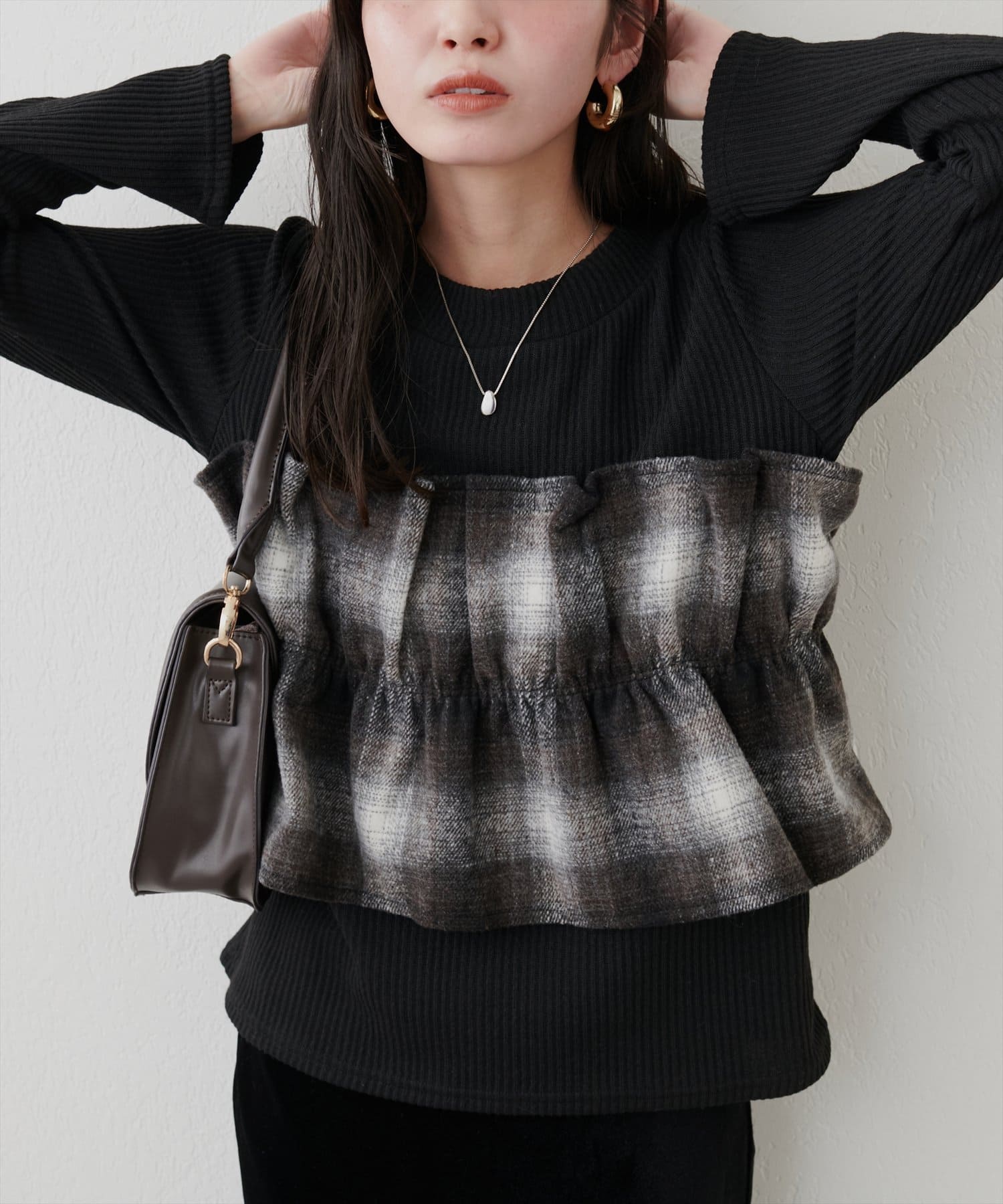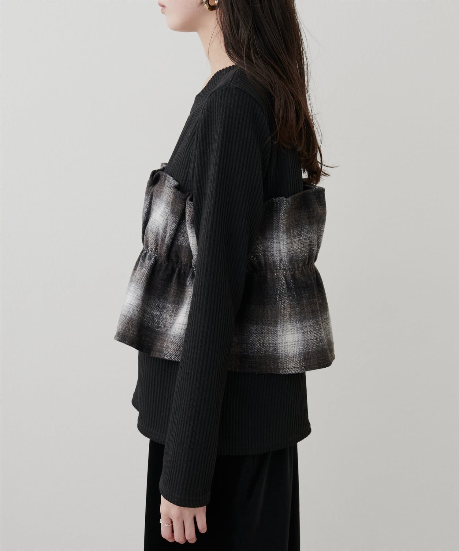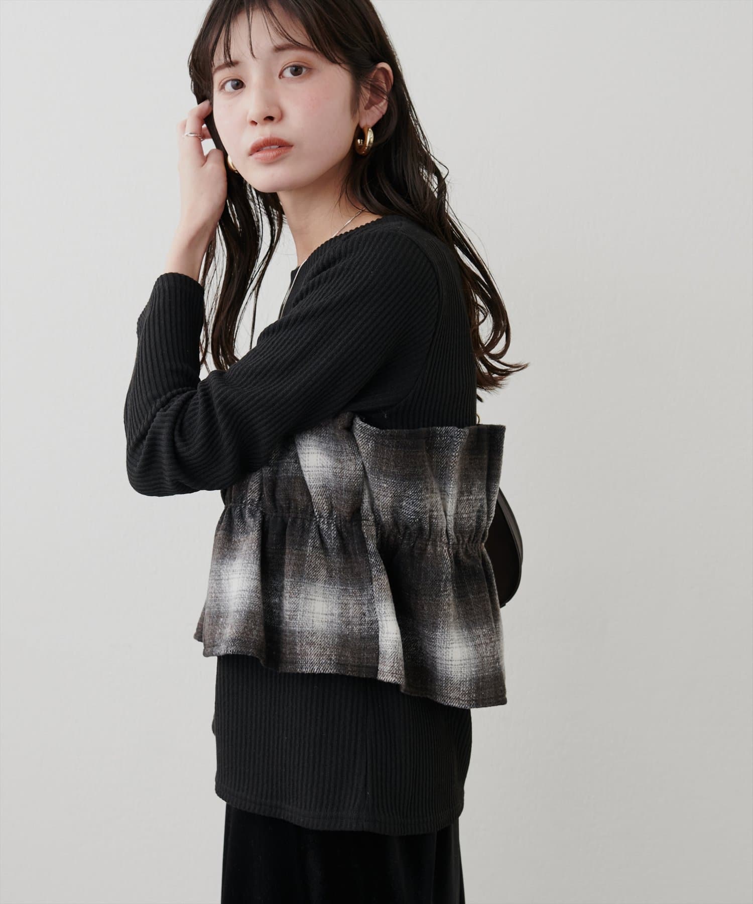 柔らかなリブカットトップスとやや起毛がかったチェック素材をドッキングしたビスチェ風トップス。