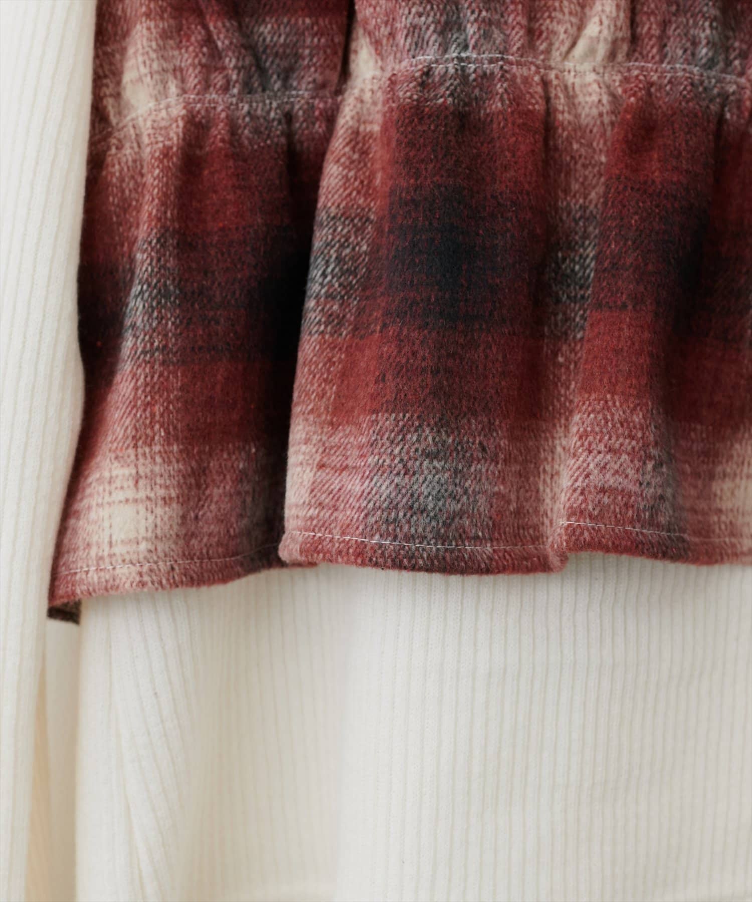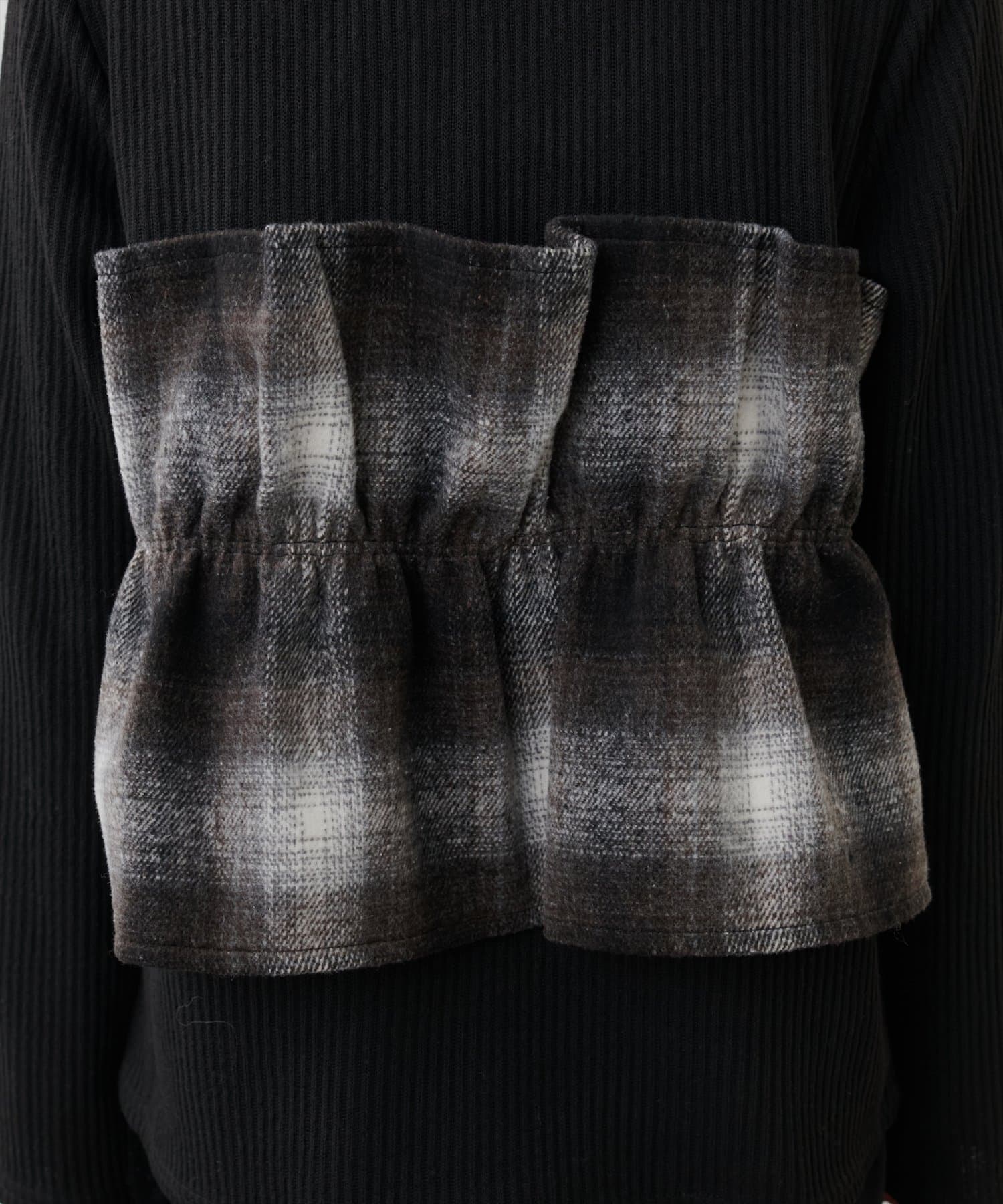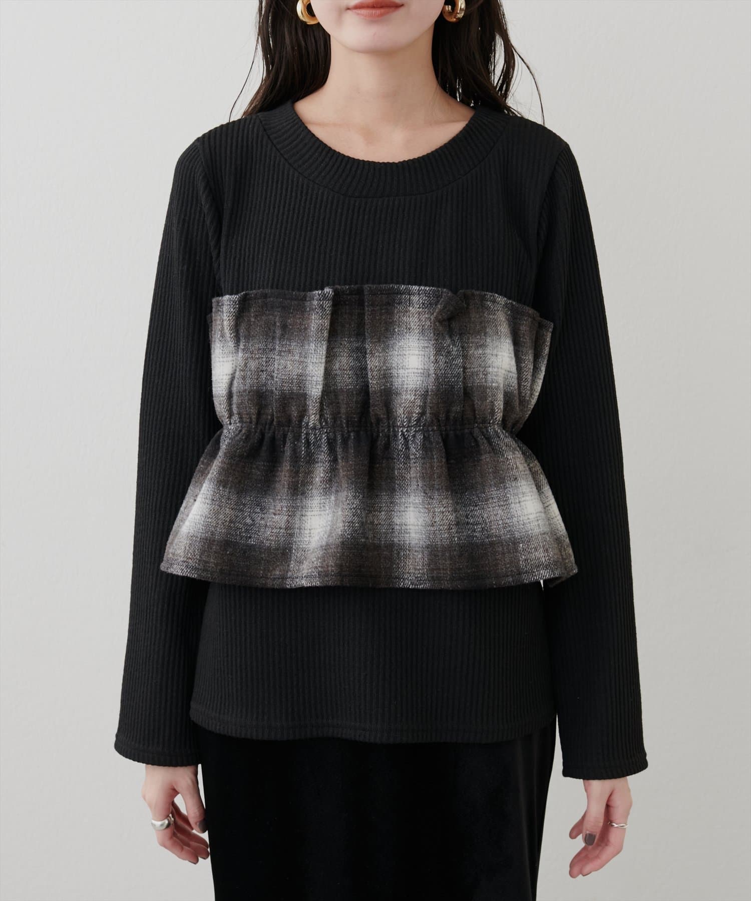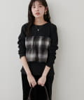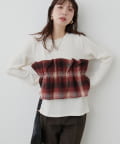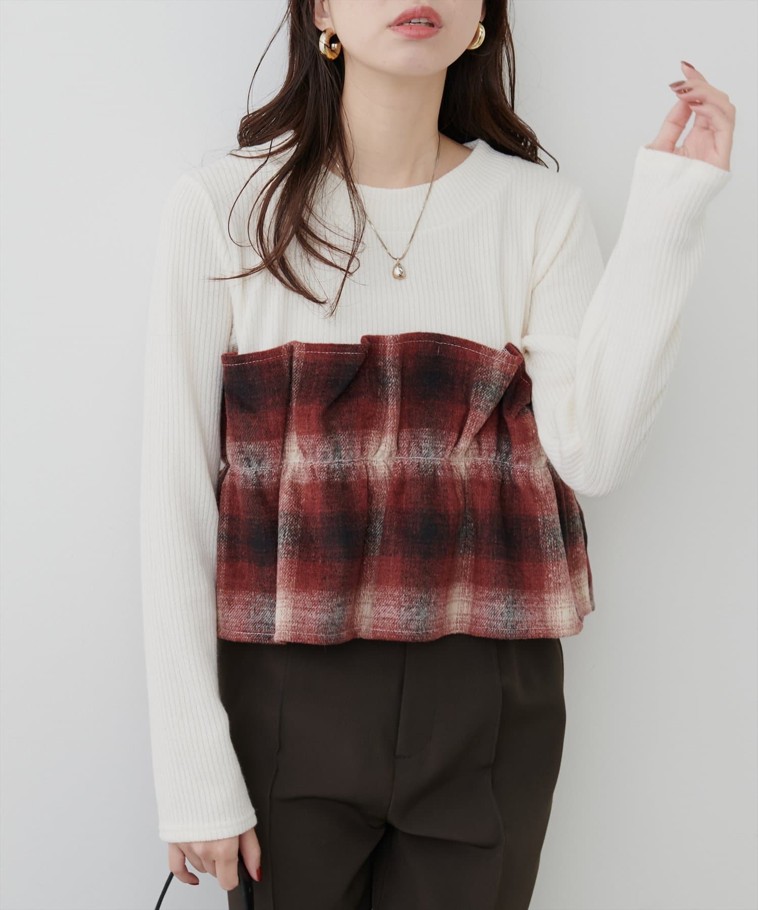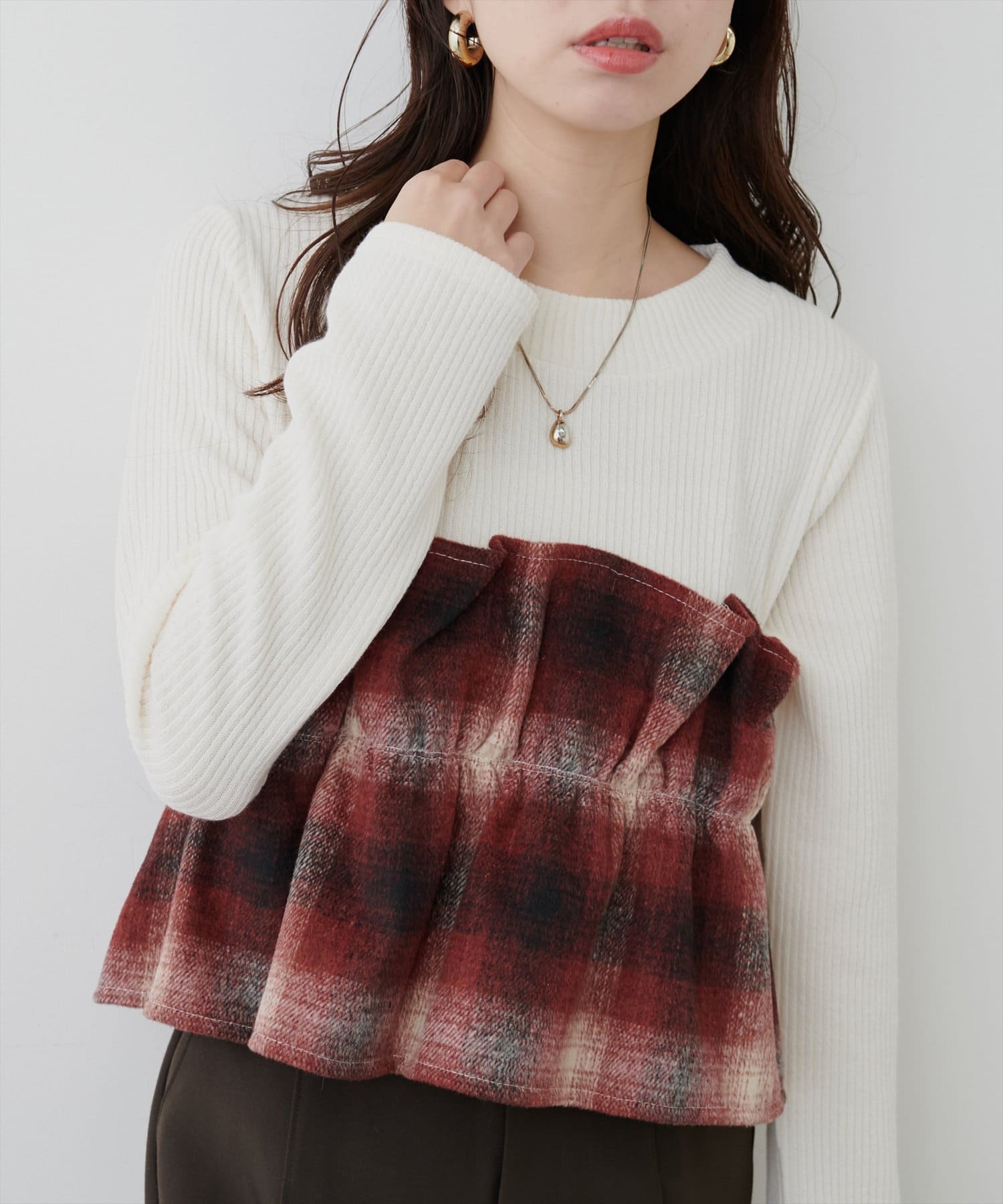 柔らかなリブカットトップスとやや起毛がかったチェック素材をドッキングしたビスチェ風トップス。