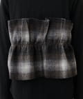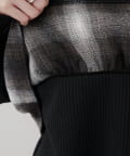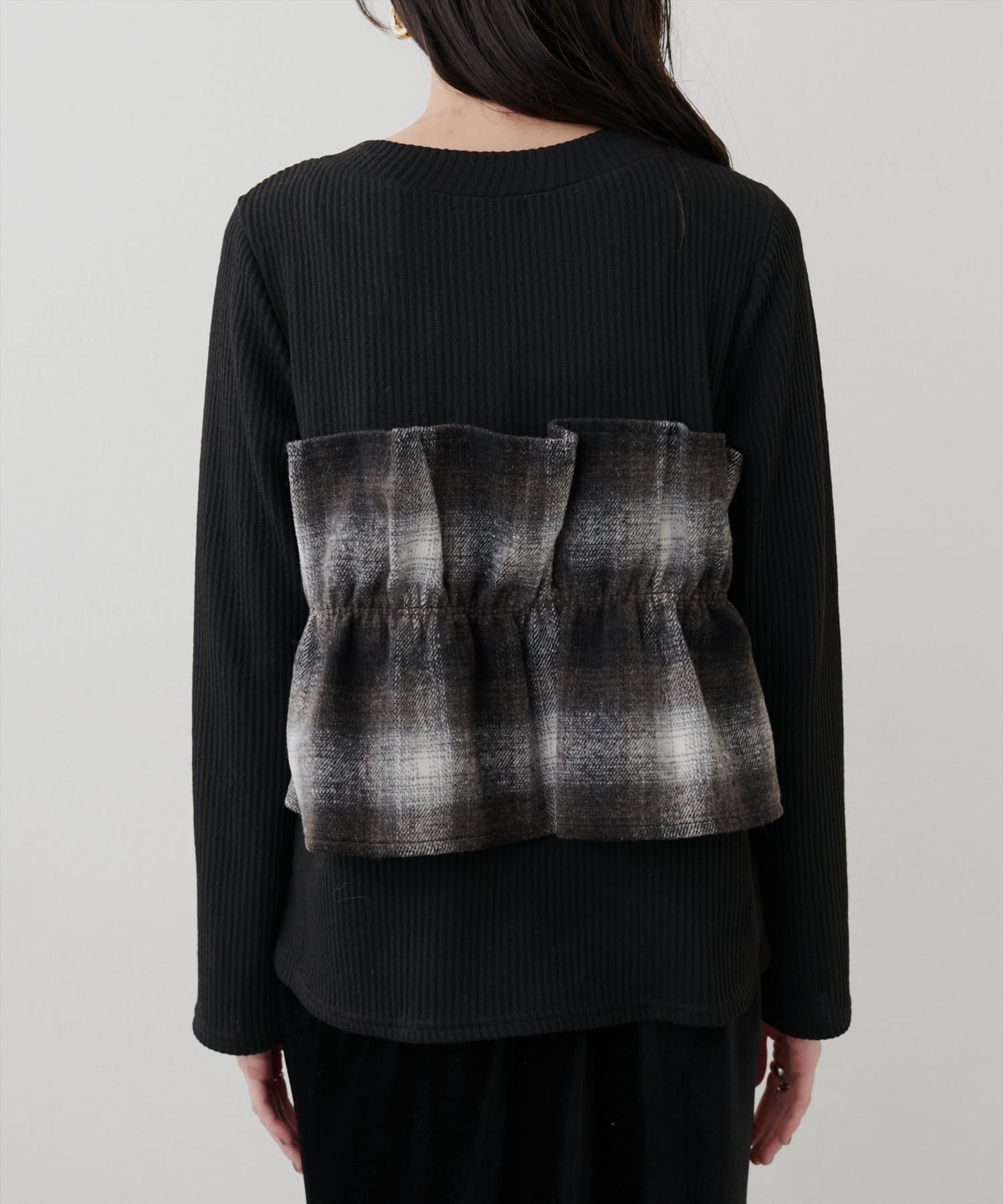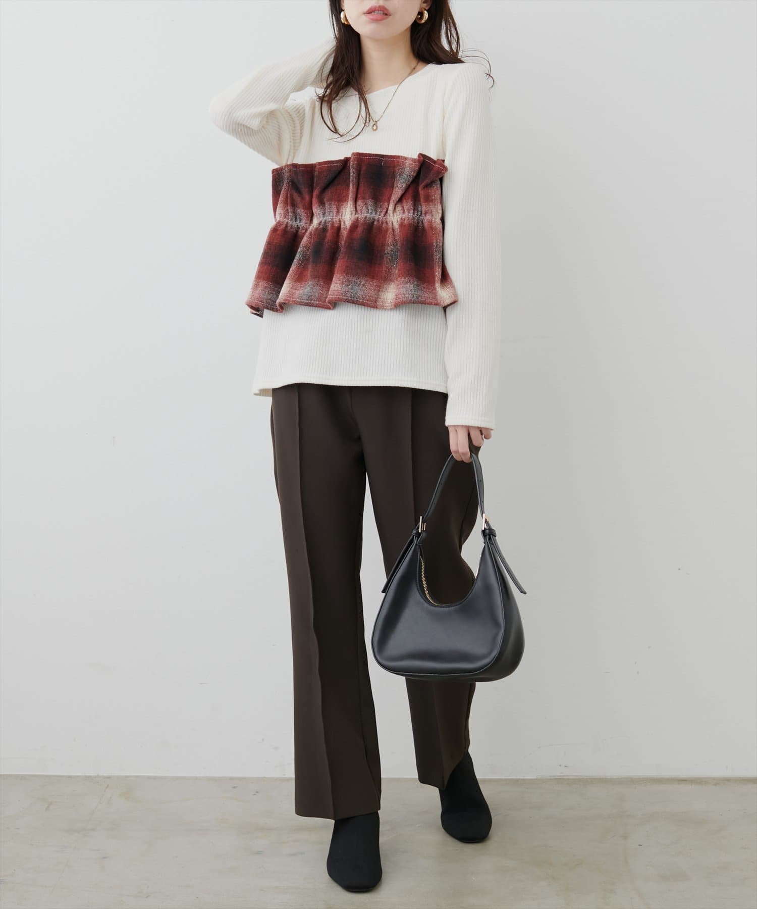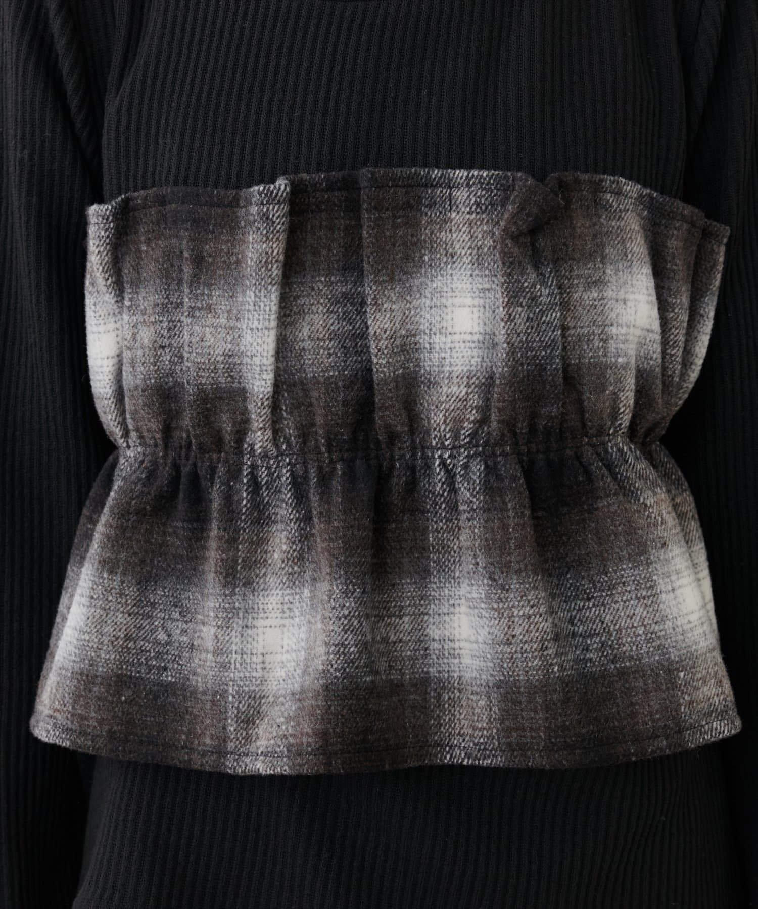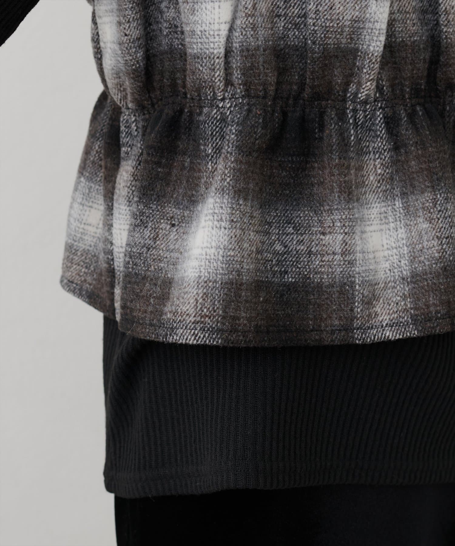 柔らかなリブカットトップスとやや起毛がかったチェック素材をドッキングしたビスチェ風トップス。