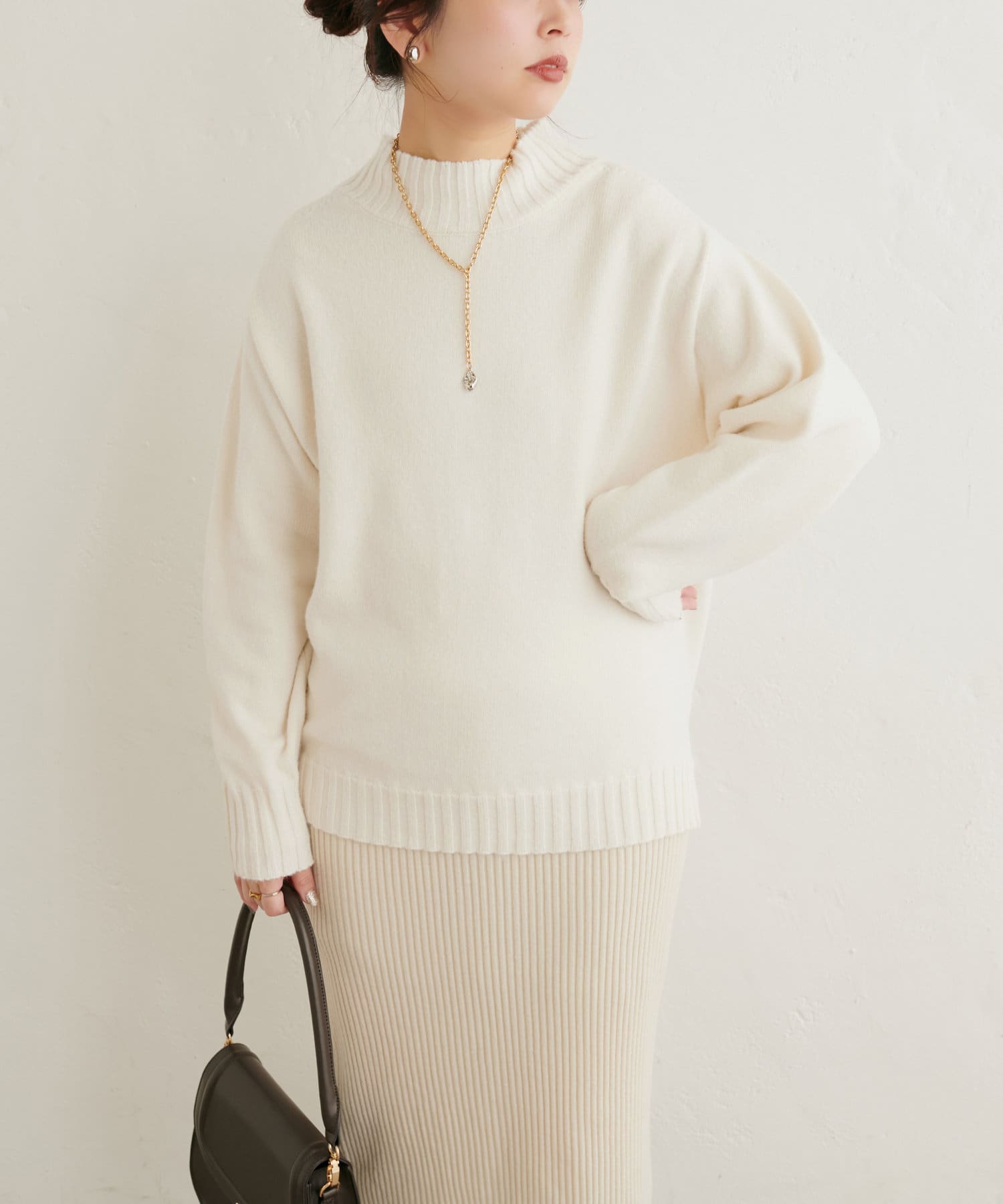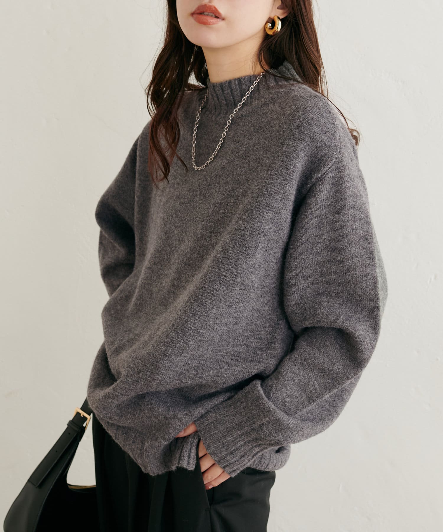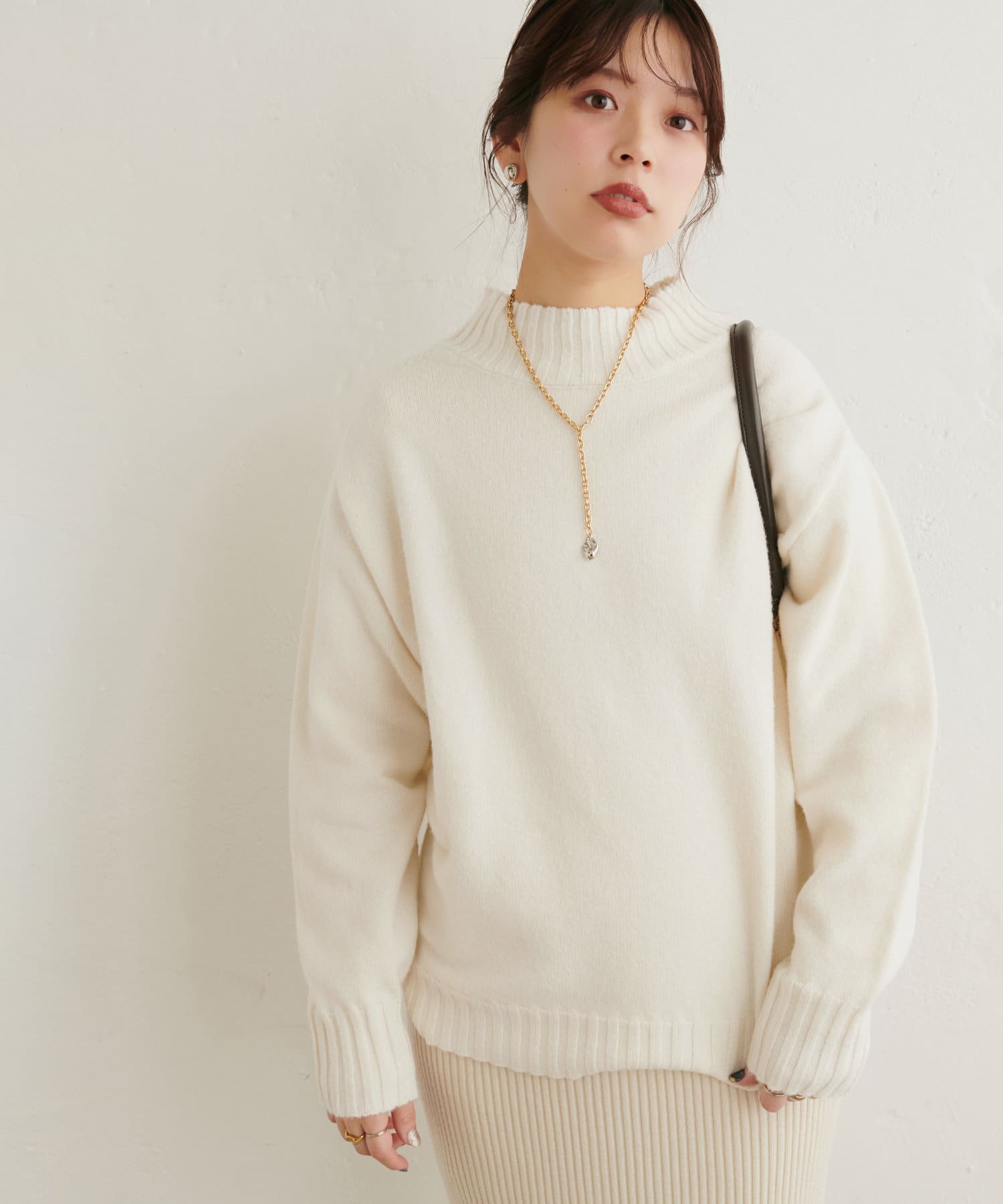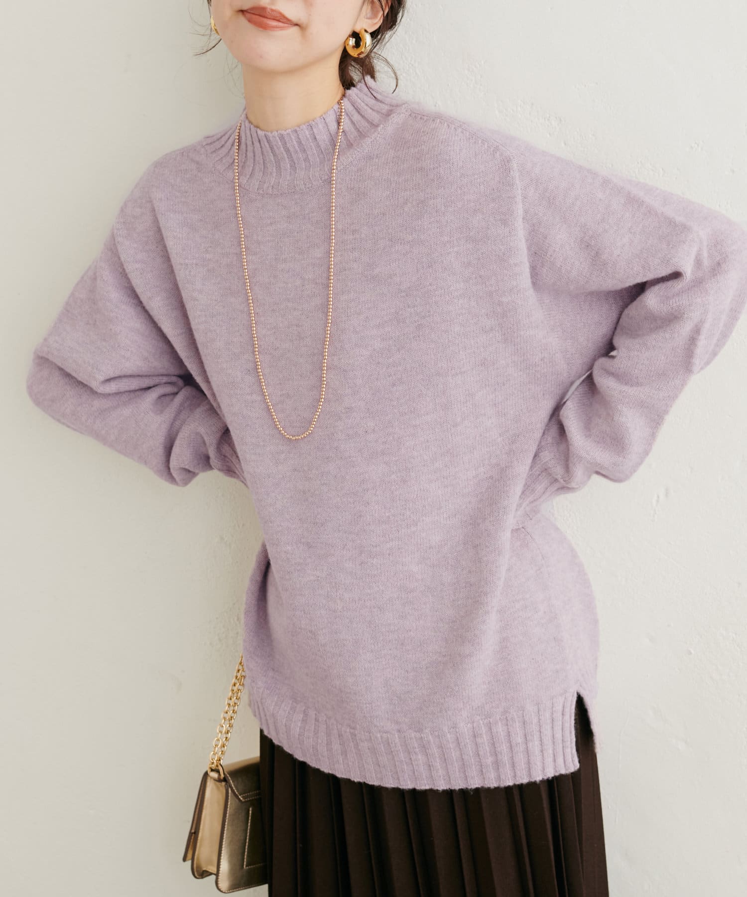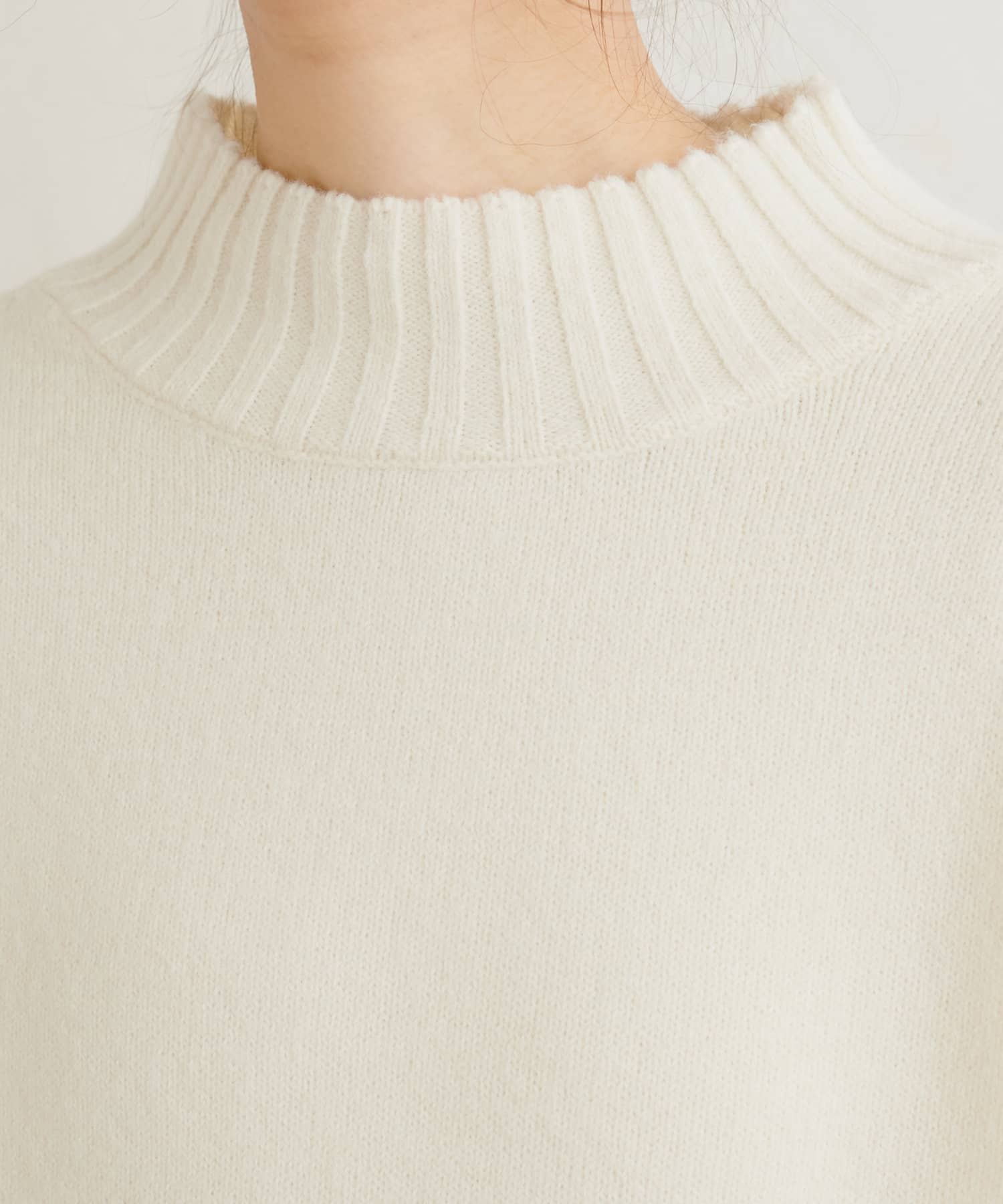 顔周りをすっきりと見せてくれる広めのハイネックと