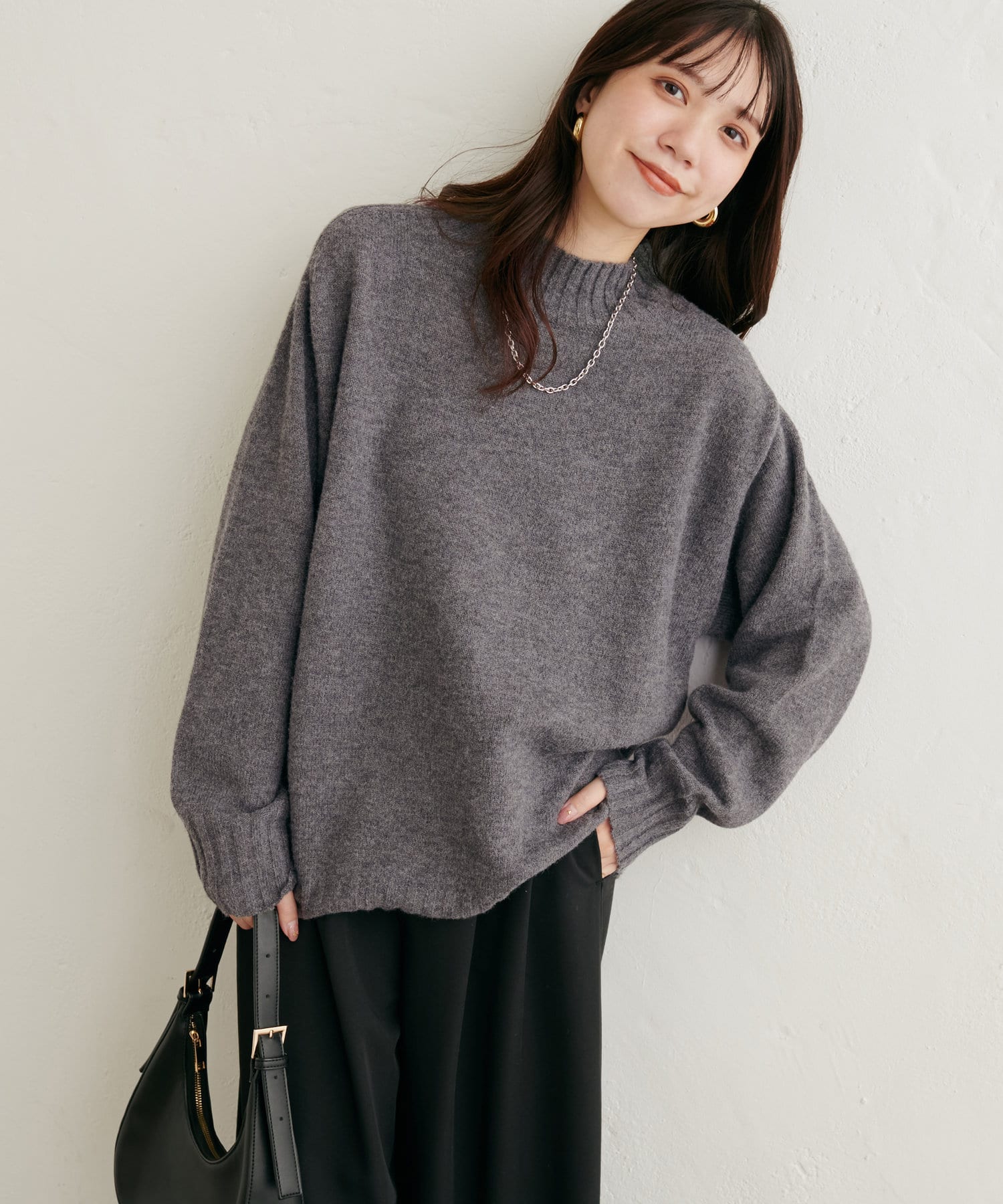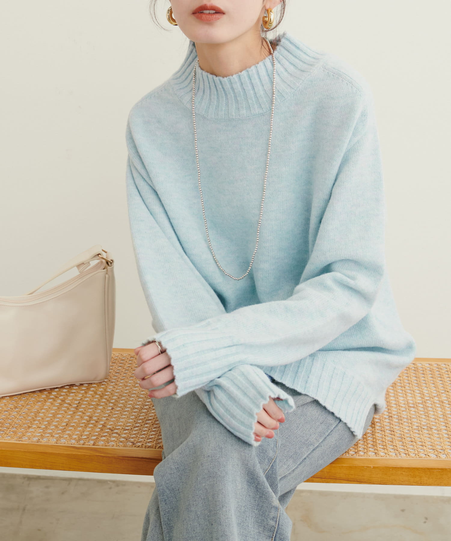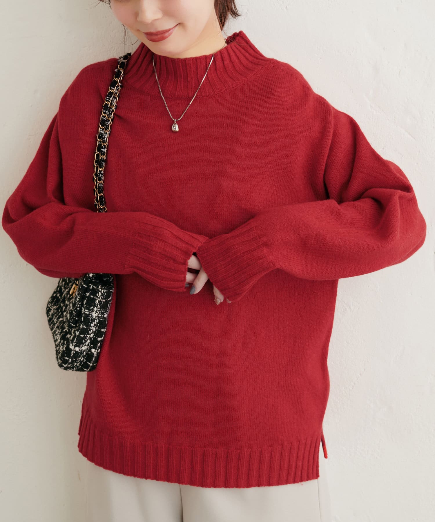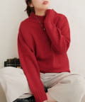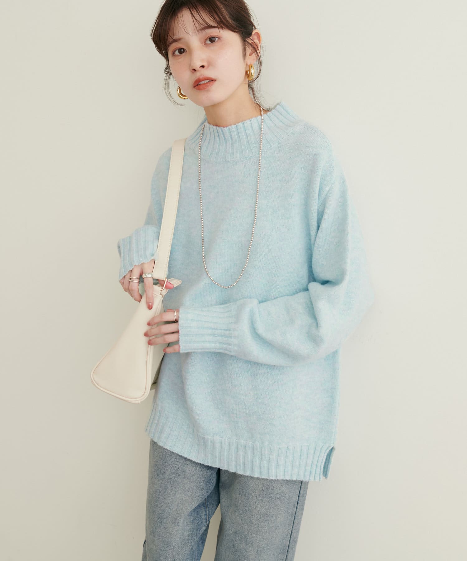 顔周りをすっきりと見せてくれる広めのハイネックと