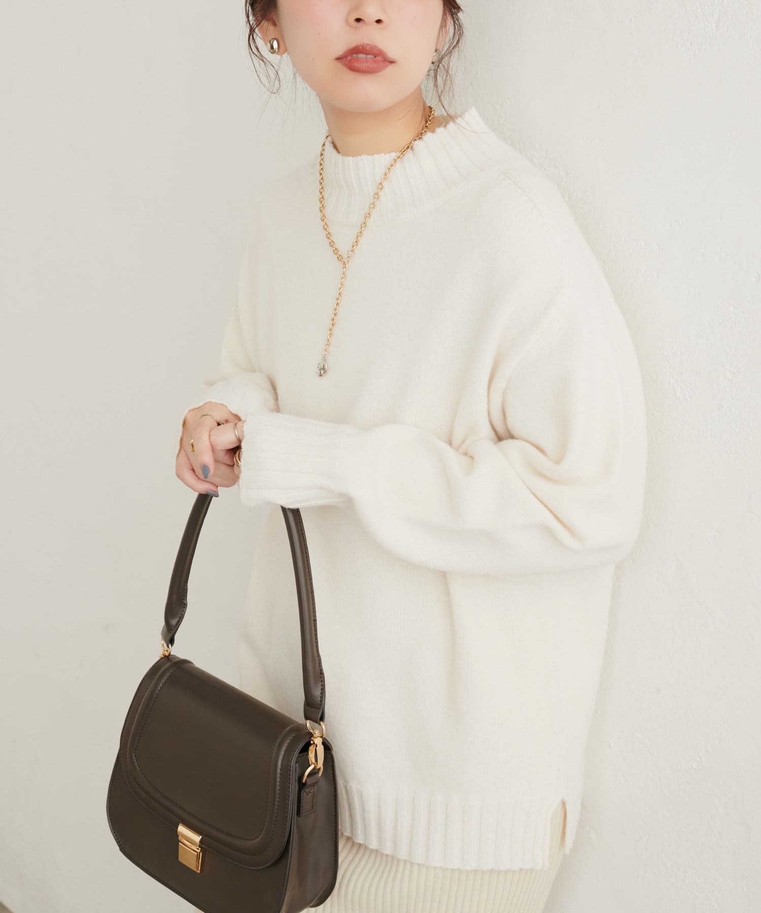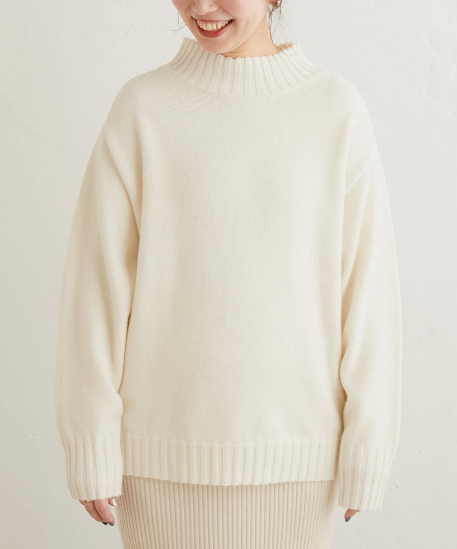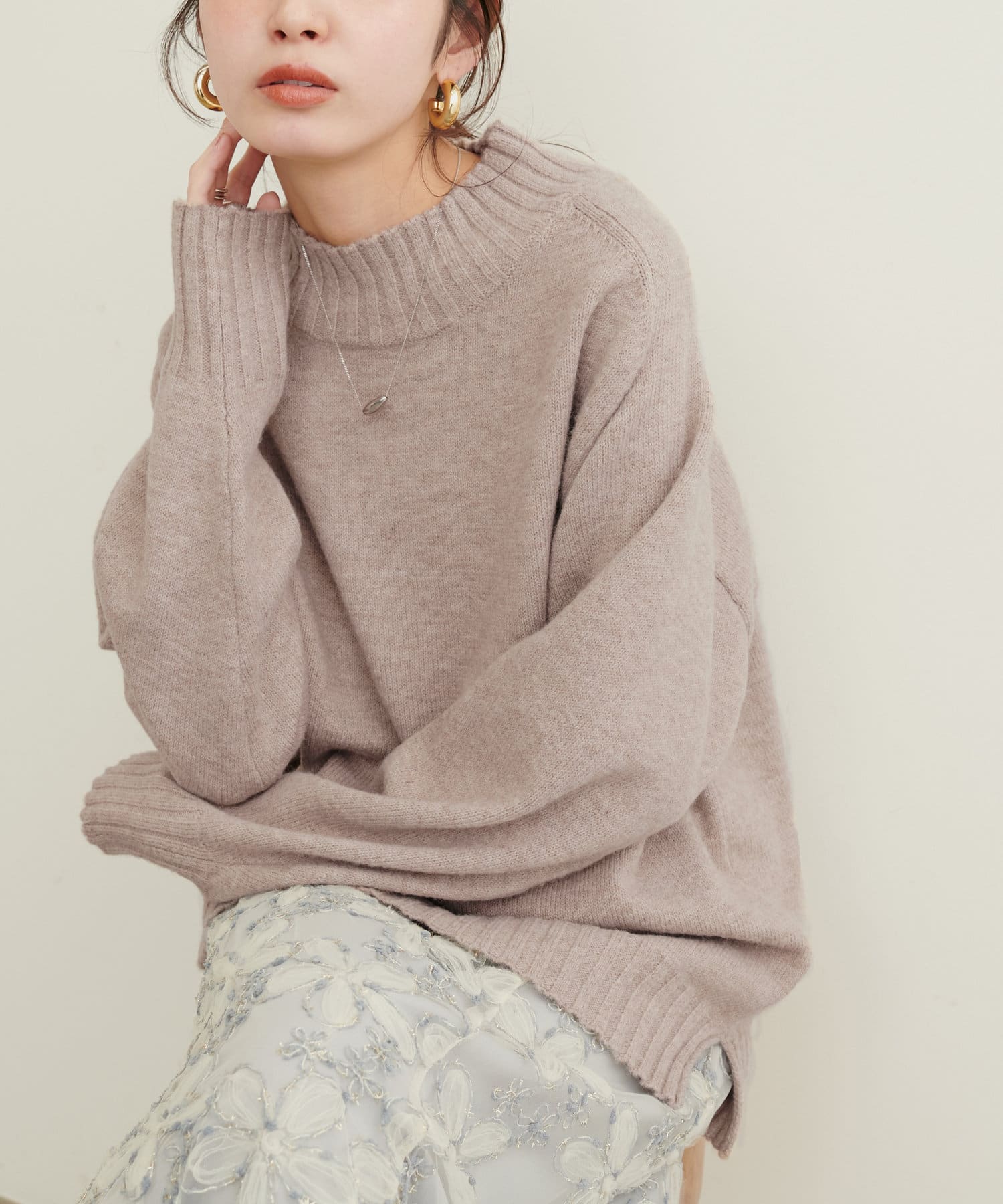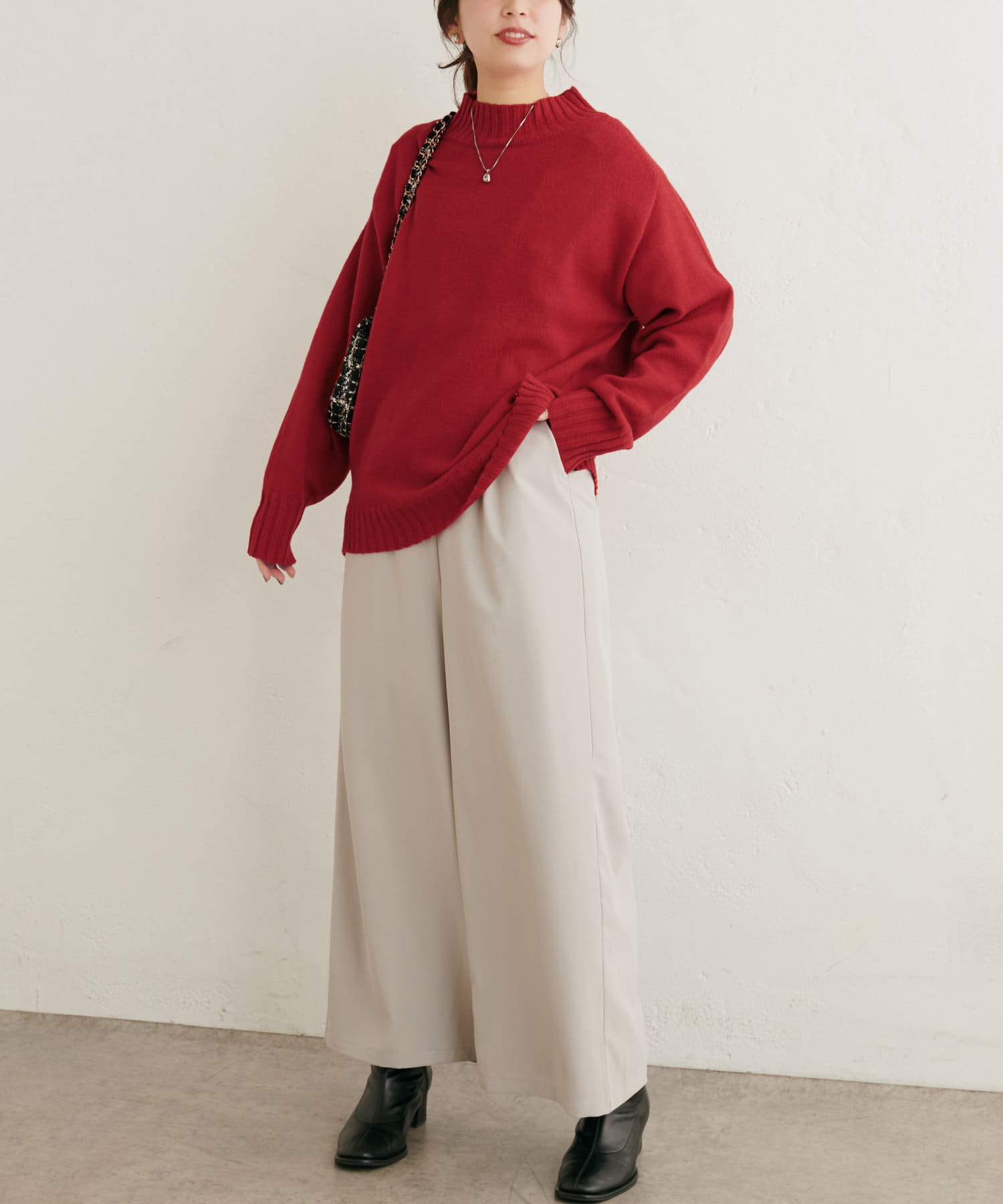 顔周りをすっきりと見せてくれる広めのハイネックと