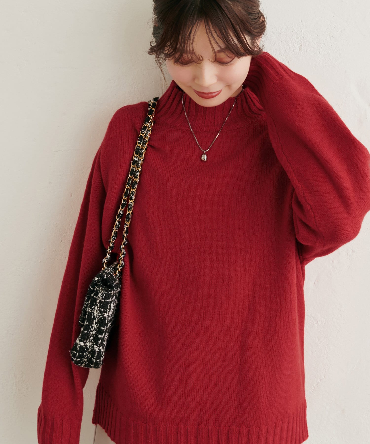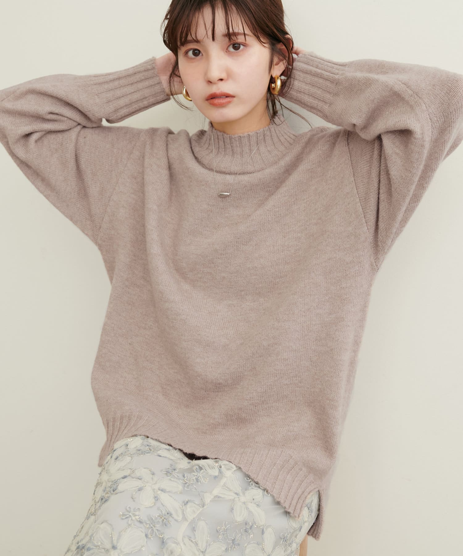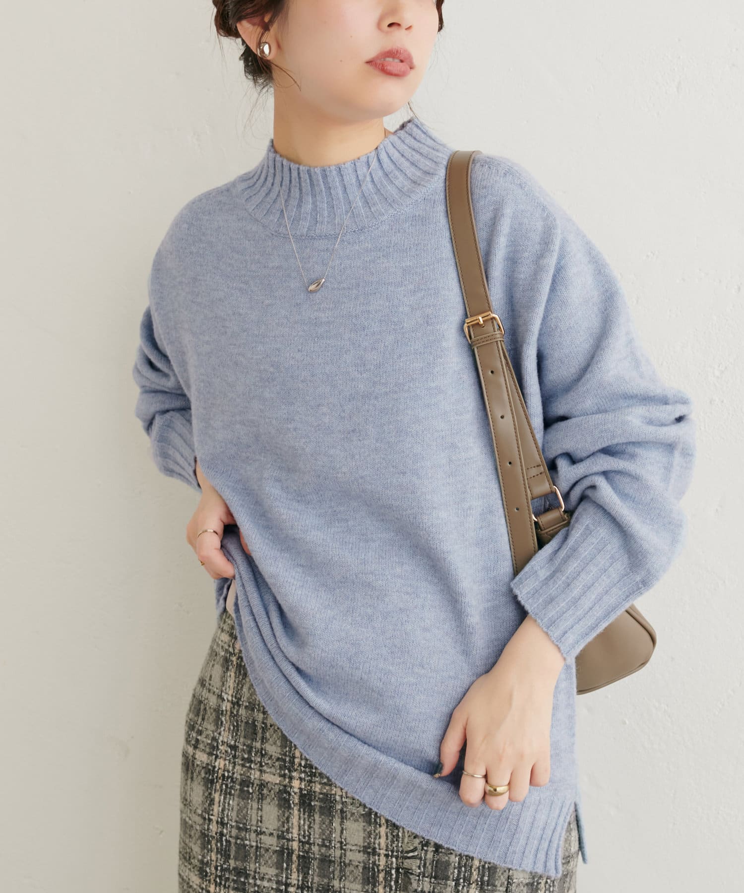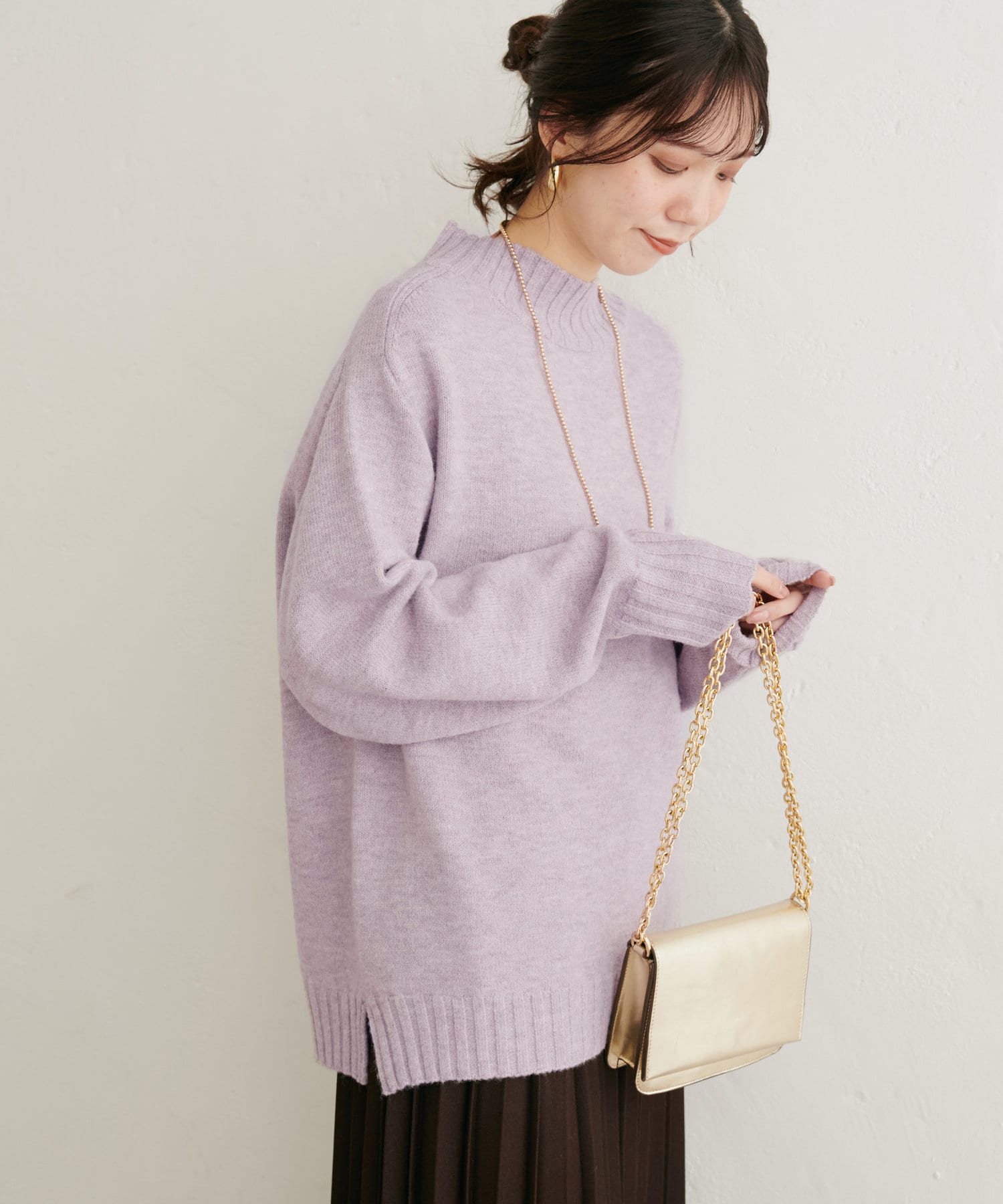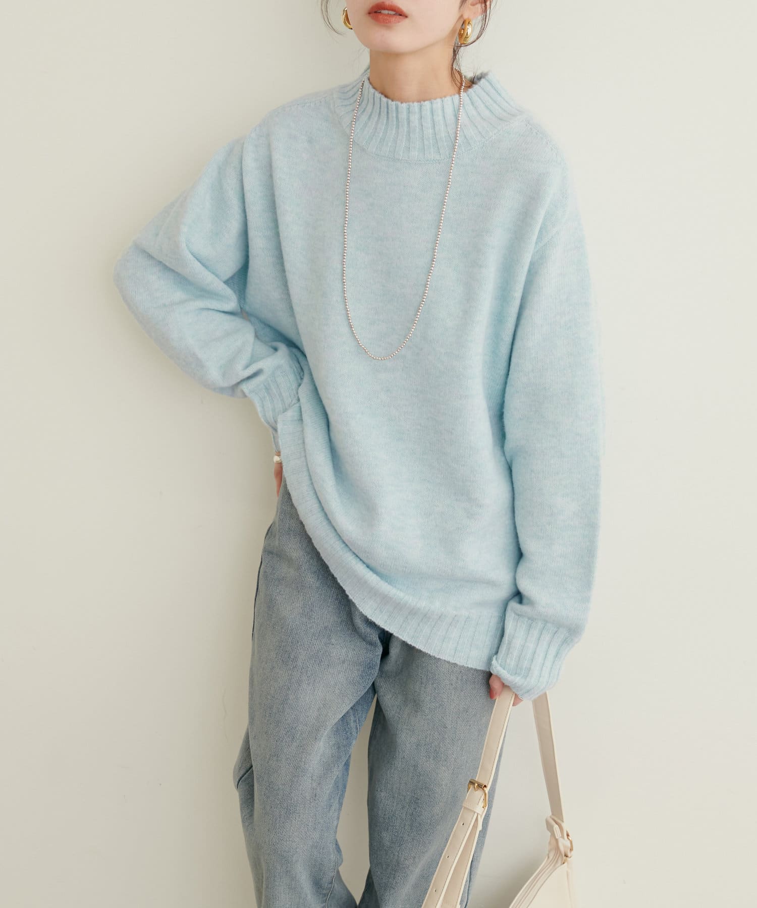 顔周りをすっきりと見せてくれる広めのハイネックと