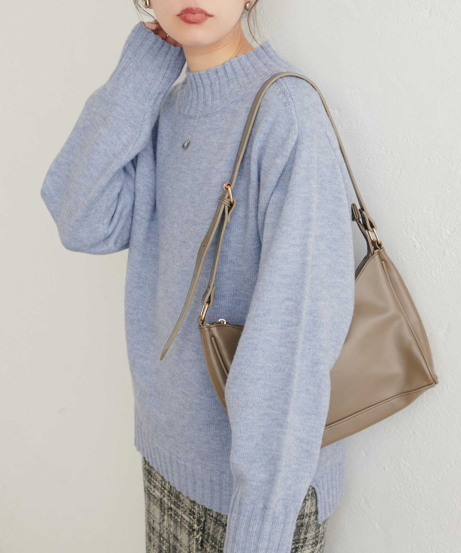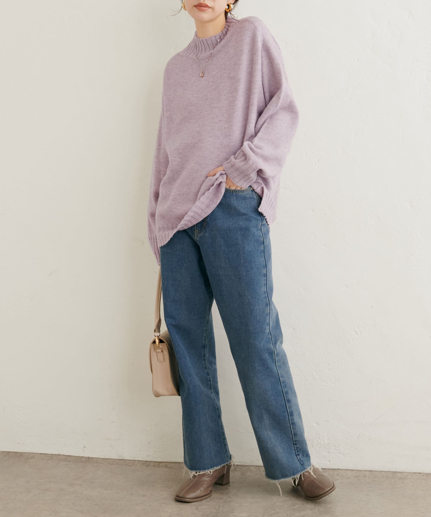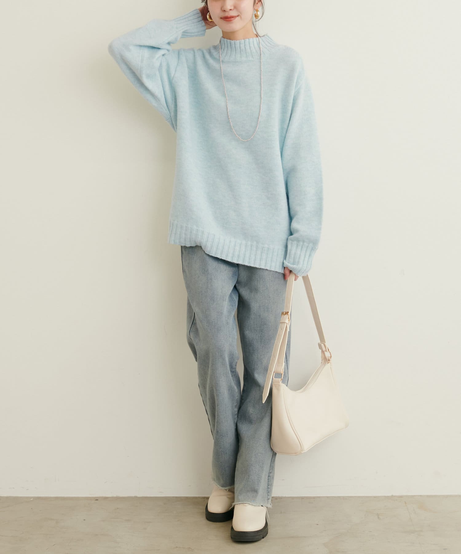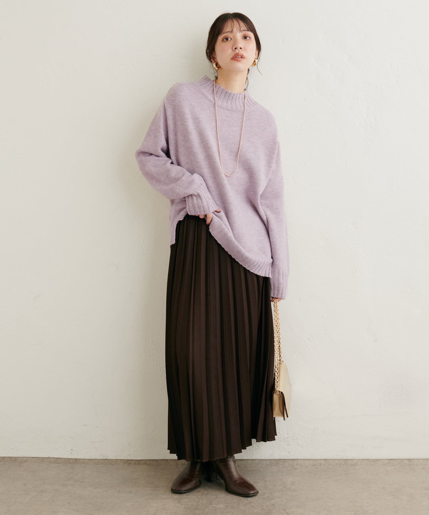 顔周りをすっきりと見せてくれる広めのハイネックと