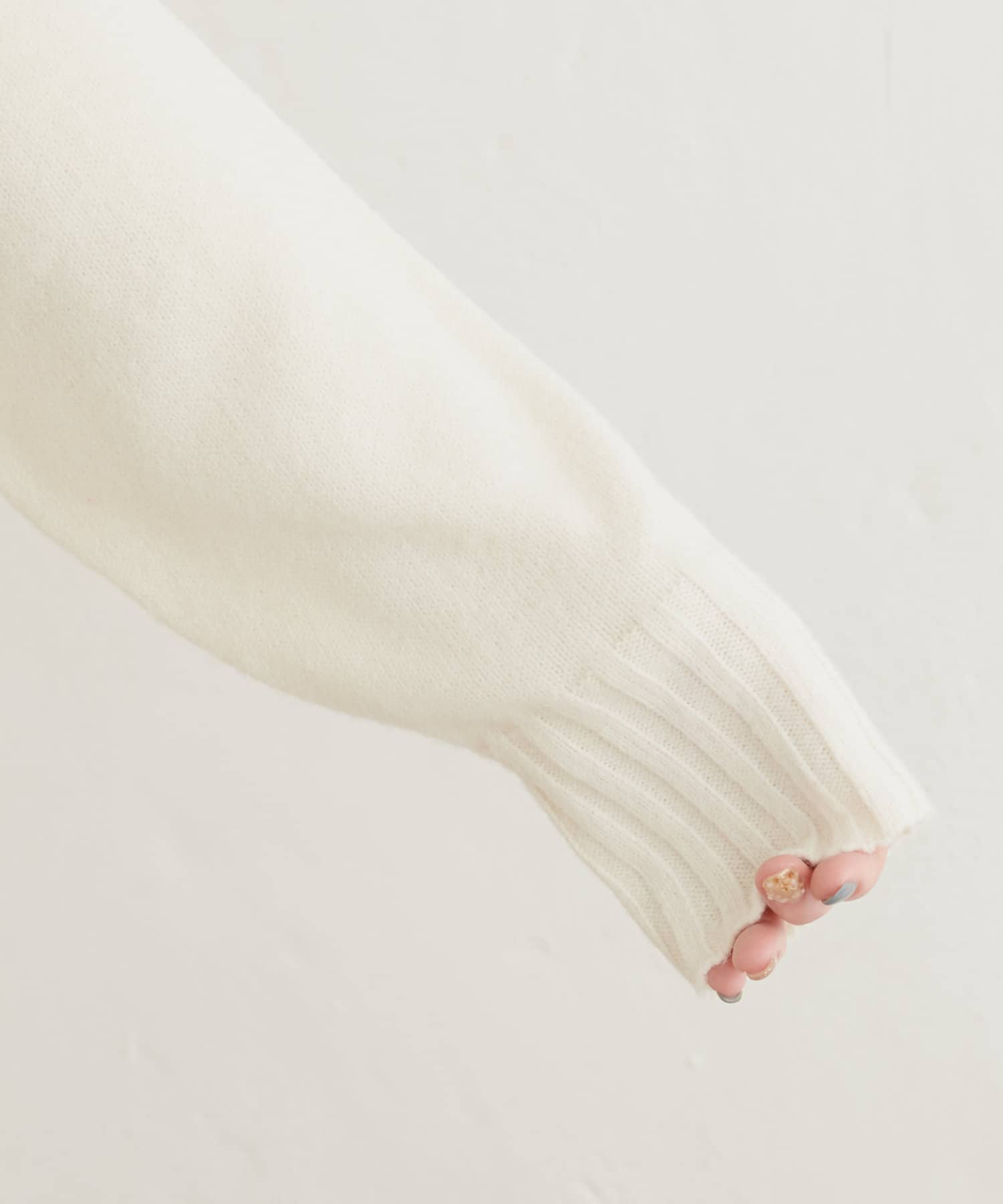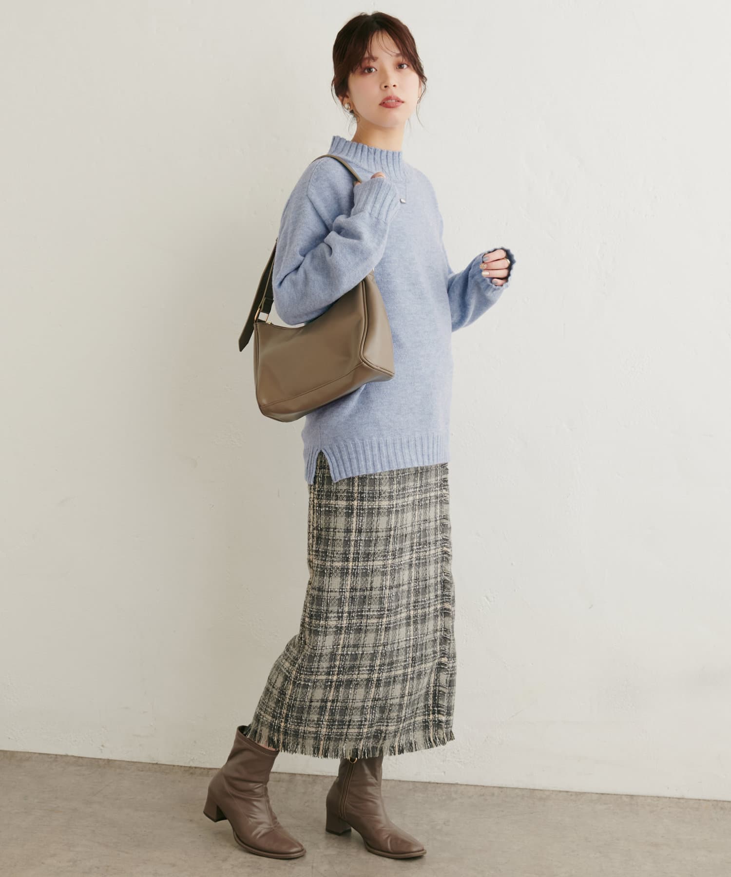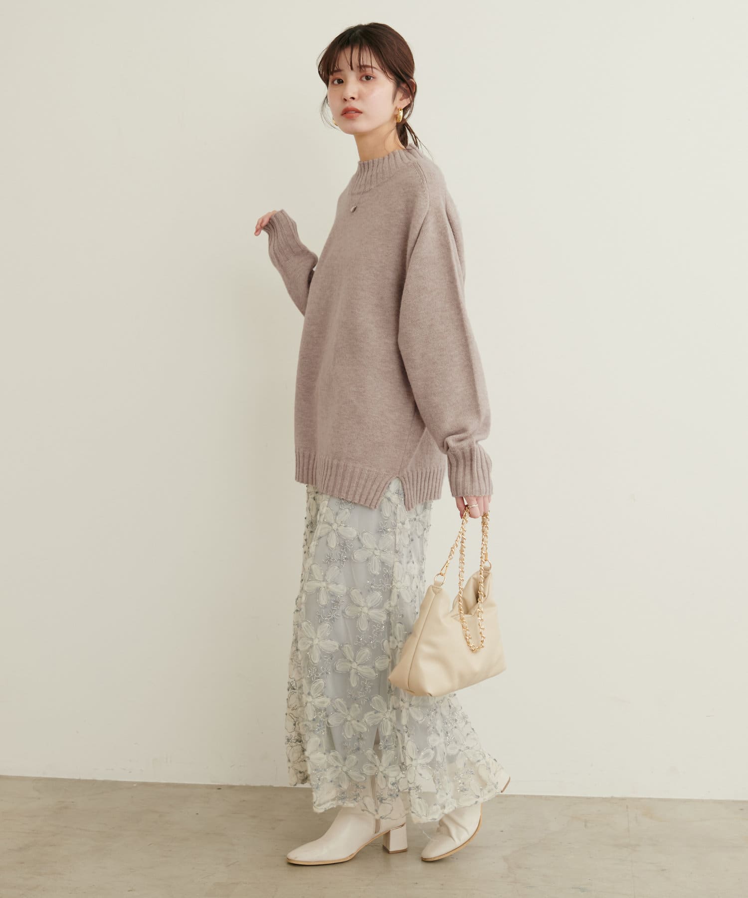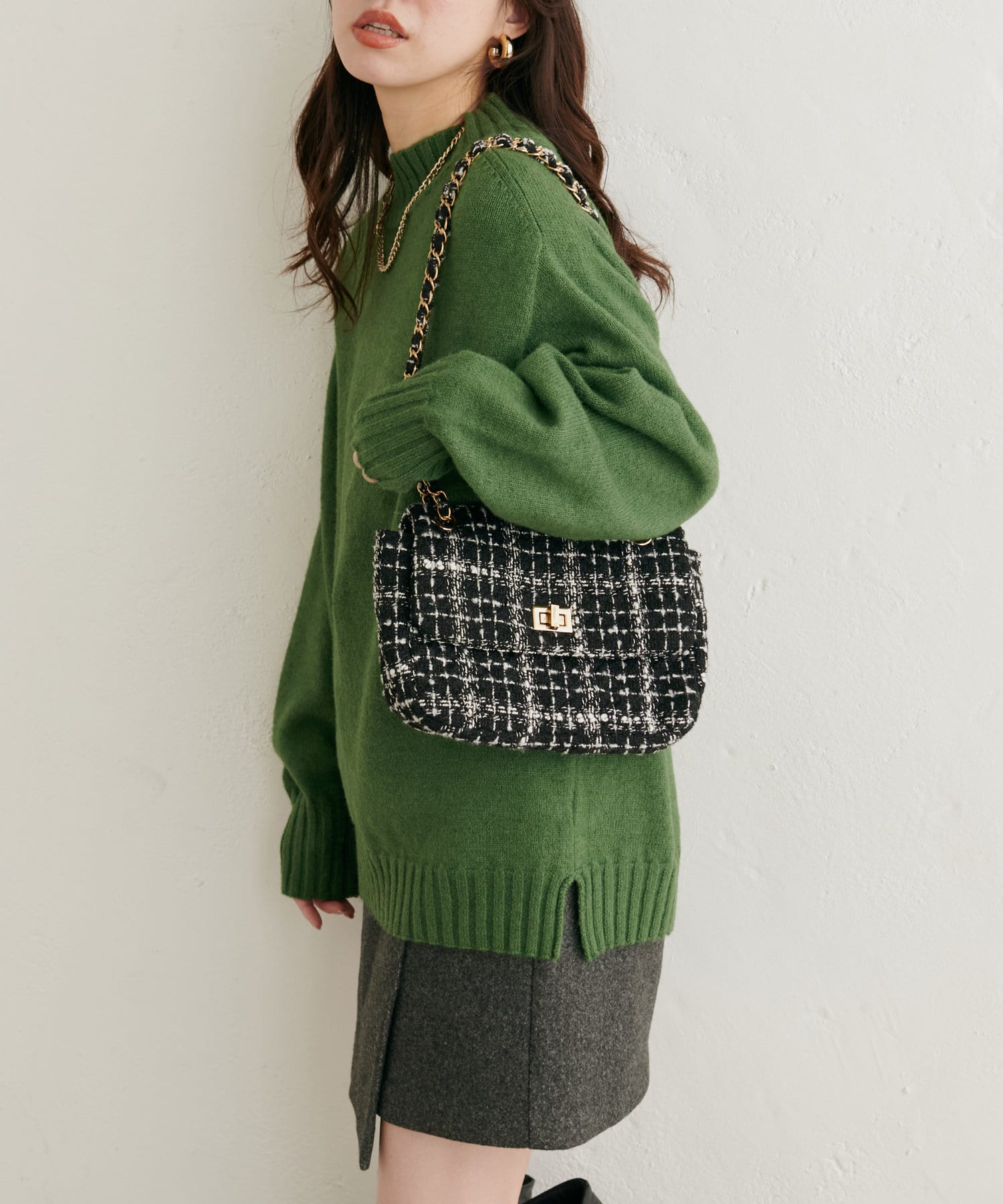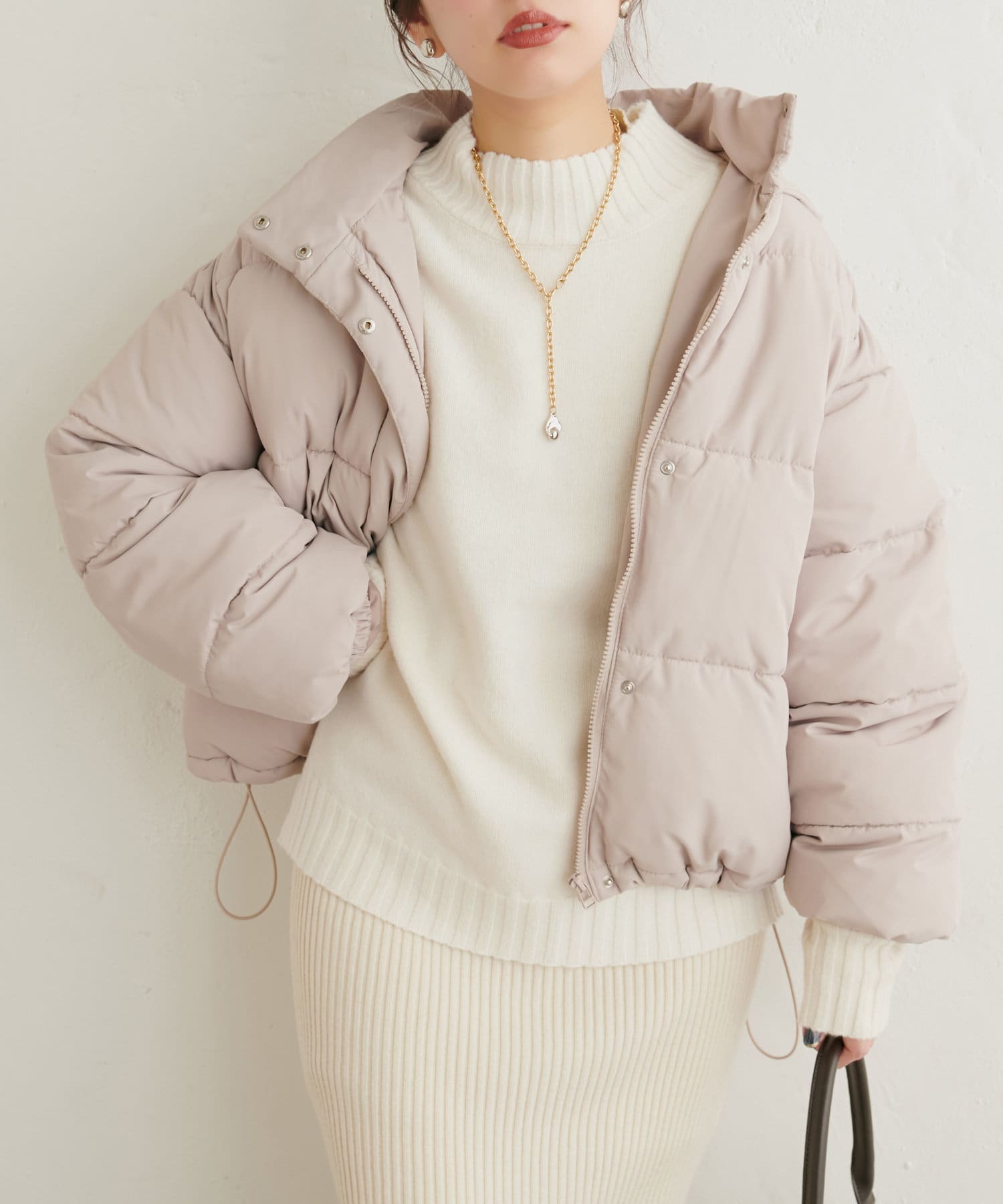 顔周りをすっきりと見せてくれる広めのハイネックと