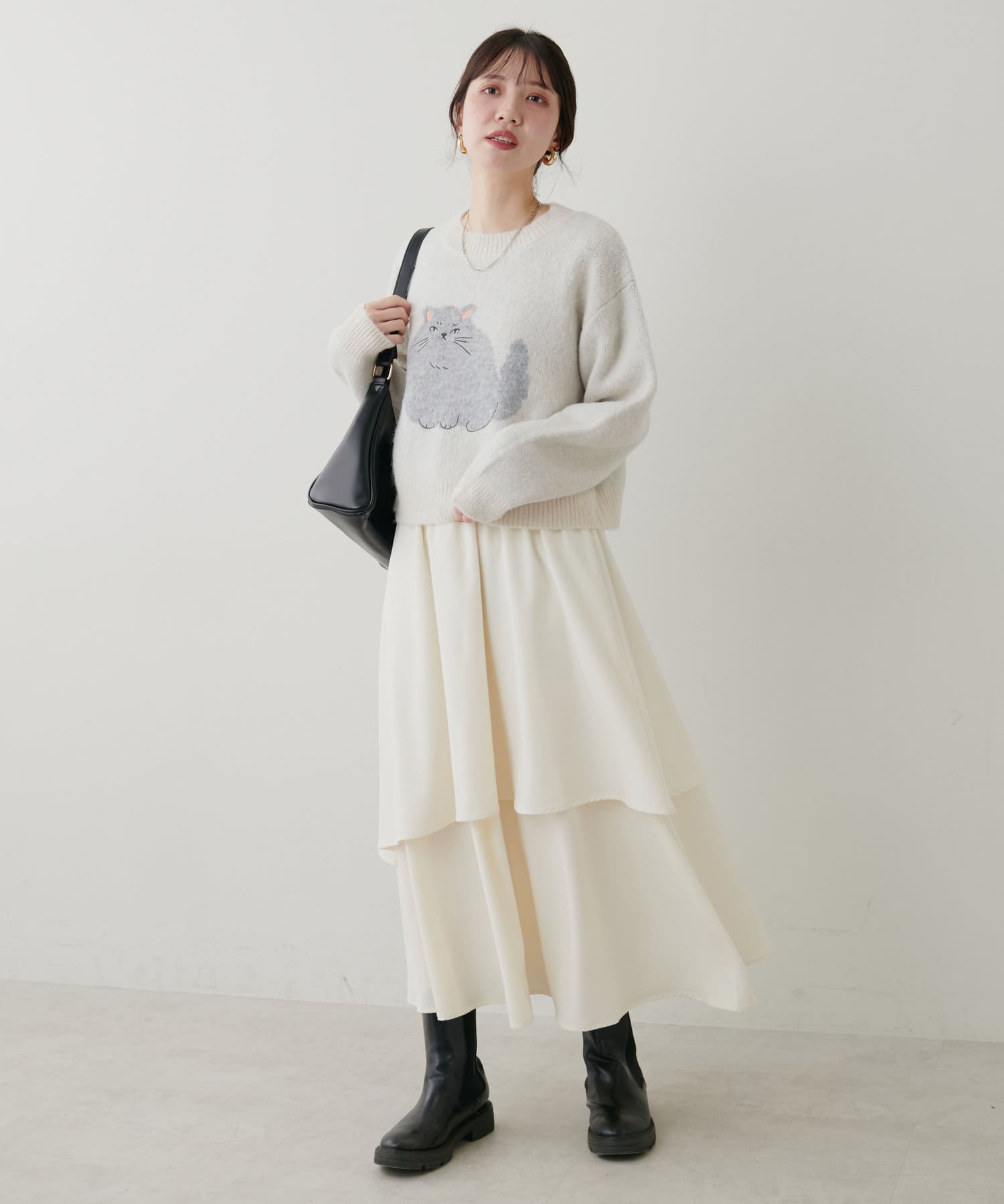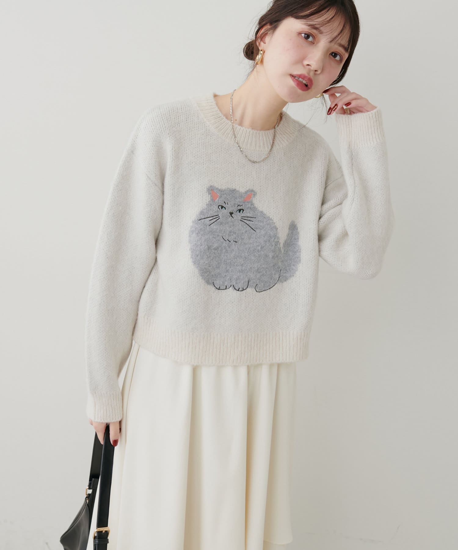 アンニュイな雰囲気のねこモチーフが可愛らしく、コーディネートのアクセントに。