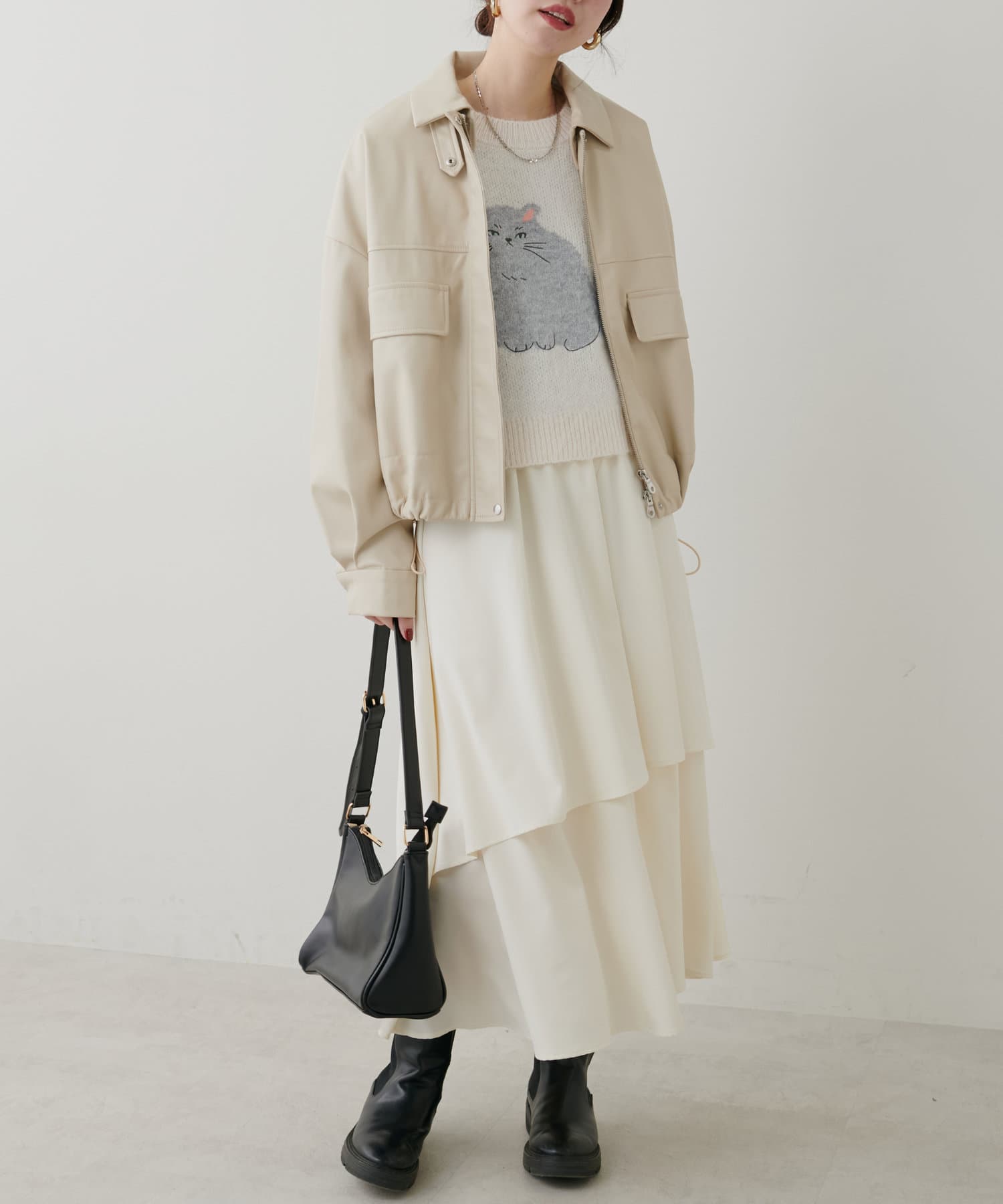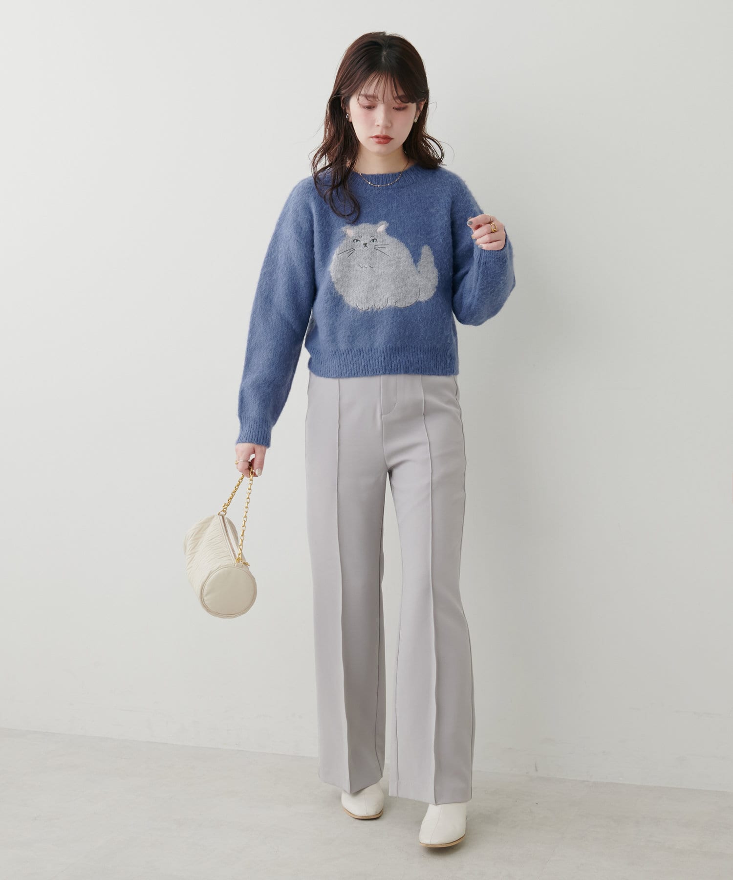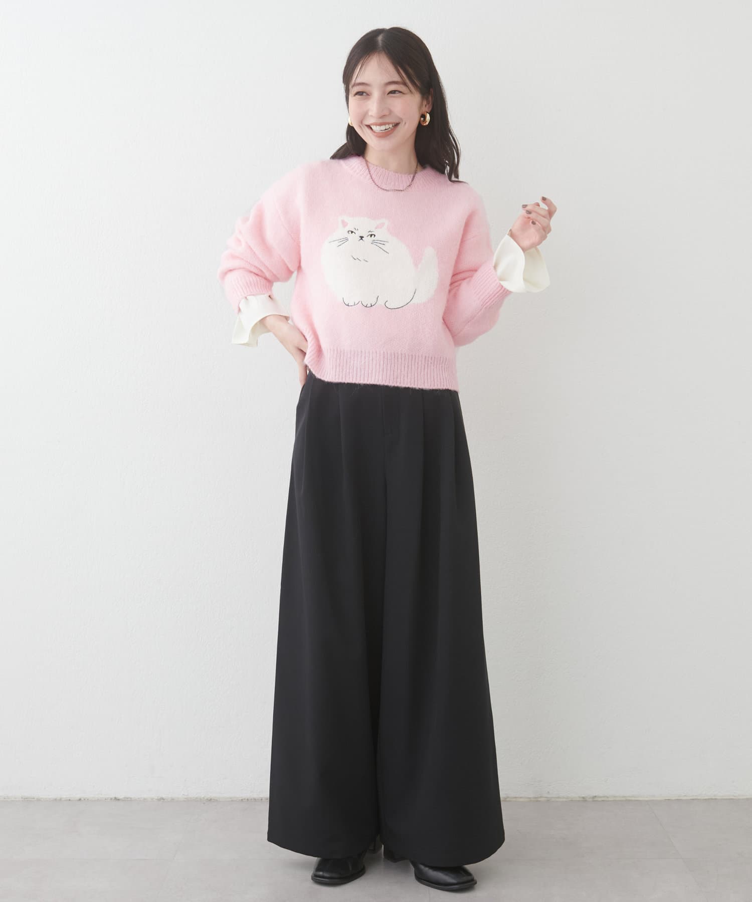 ねこモチーフがキャッチーな印象なので、ボトムはシンプルなアイテムを選ぶと好相性◎