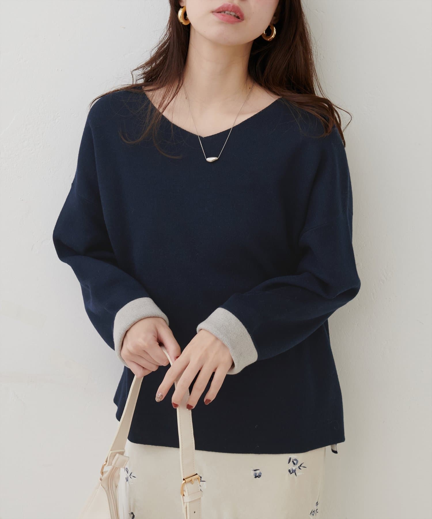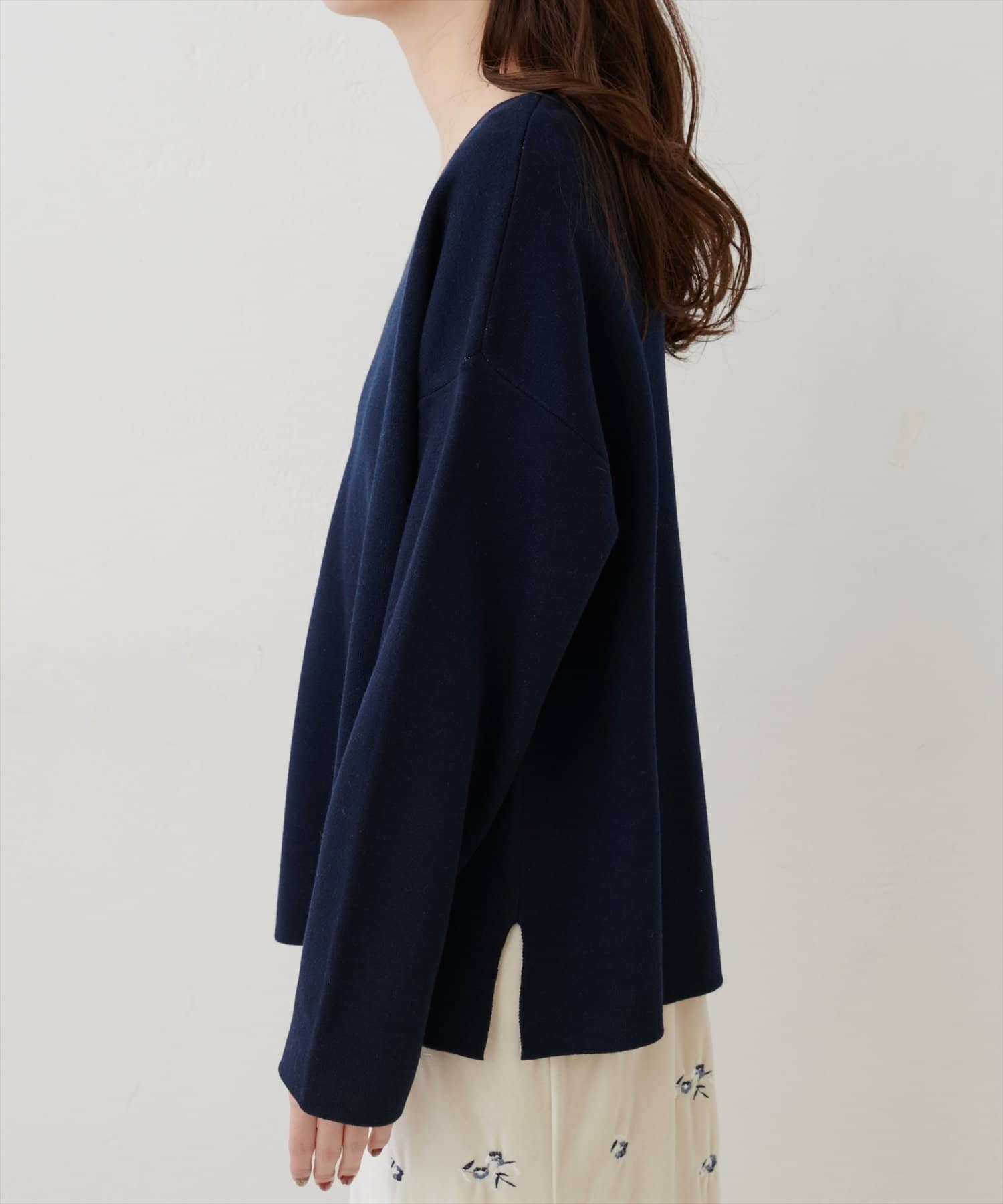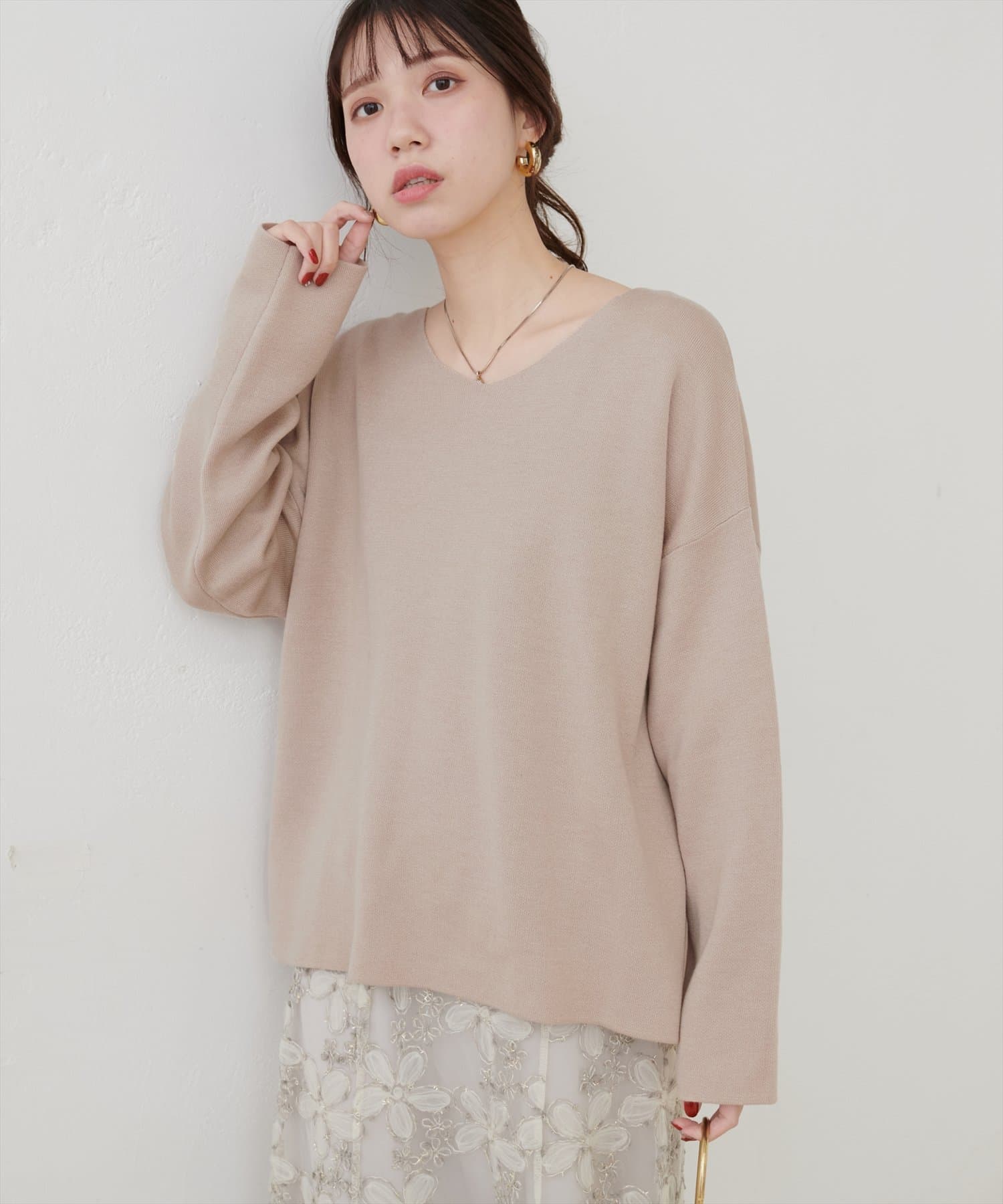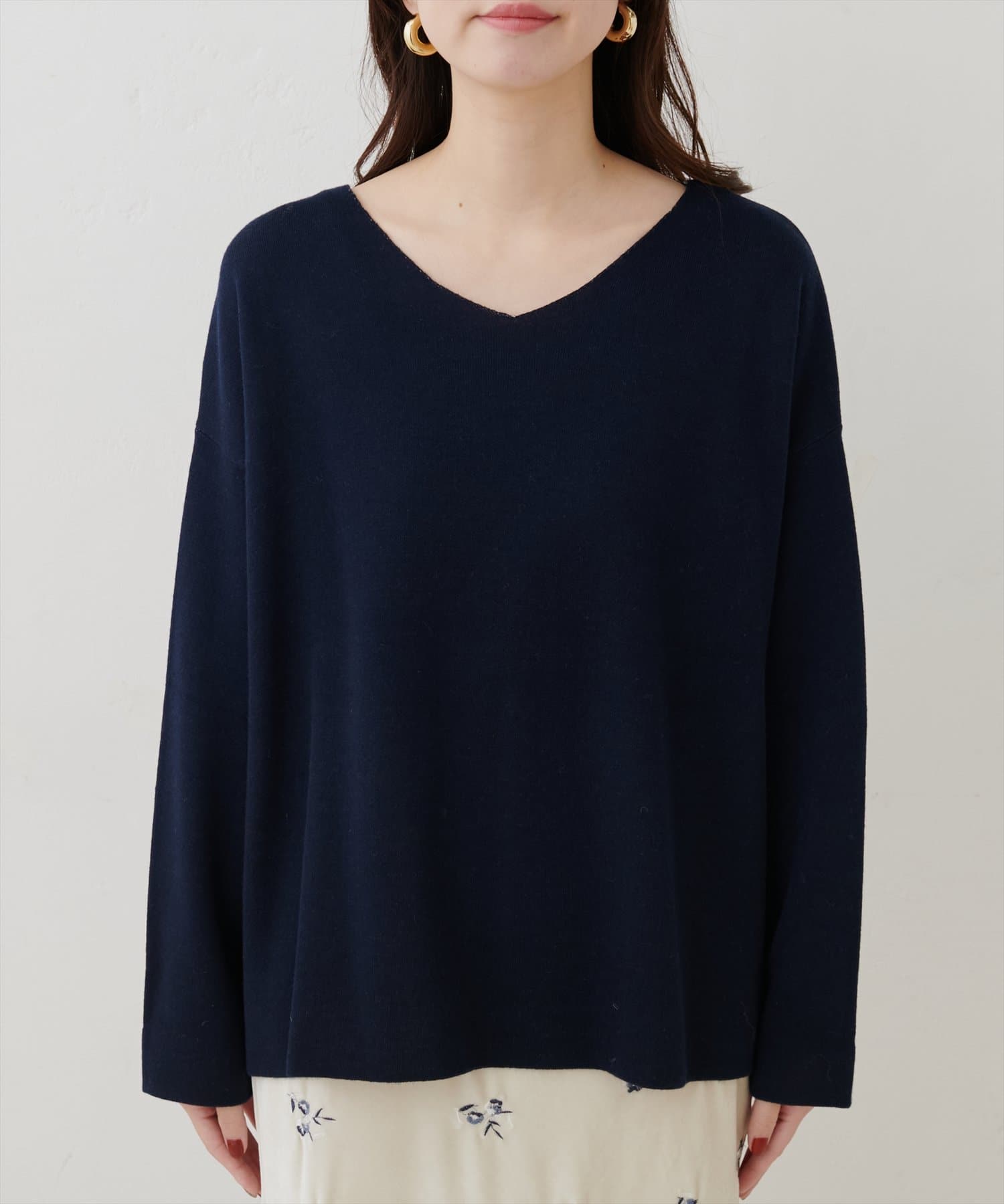 顔まわりをシャープに見せるVネックに、体のラインを拾いすぎないシルエットが重宝する1枚です。