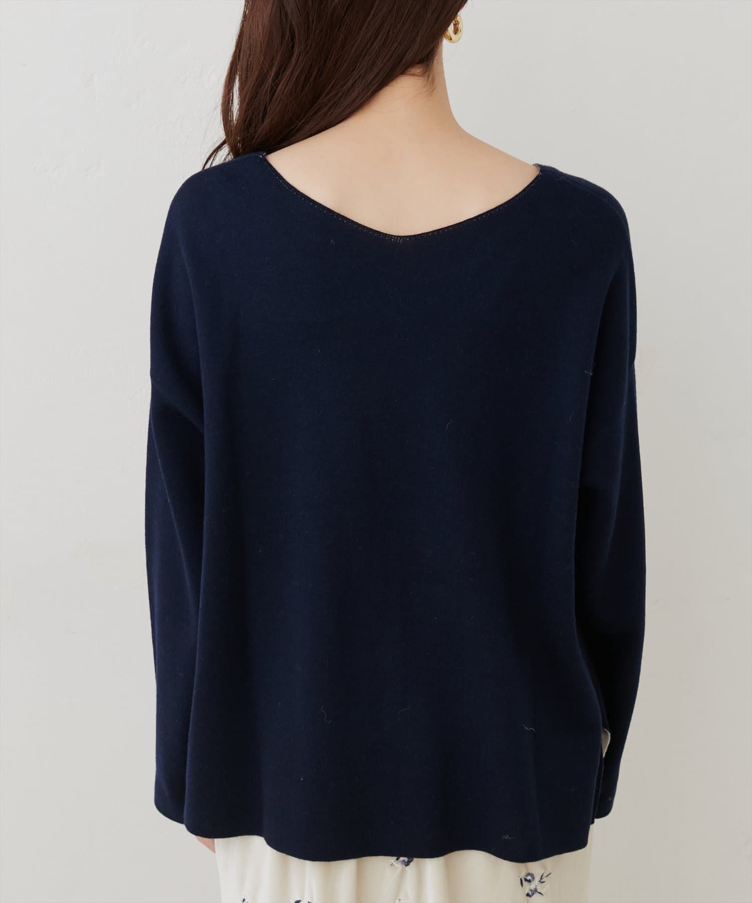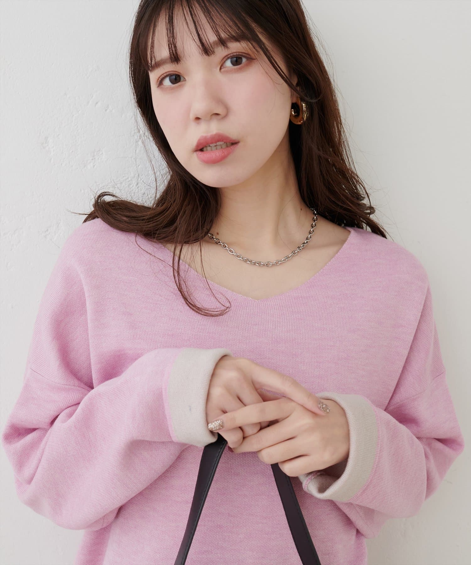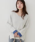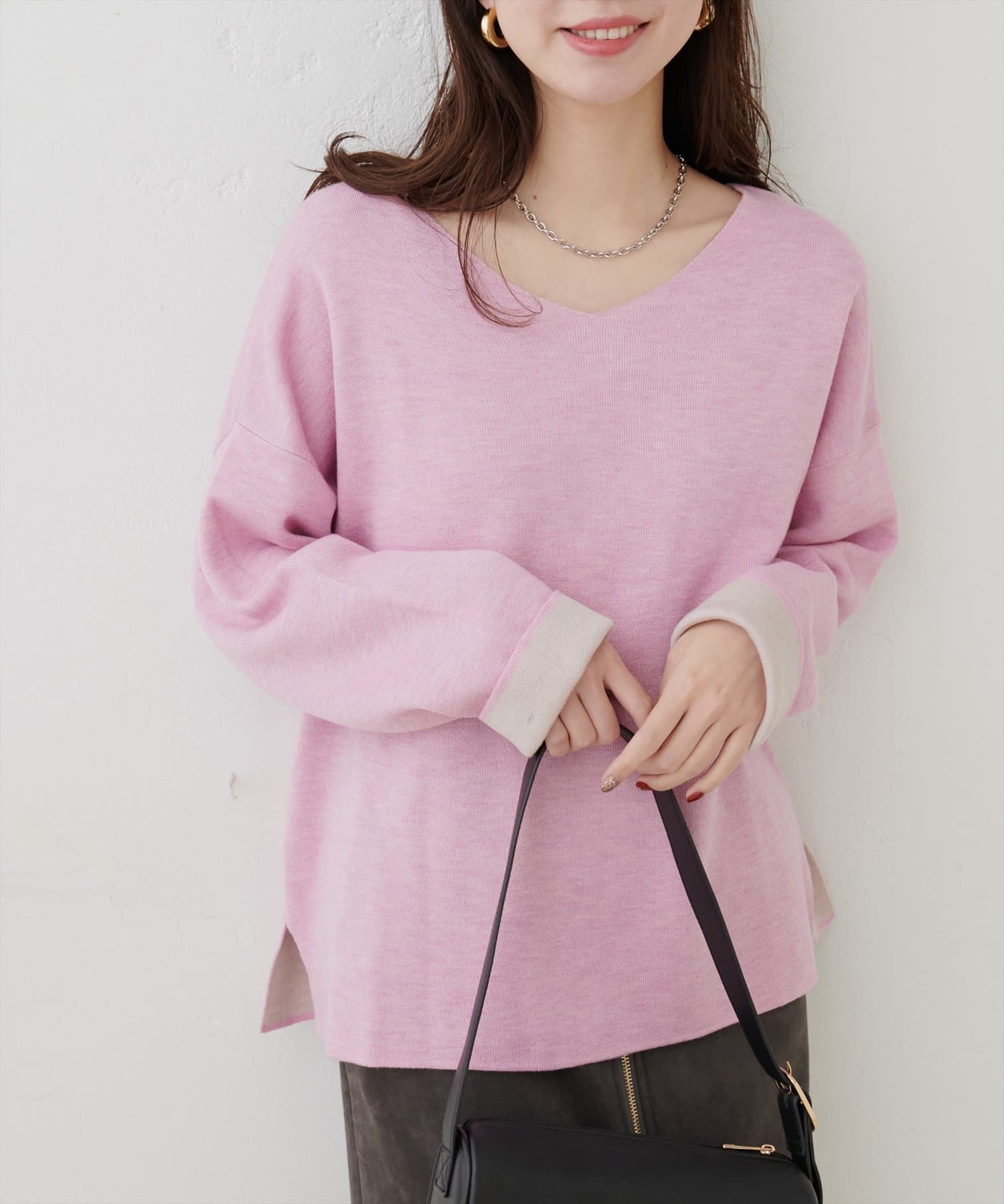 顔まわりをシャープに見せるVネックに、体のラインを拾いすぎないシルエットが重宝する1枚です。