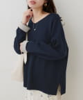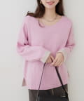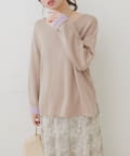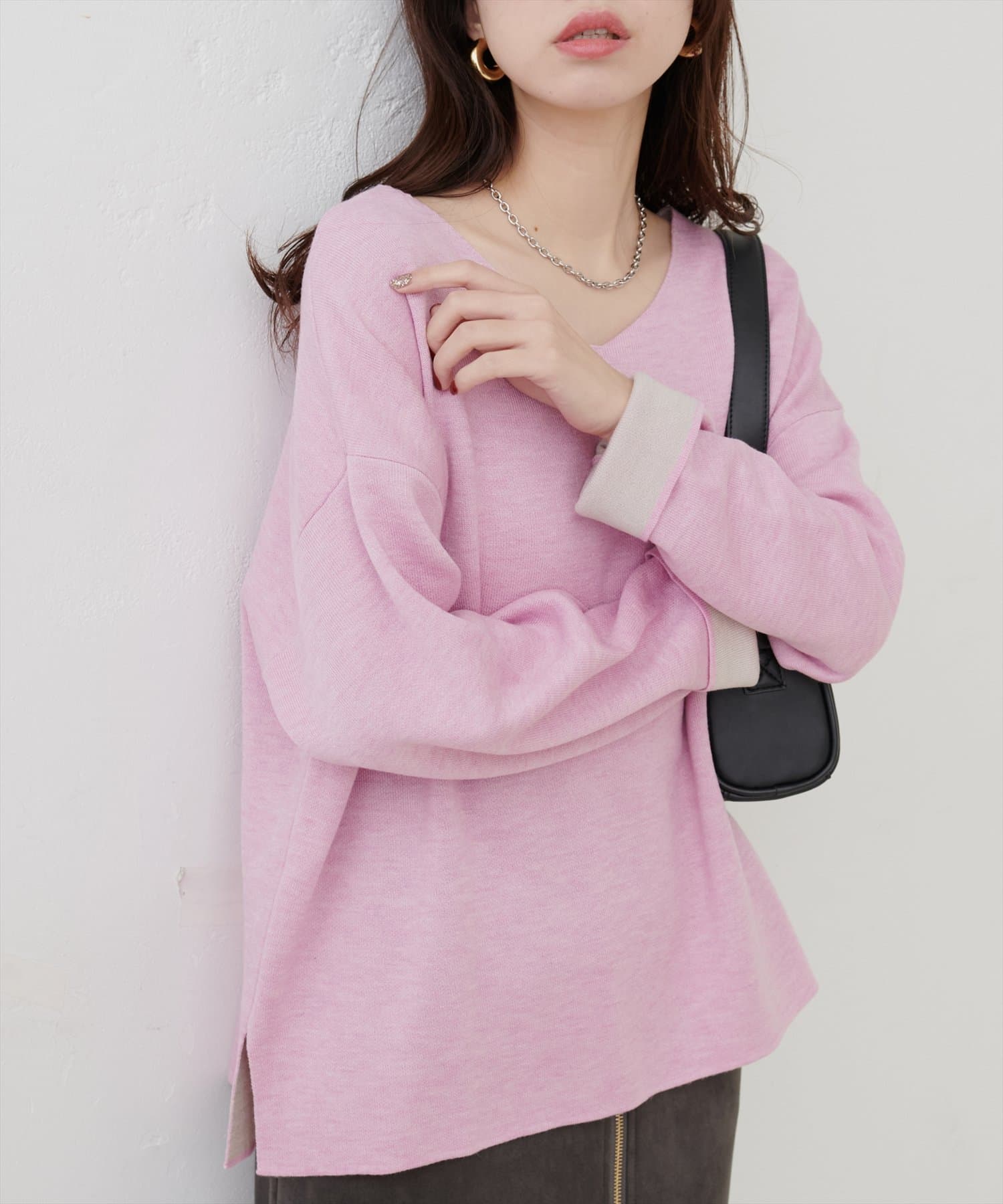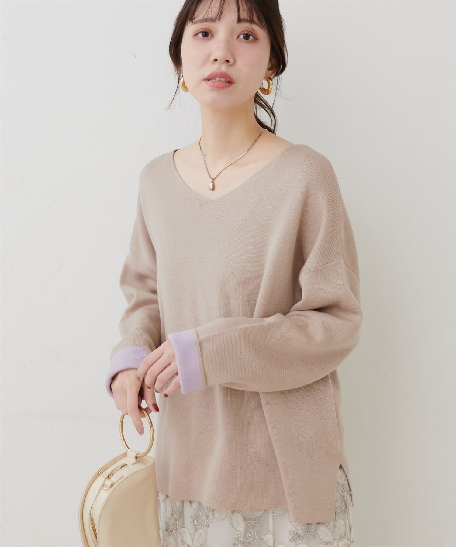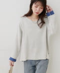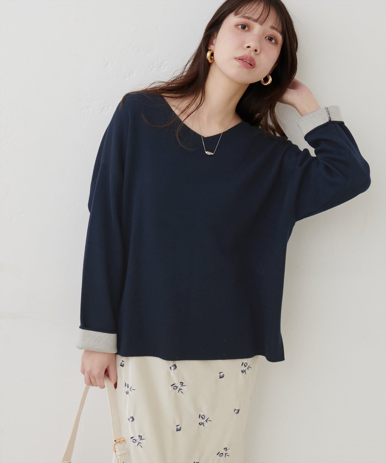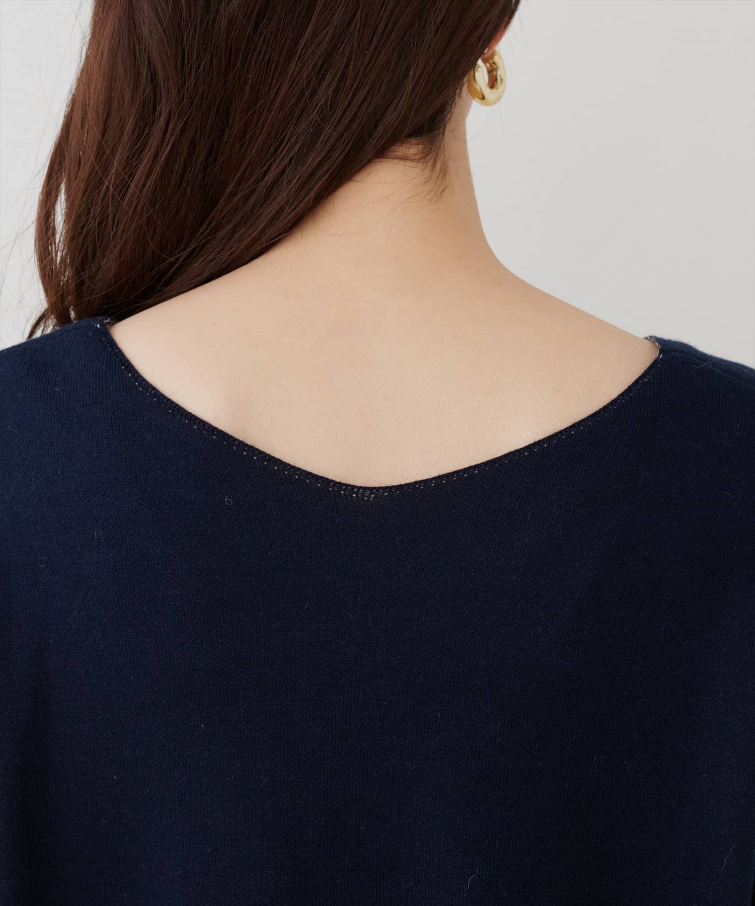 顔まわりをシャープに見せるVネックに、体のラインを拾いすぎないシルエットが重宝する1枚です。
