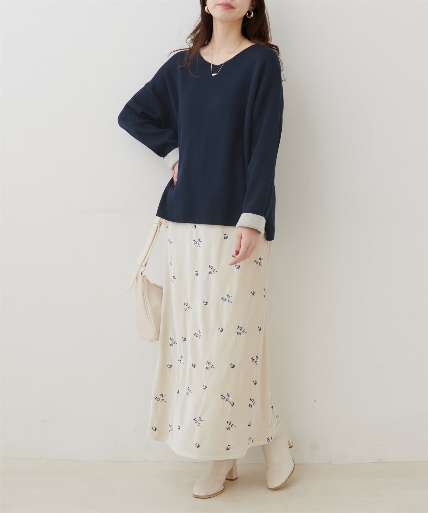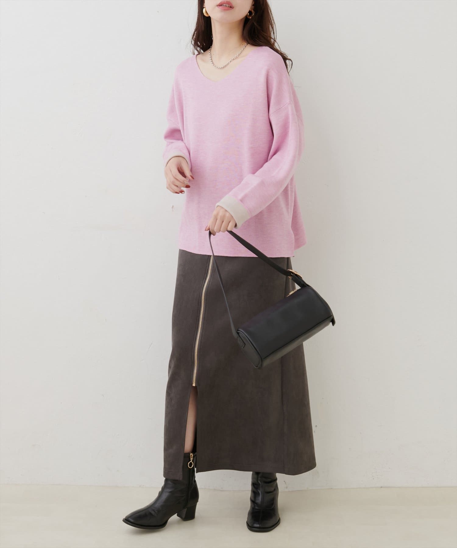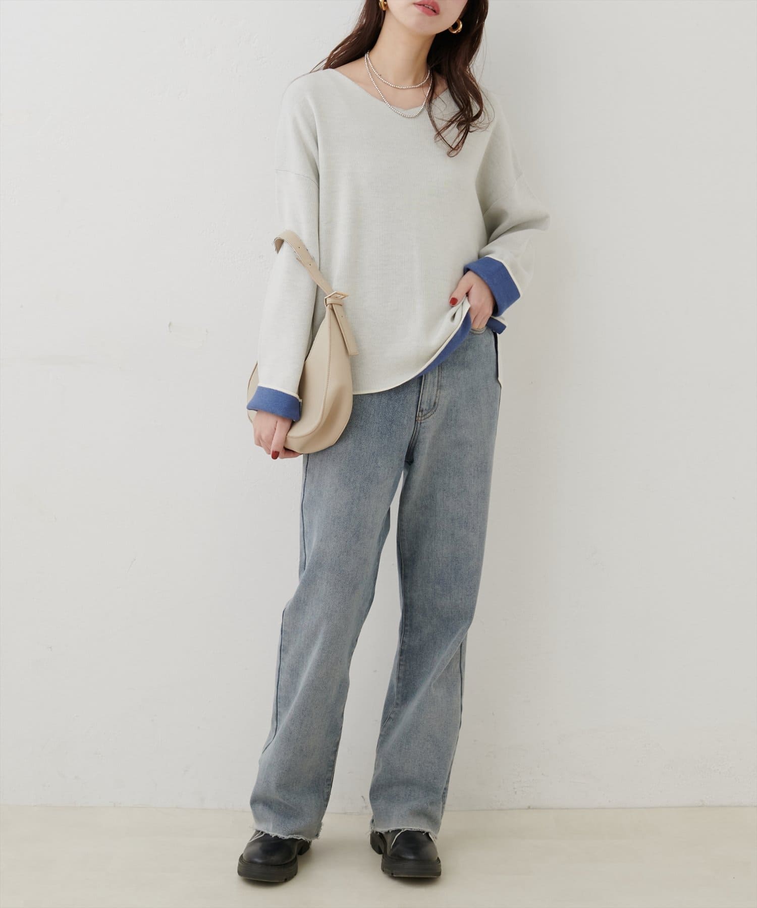 厚地すぎない生地感はハイウエストマーメイドスカートにインもしやすく、よこにスリットがはいっているのでアウトでもおすすめです。
