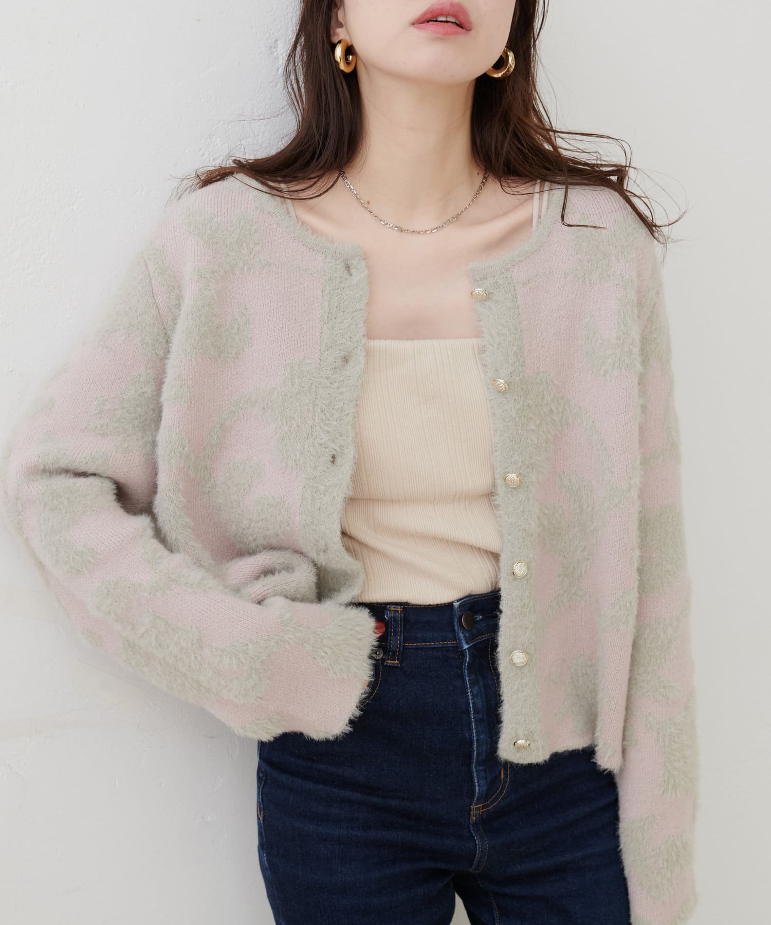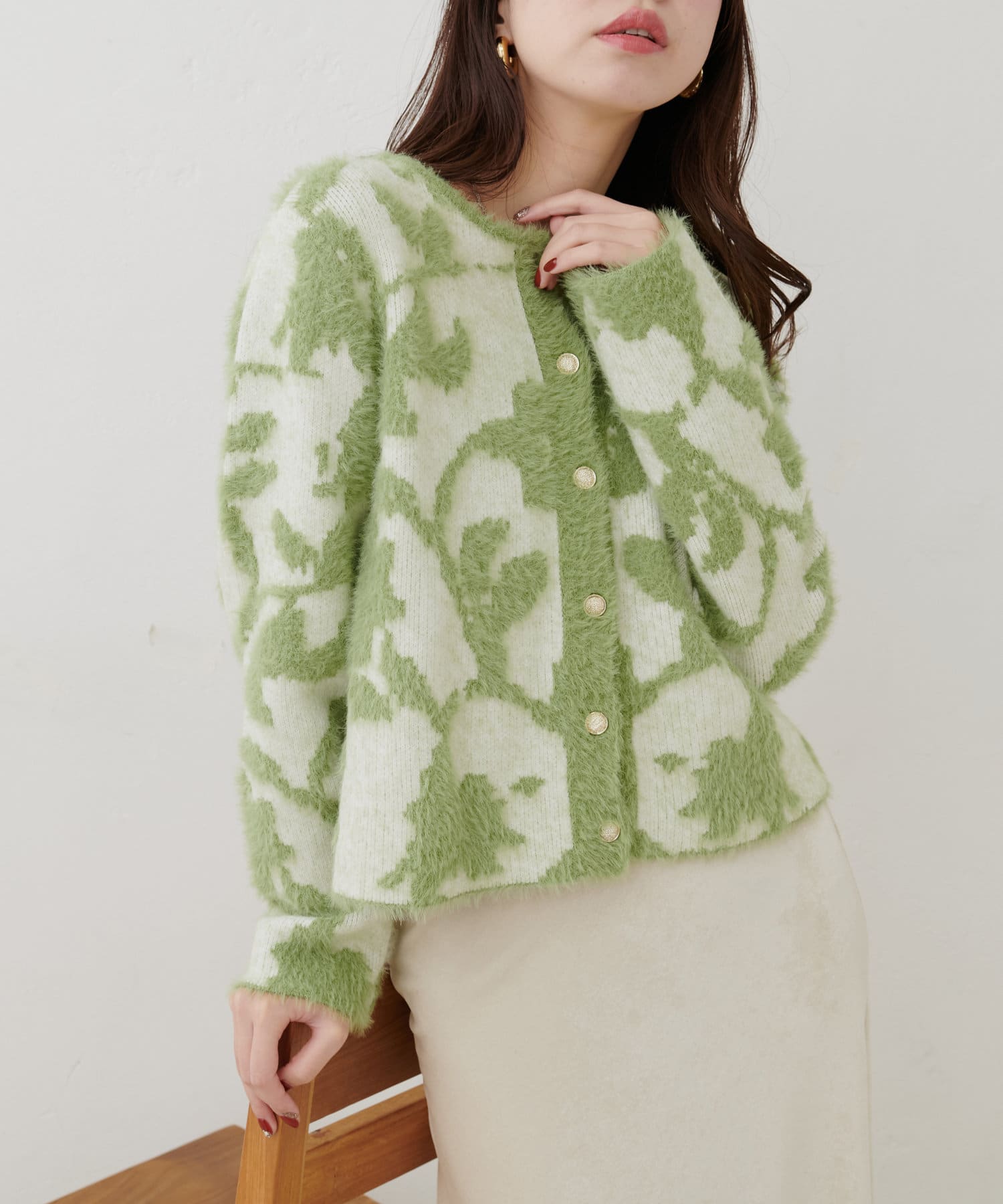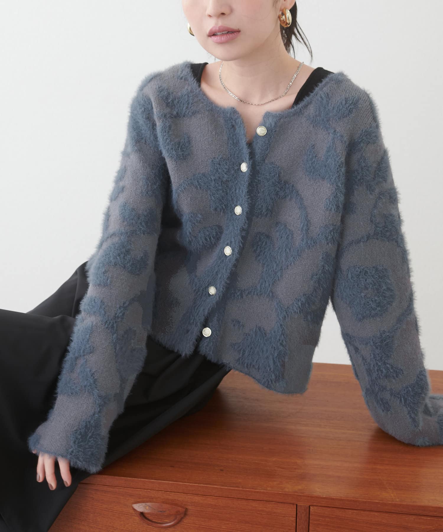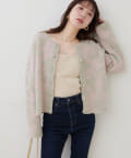 ふわっとしたフェザー素材のニットカーディガン。