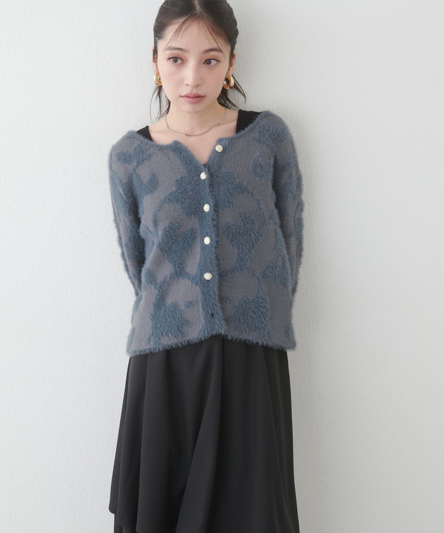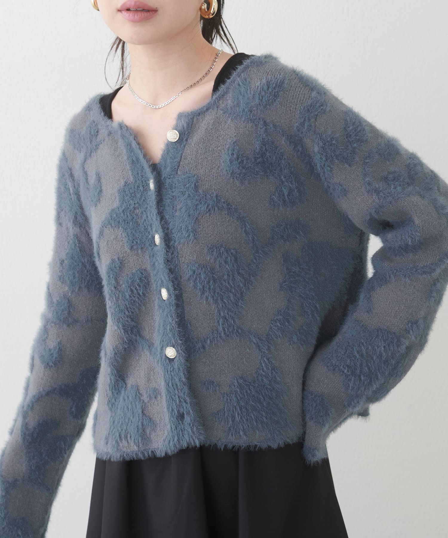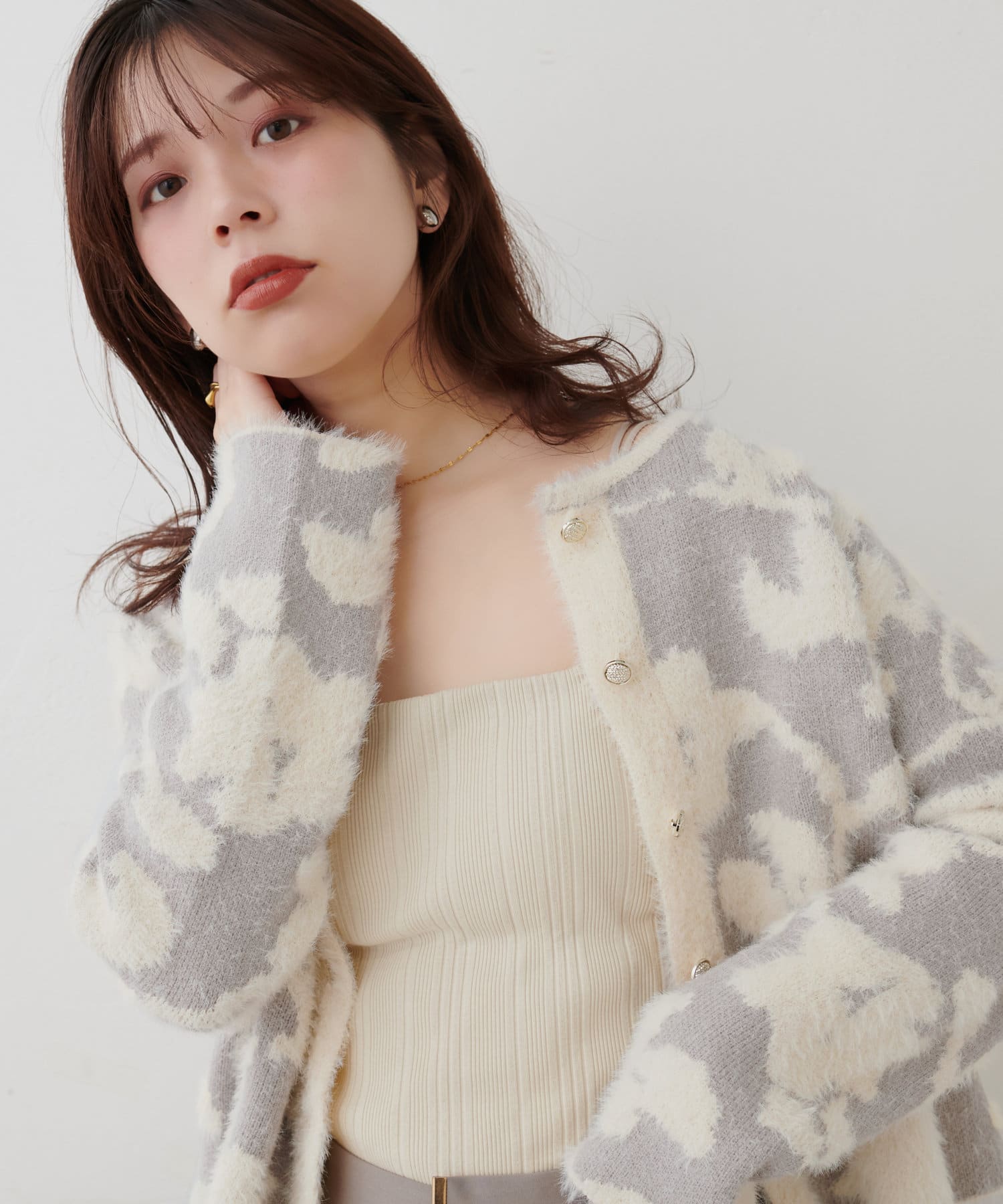 ふわっとしたフェザー素材のニットカーディガン。