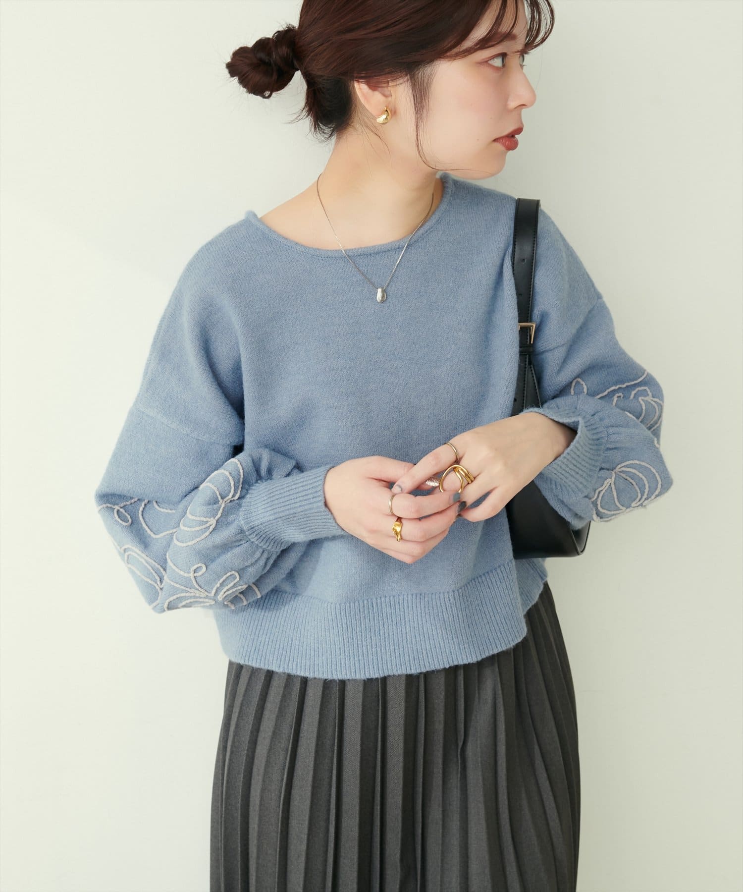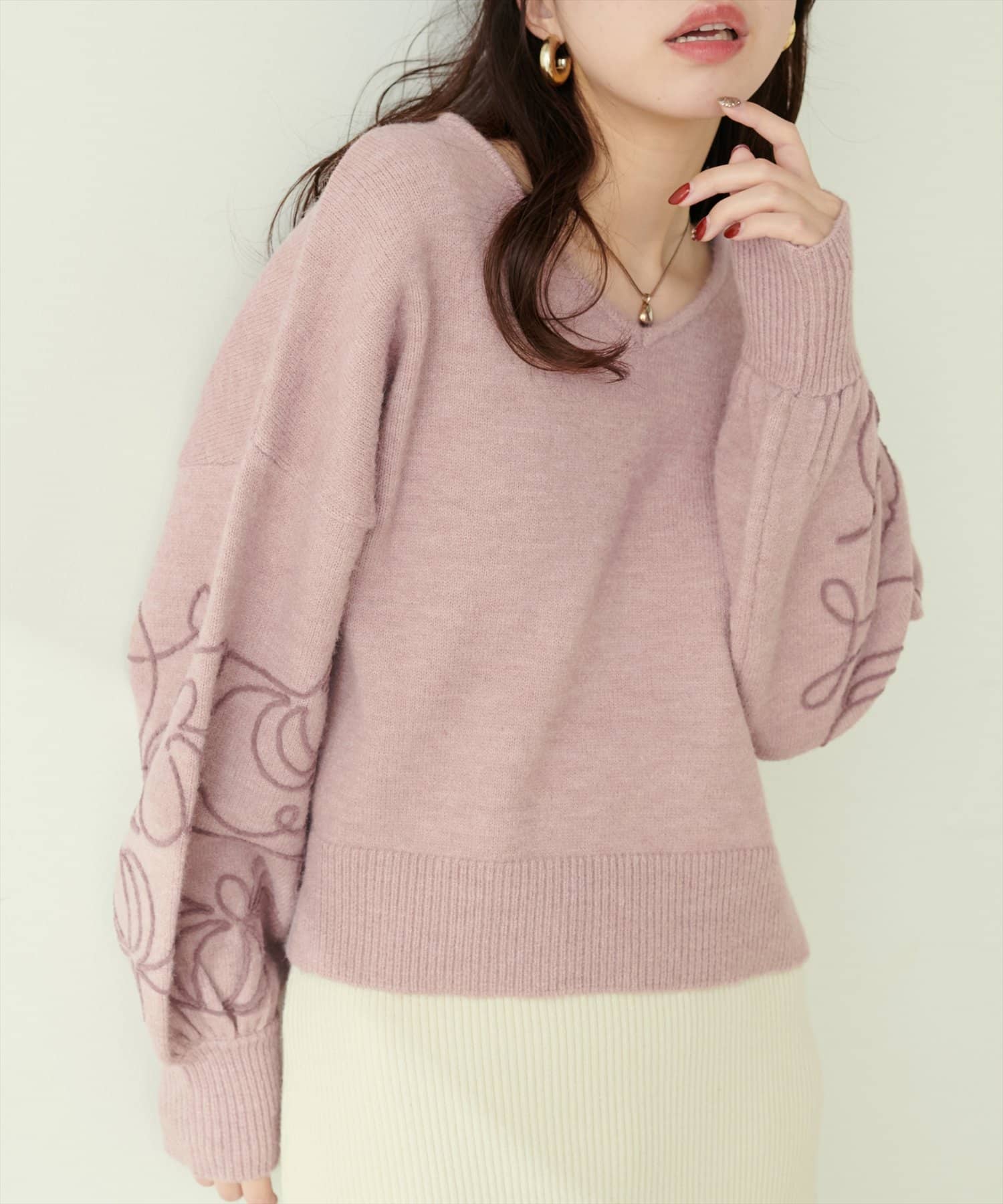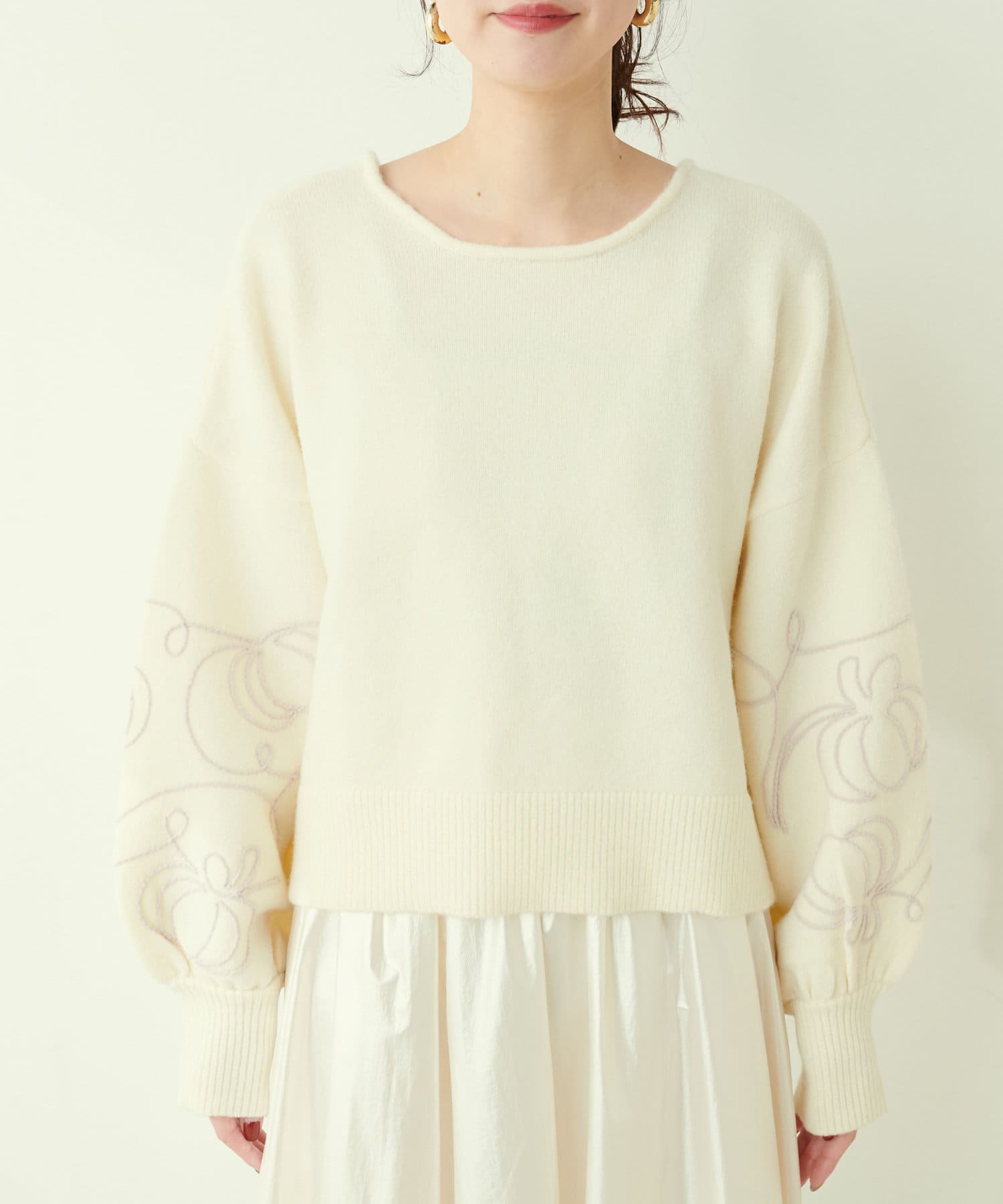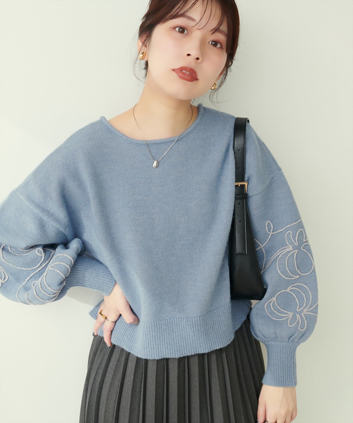 袖の配色モール刺繍が華やかなニットプルオーバー。
