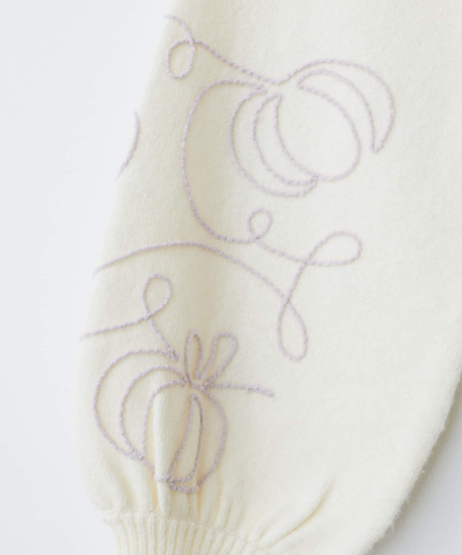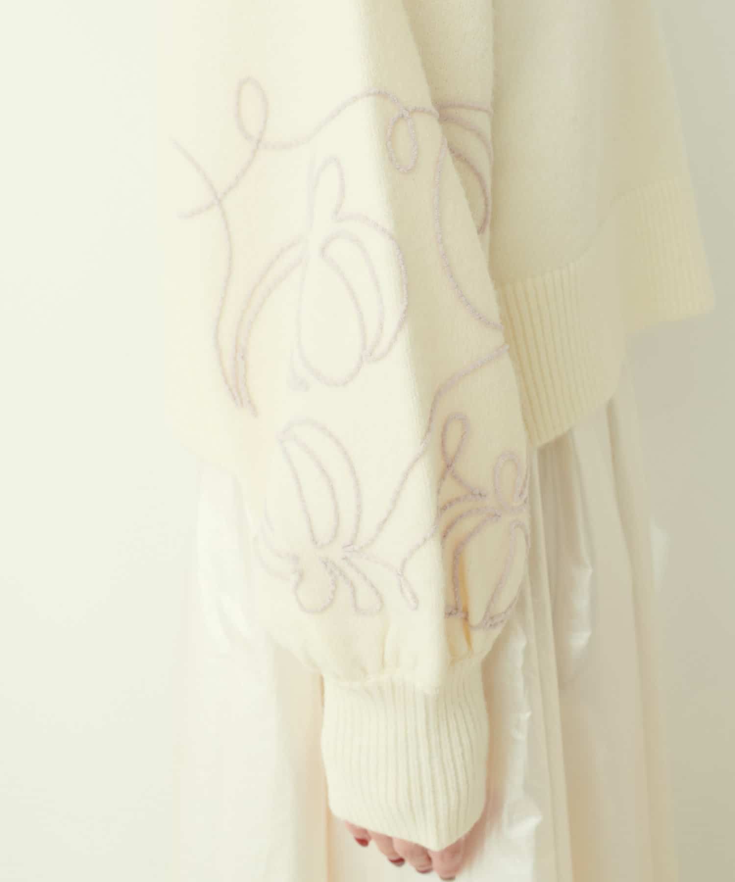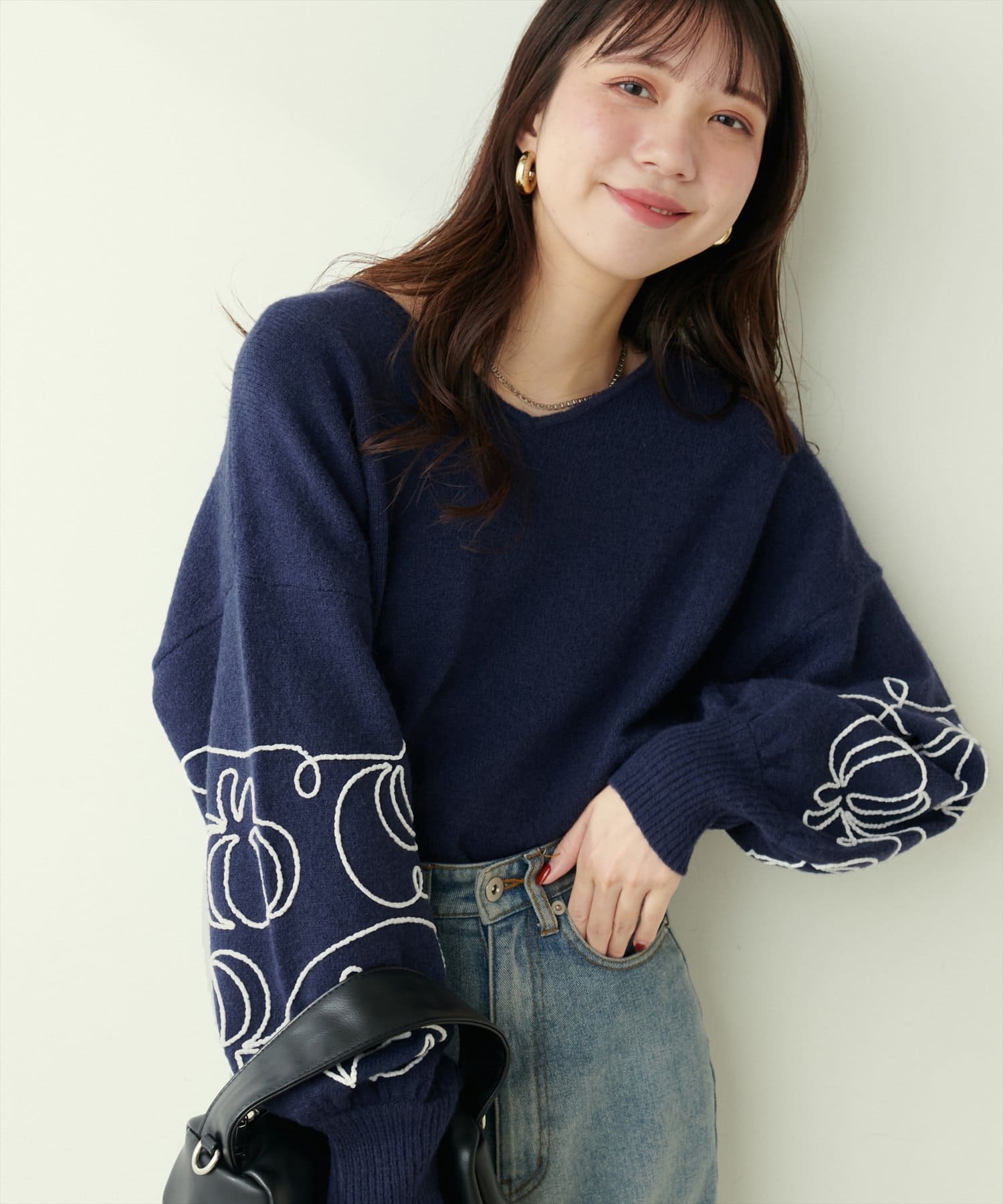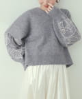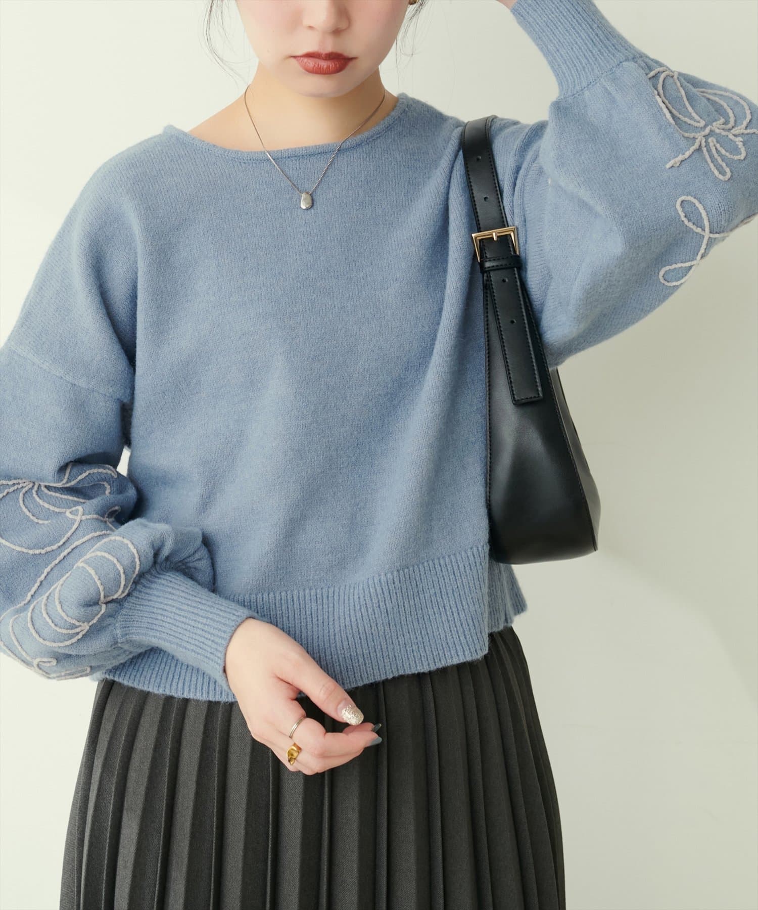 袖の配色モール刺繍が華やかなニットプルオーバー。