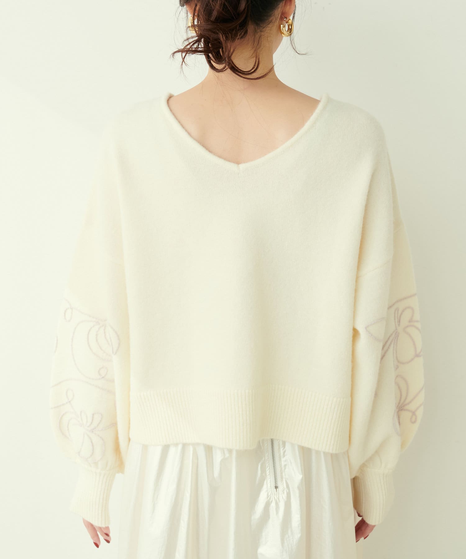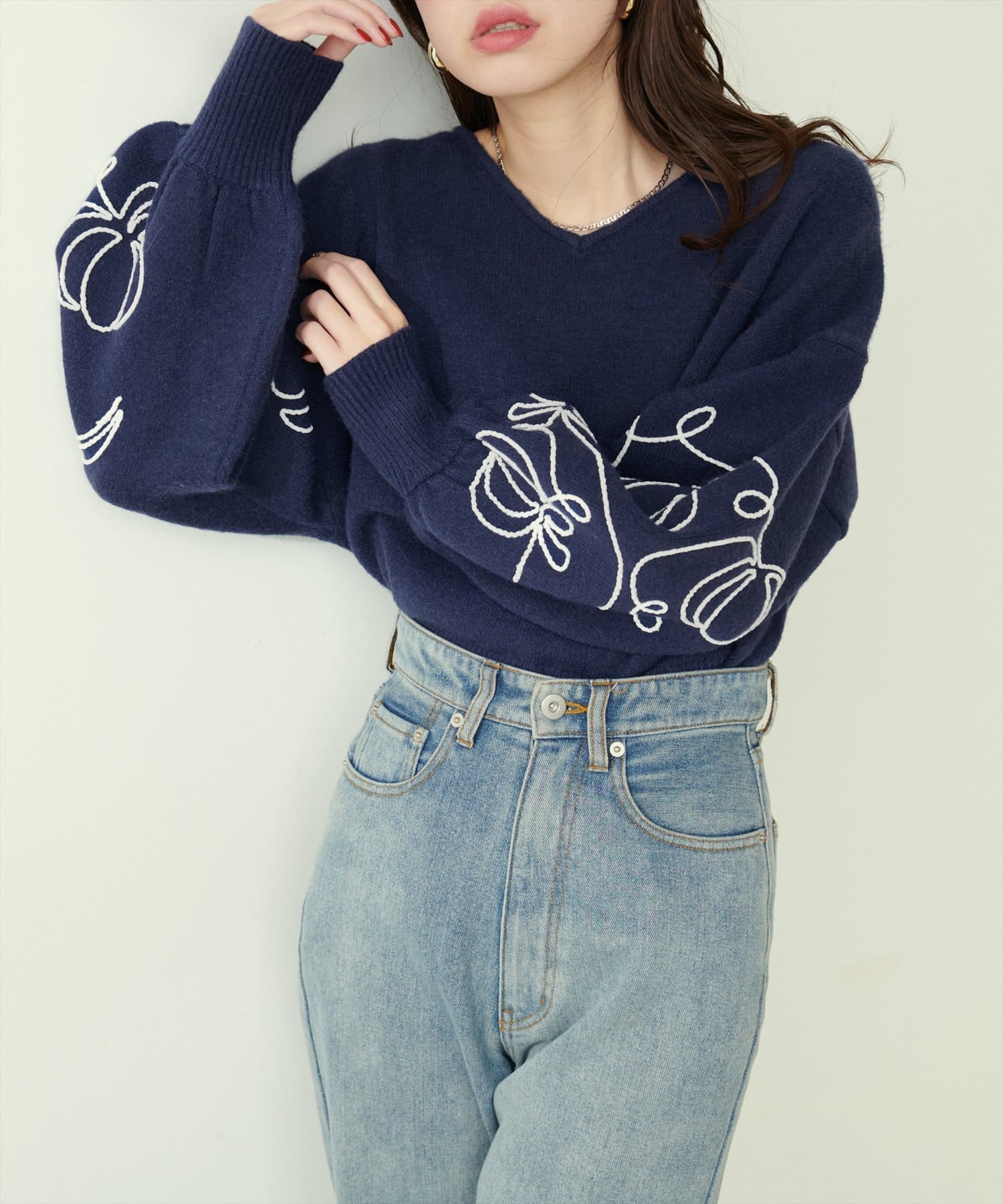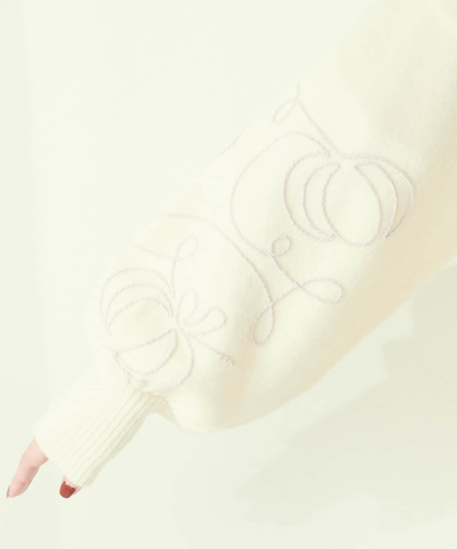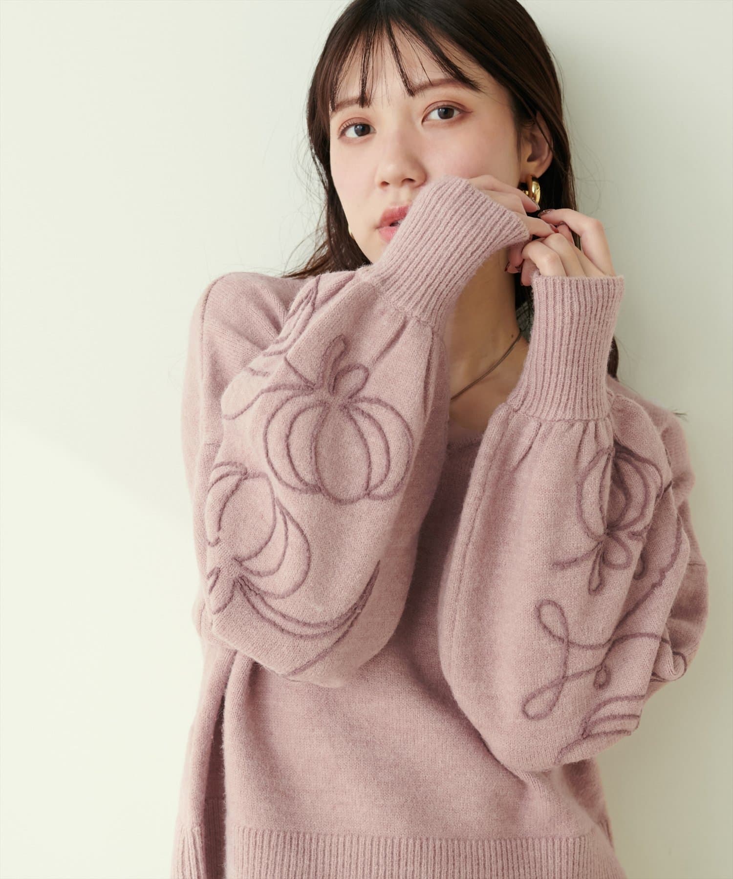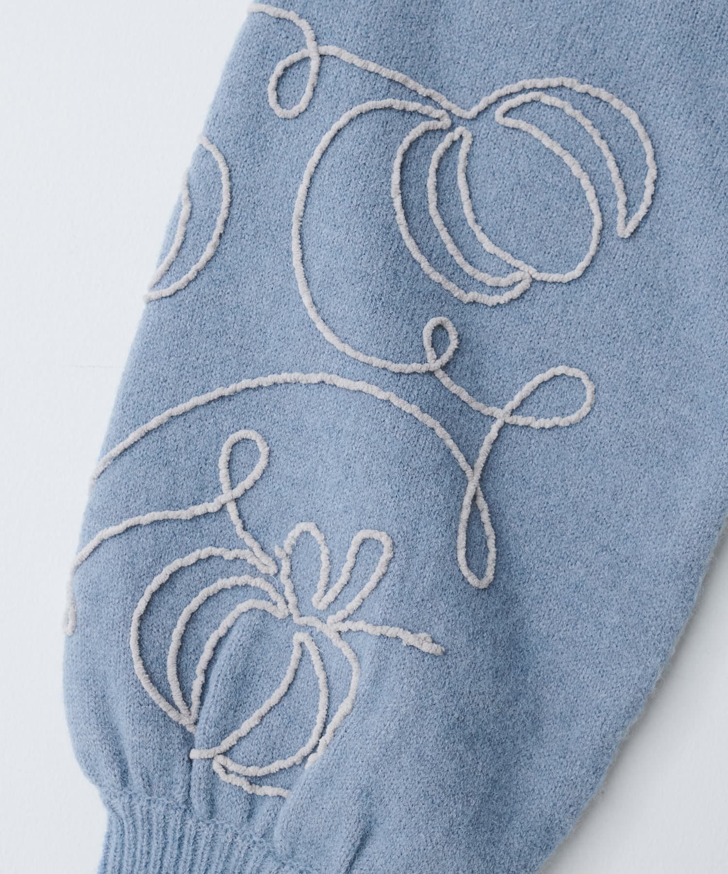 袖の配色モール刺繍が華やかなニットプルオーバー。