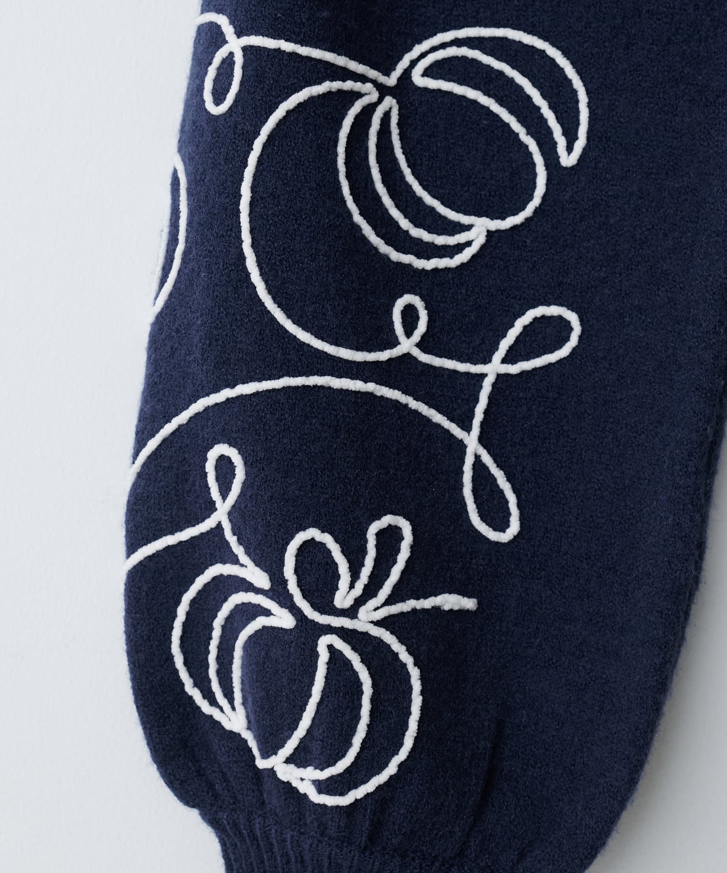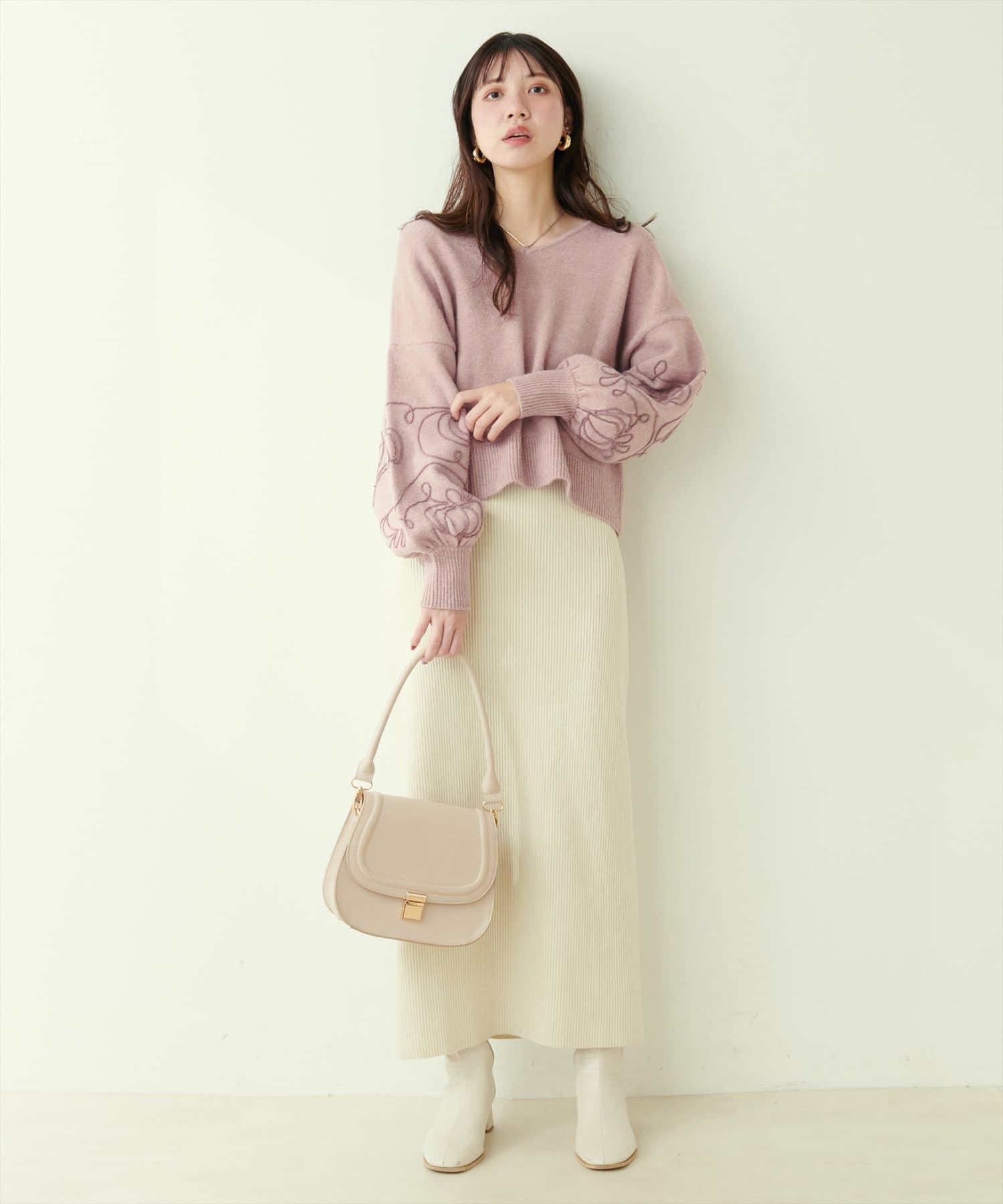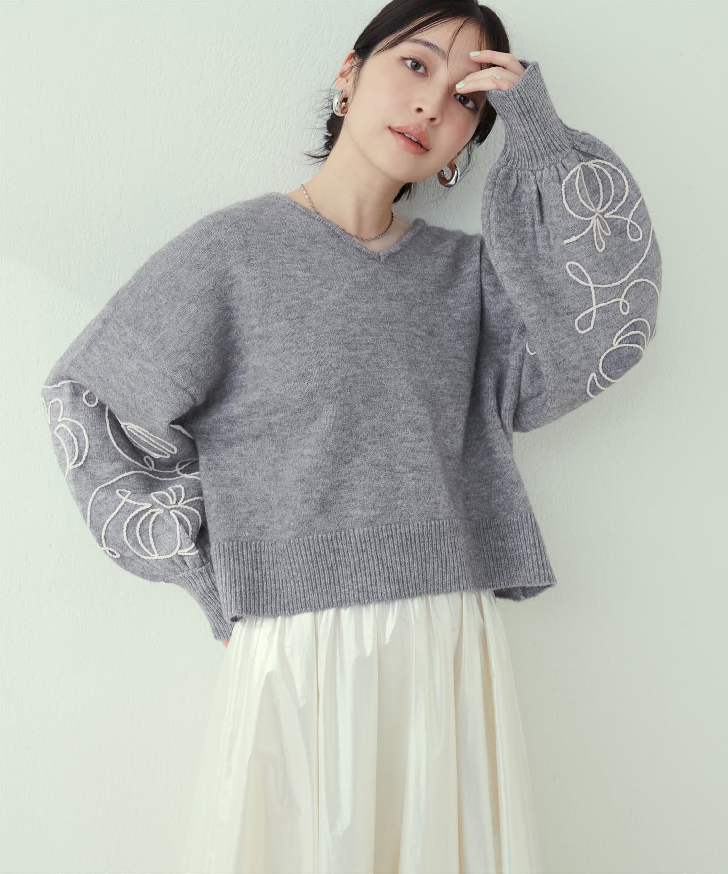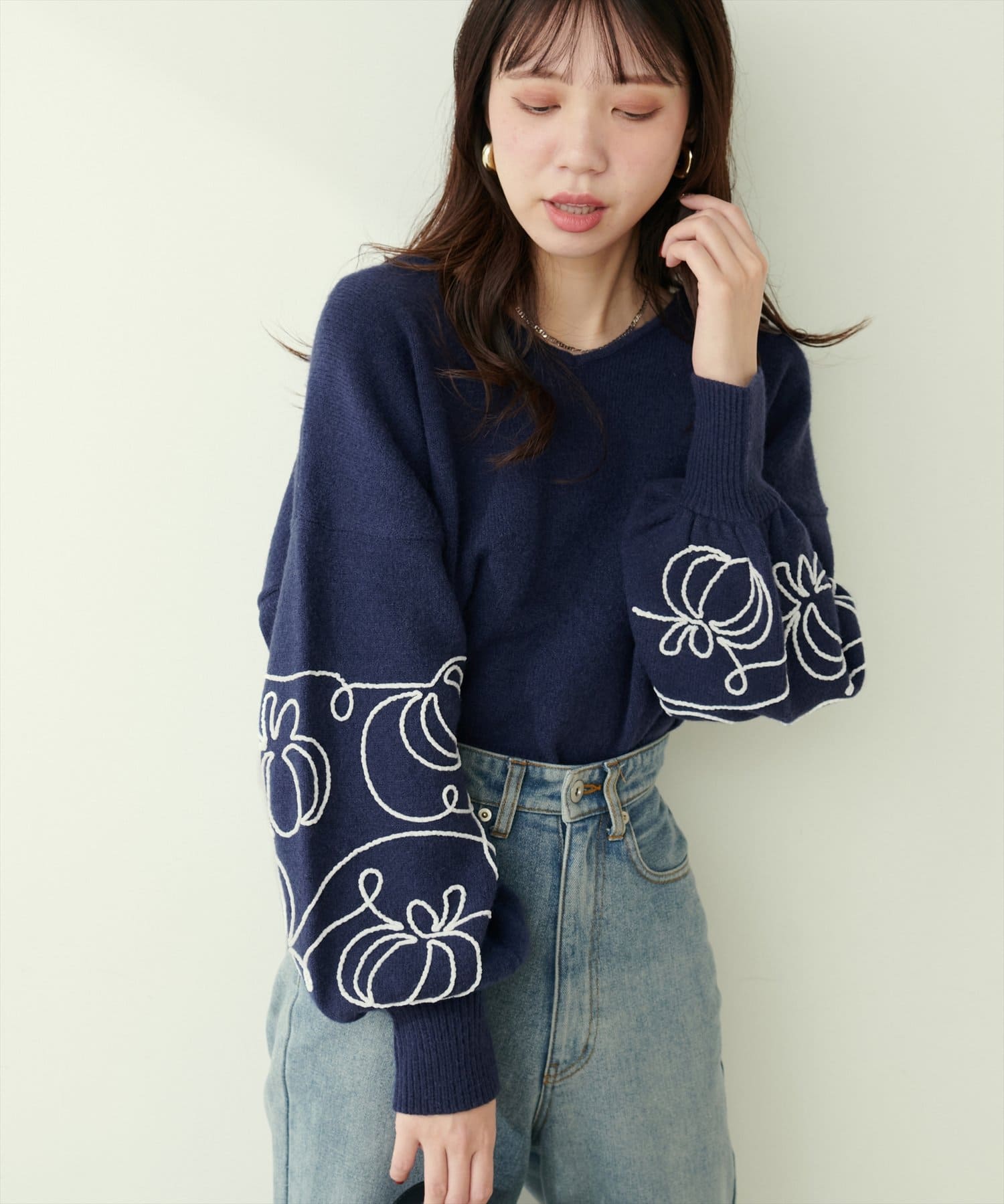 袖の配色モール刺繍が華やかなニットプルオーバー。