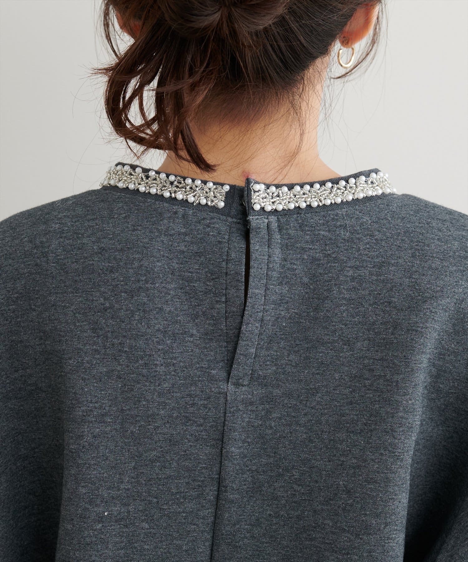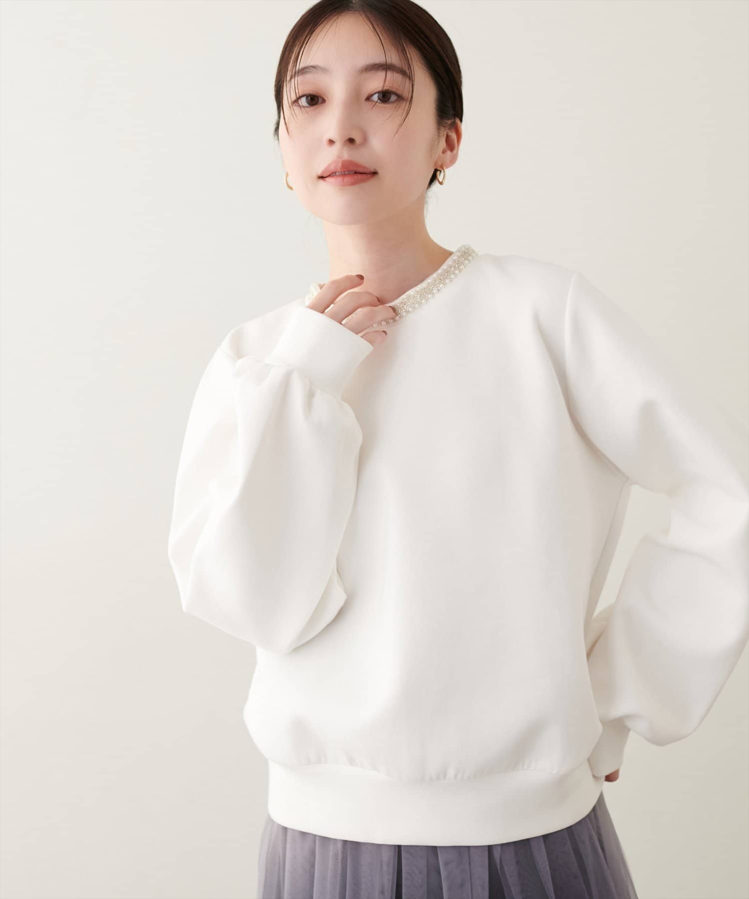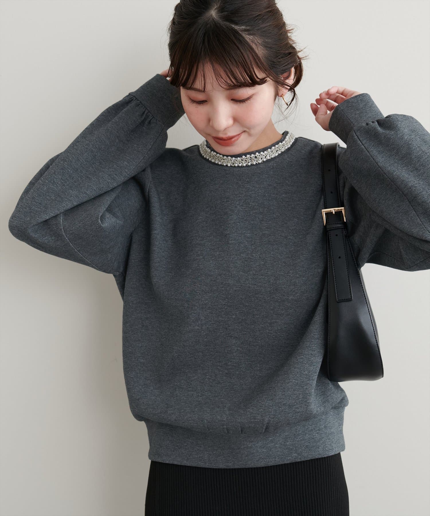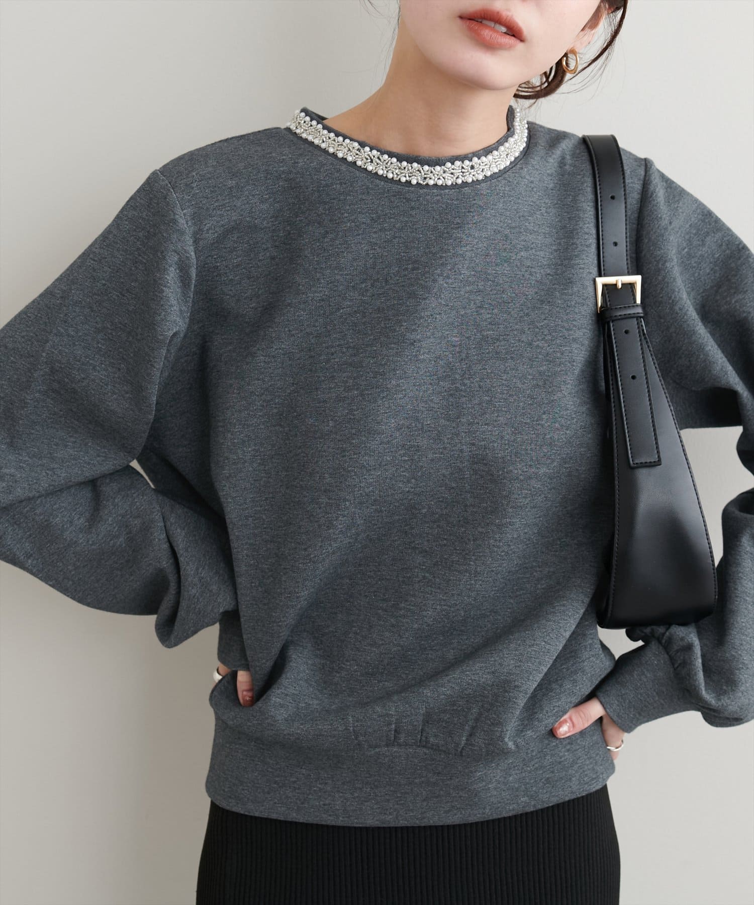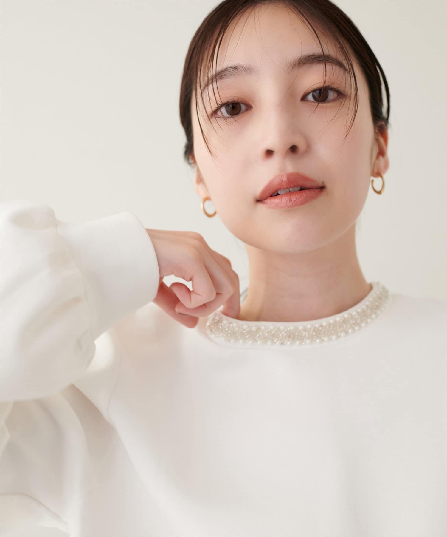シンプルなトップスの衿元にビジューを施し、華やかな印象に。