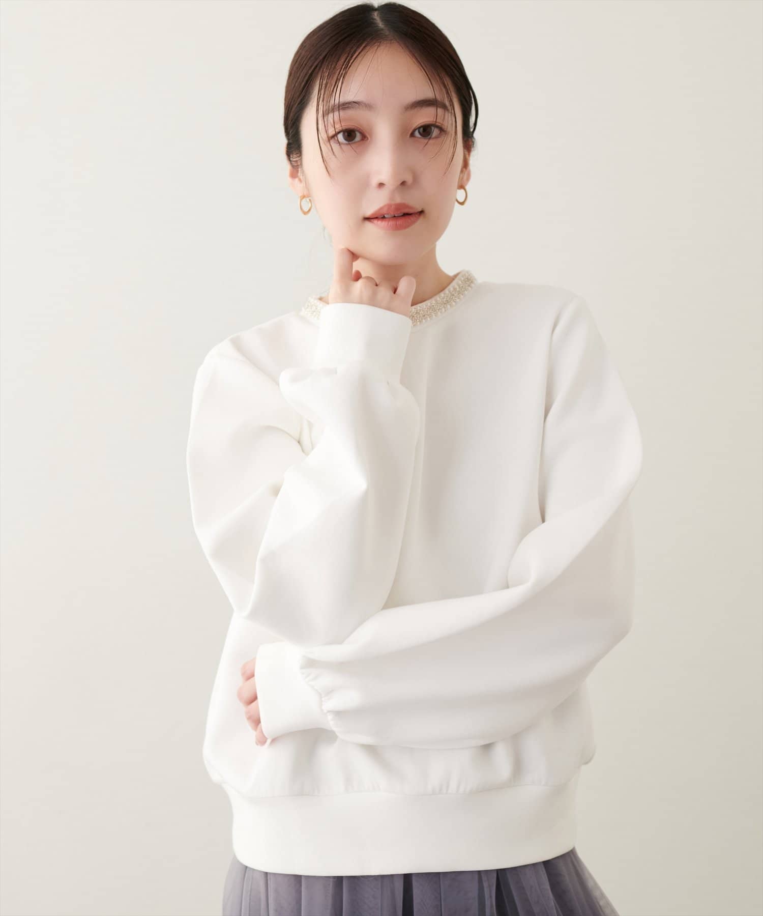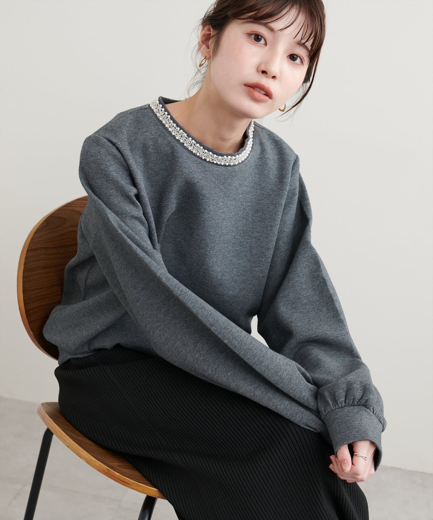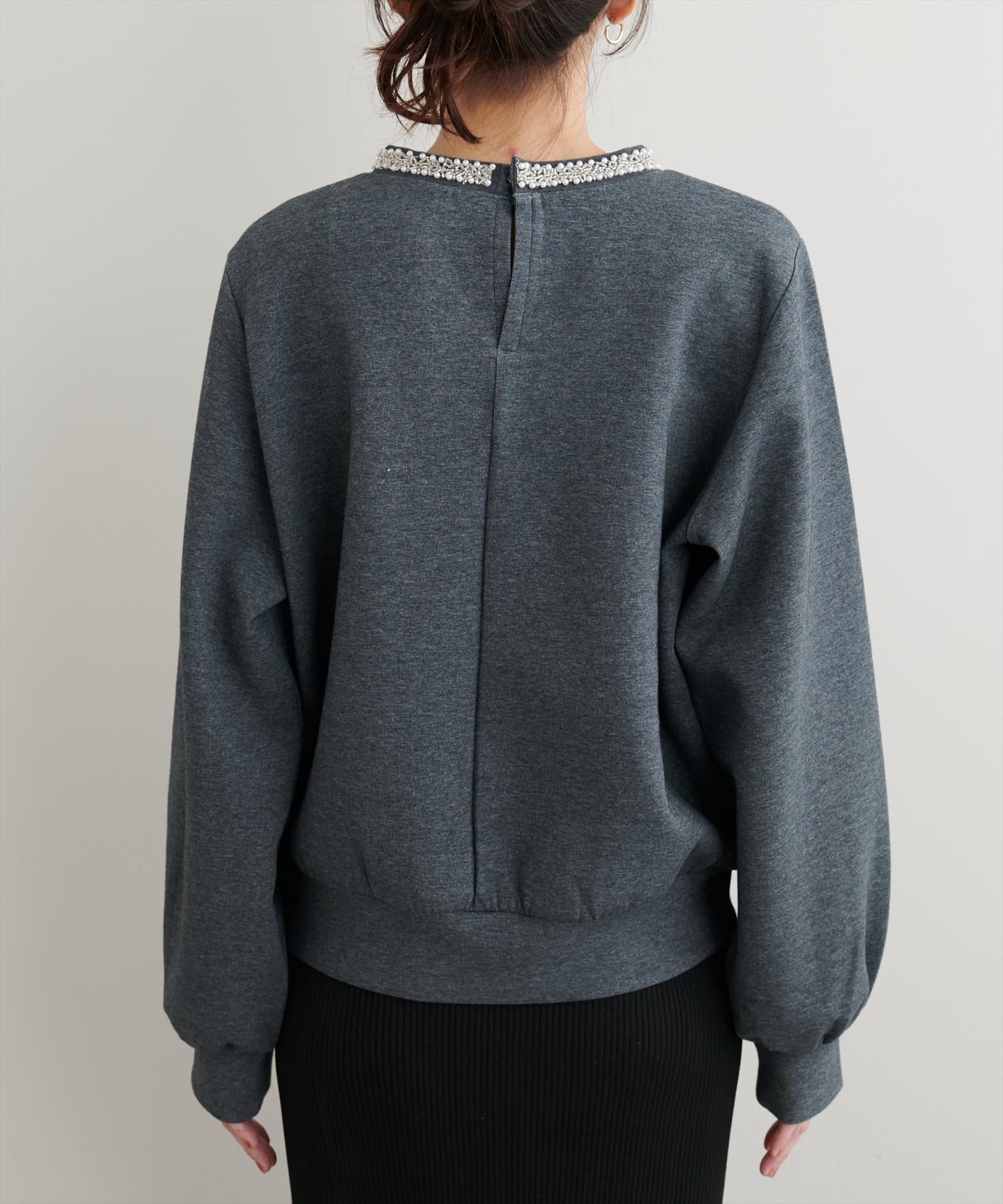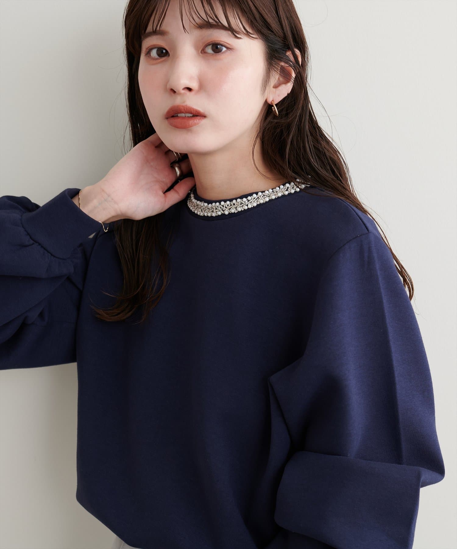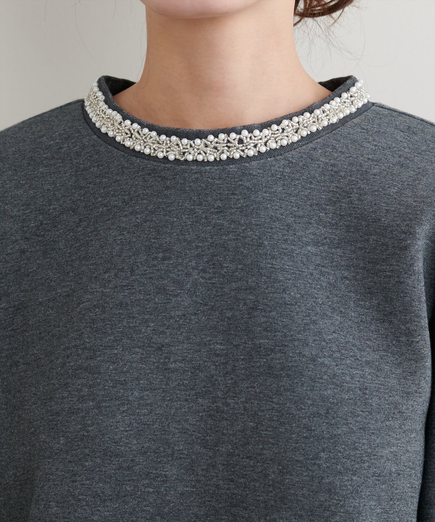 シンプルなトップスの衿元にビジューを施し、華やかな印象に。