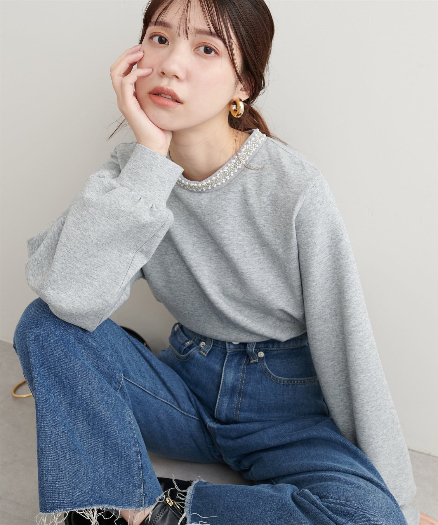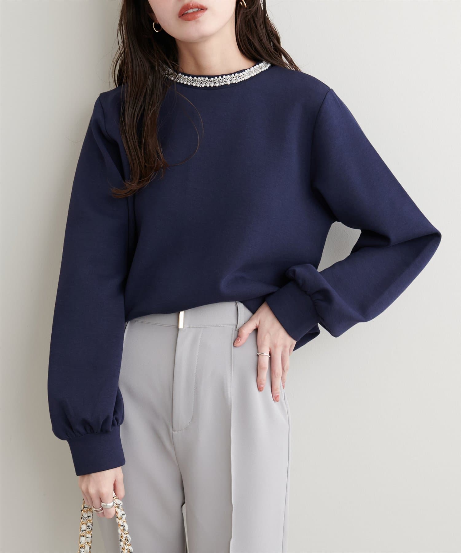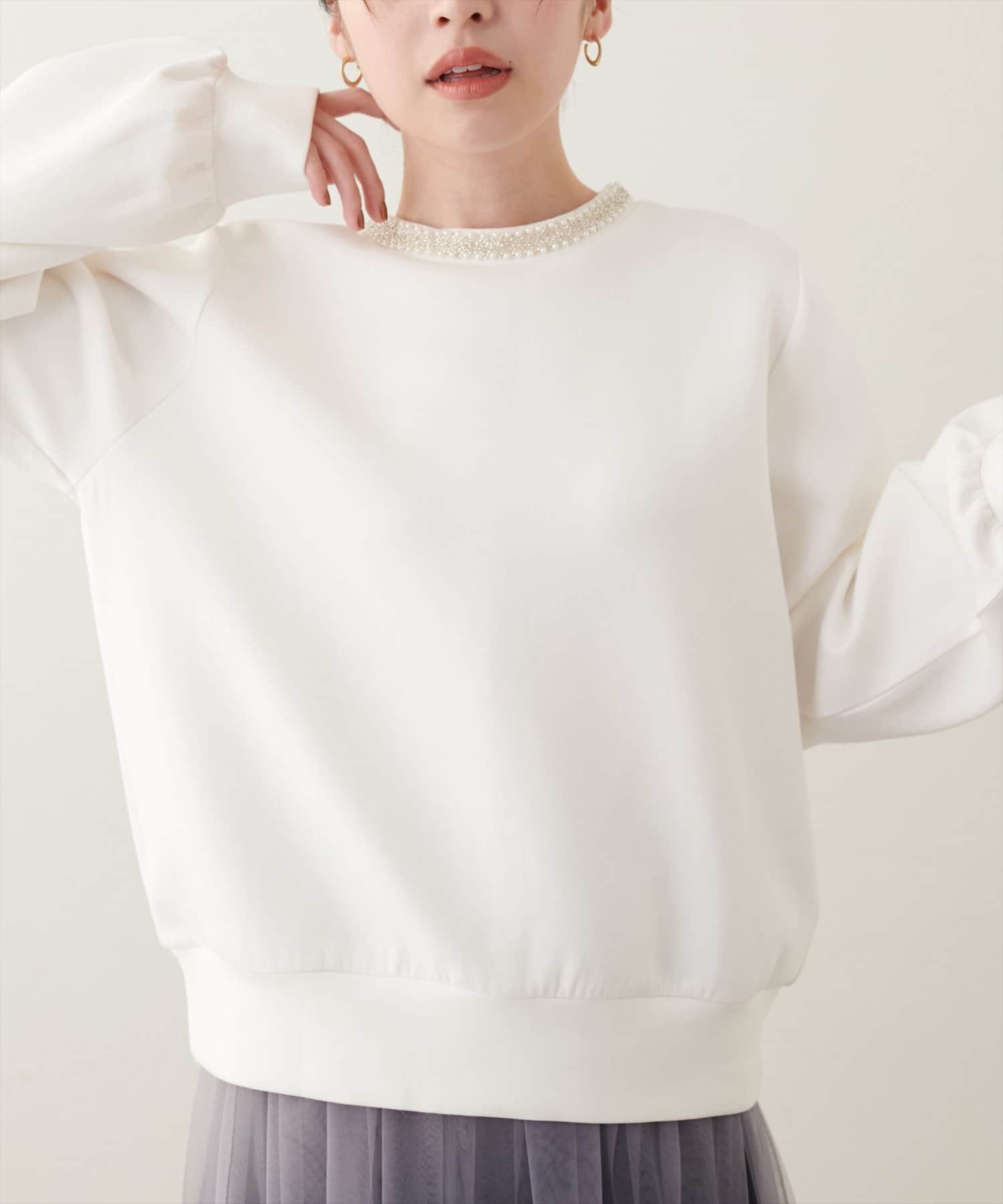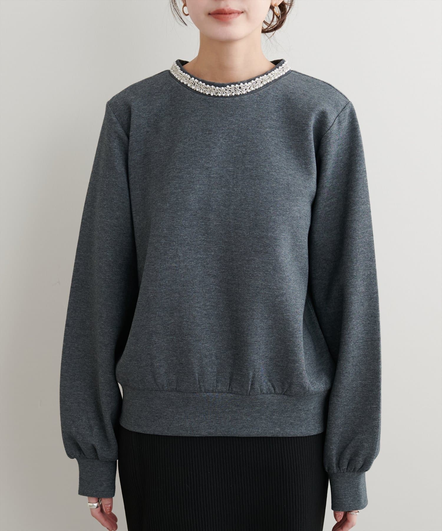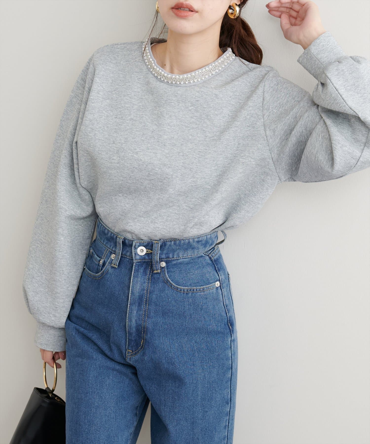 シンプルなトップスの衿元にビジューを施し、華やかな印象に。