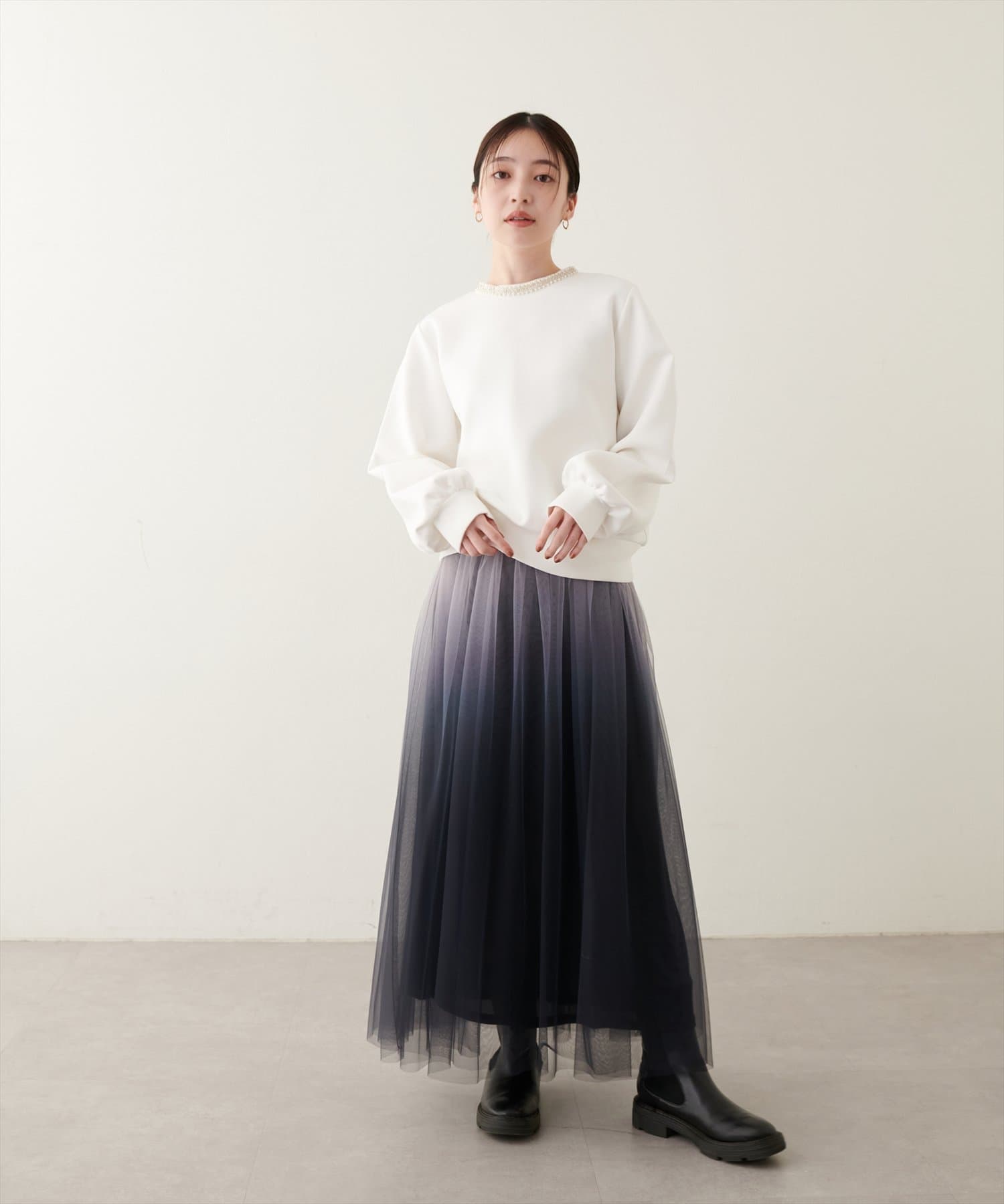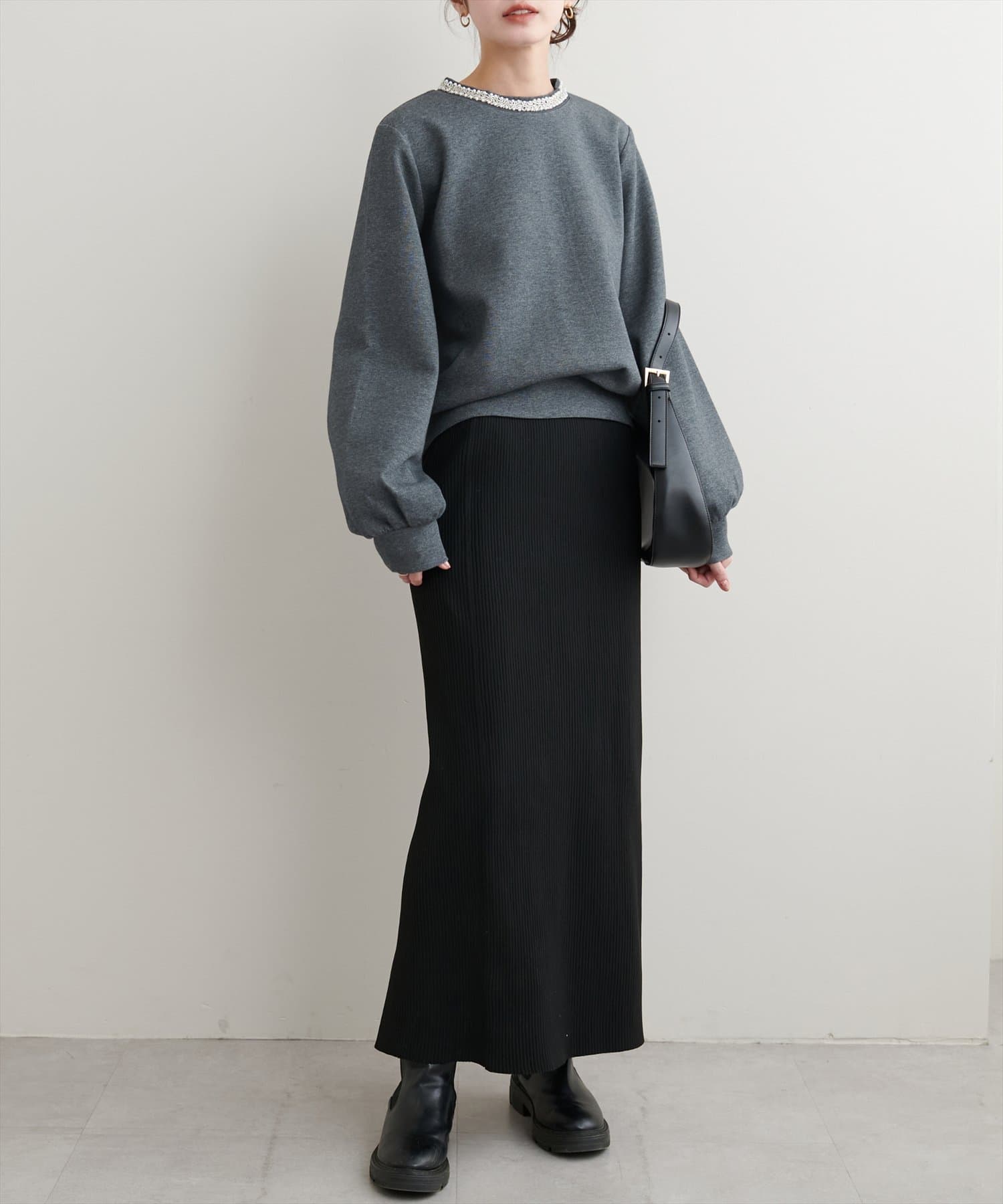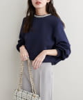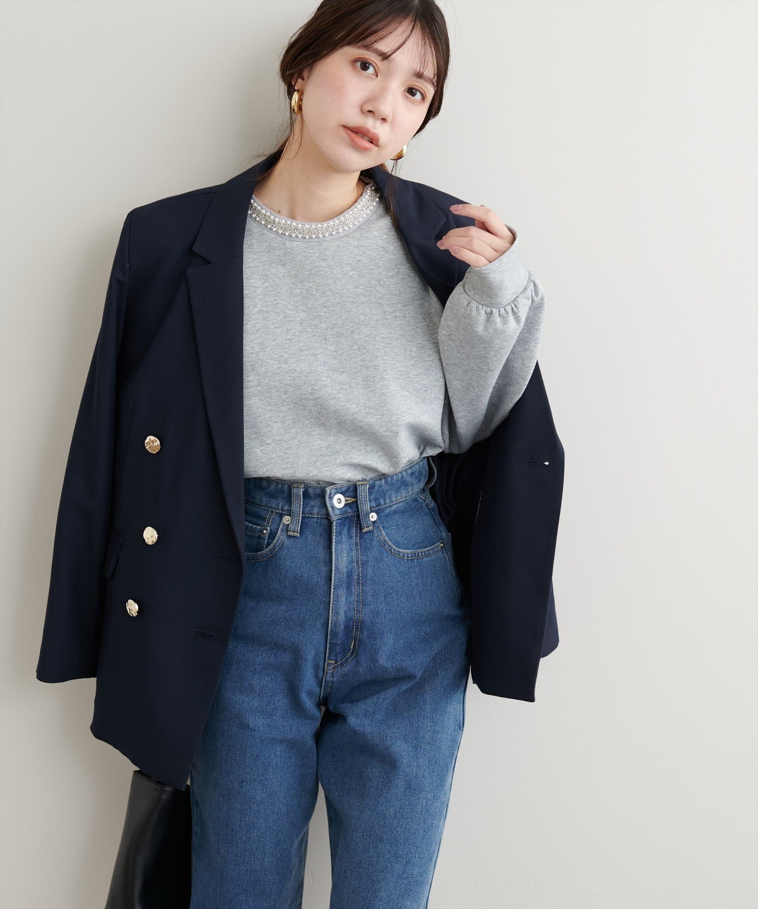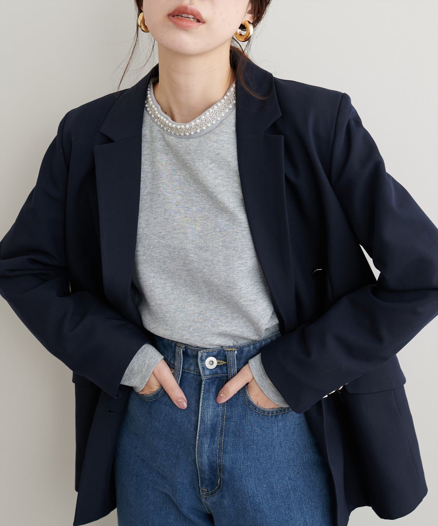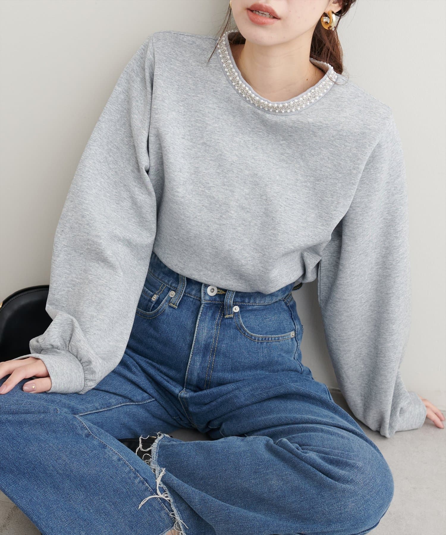 シンプルなトップスの衿元にビジューを施し、華やかな印象に。