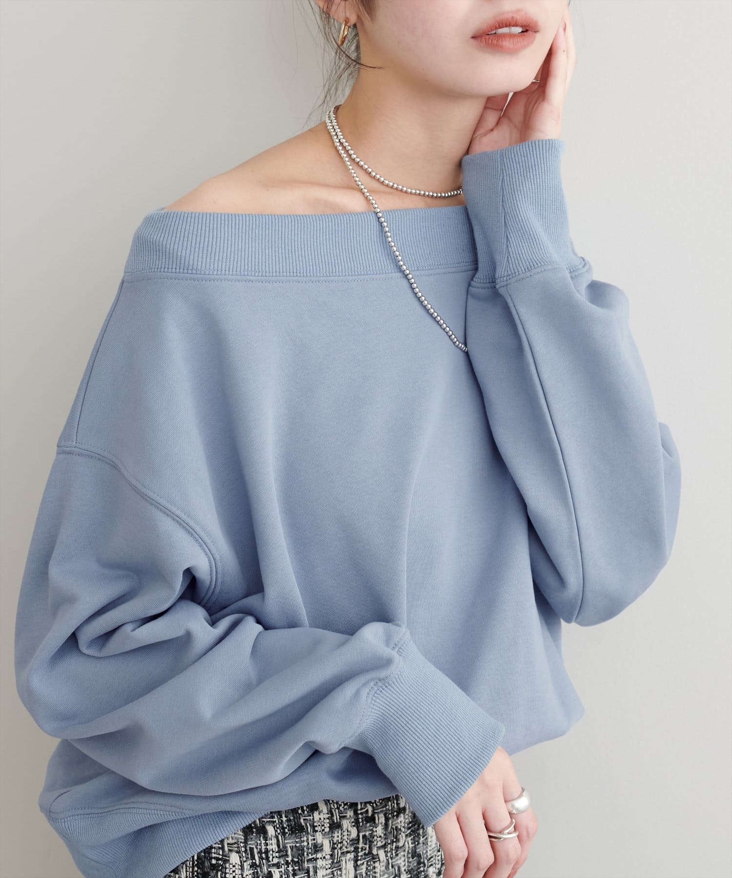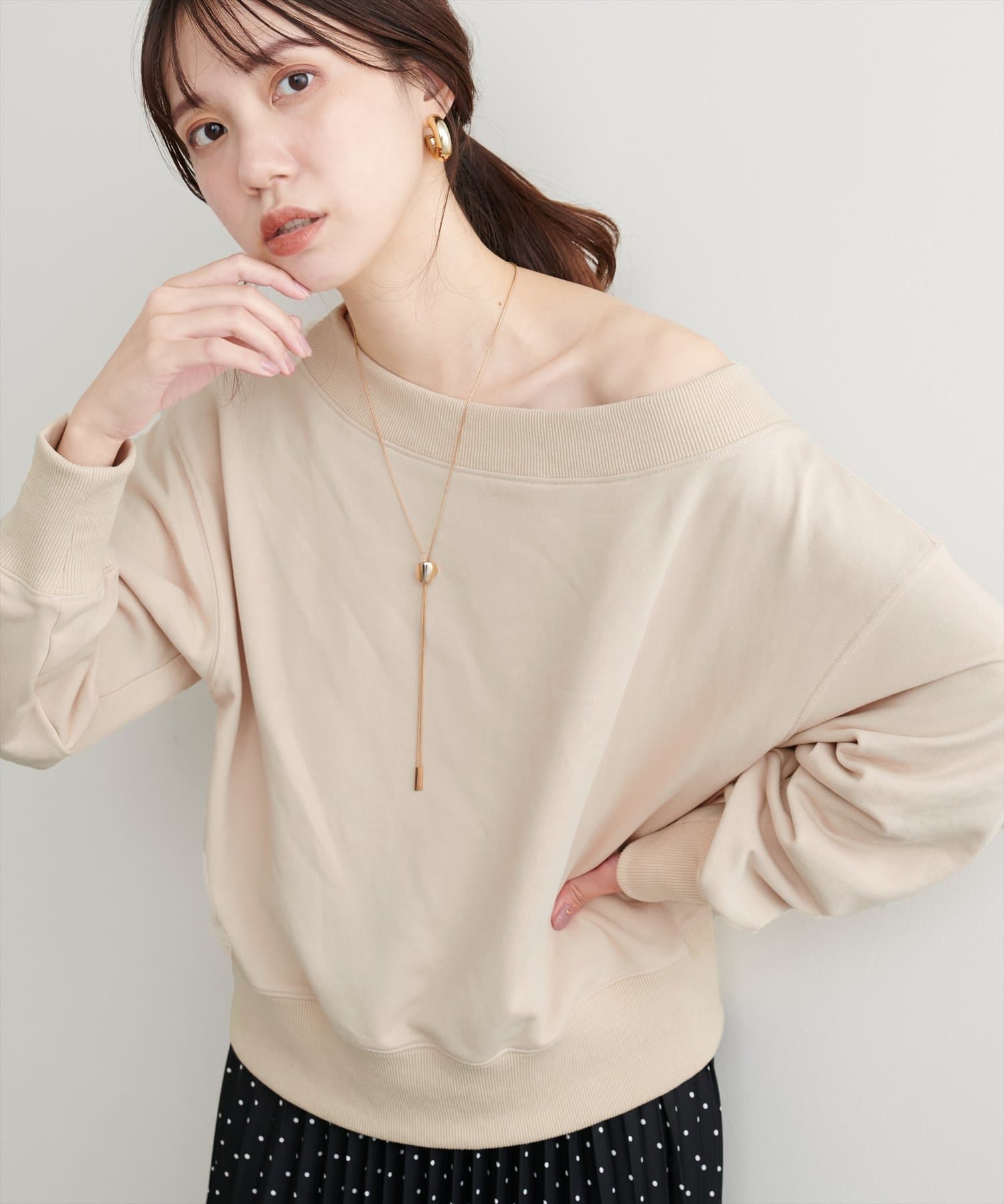 ボートネックの襟ぐりは太めのリブで味のあるデザインに。